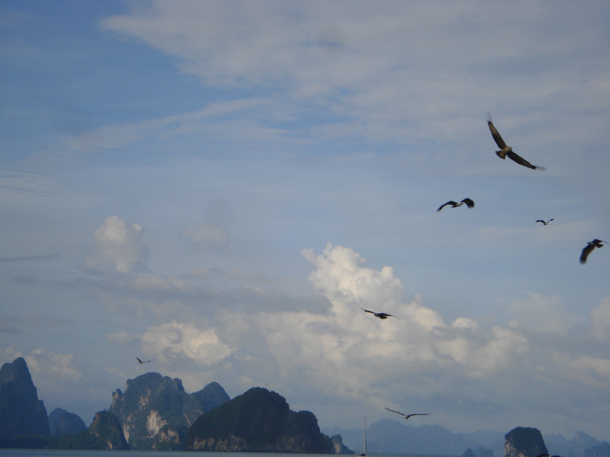 De aici ne întoarcem spre Phuket. Insulele par și mai spectaculoase în lumina apusului. Câțiva membri ai echipajului încep să fluiere foarte puternic. După câteva minute observăm de ce: cheamă pasări – în curând un stol întreg de vulturi ne însoțea în urma vaporului.