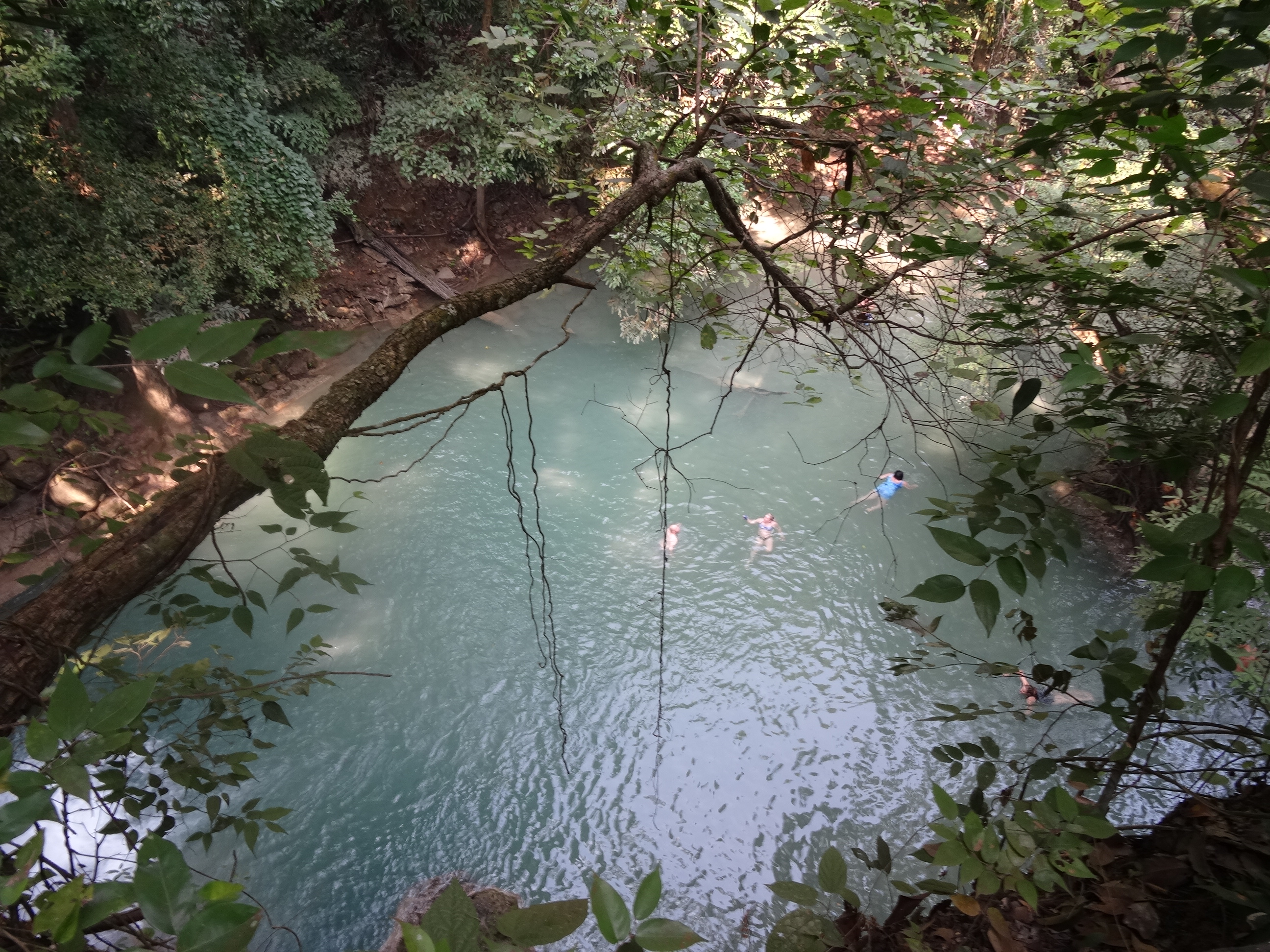 De aici am plecat din nou la drum către Erawan. Era încă dimineață când am ajuns și am început cu un mic dejun la unul din restaurantele turistice de la intrarea în parc. Parcul național Erawan, de asemenea aflat aproape de granița cu Myanmar, este unul din cele mai vizitate din Thailanda iar principala atracție sunt cascadele. E vorba de o serie de cascade, care de care mai spectaculoase, aflate pe mai multe niveluri – mai exact 7. De la parcare am luat o mașinuță de golf care ne-a lăsat în apropiere de primul nivel. Drumul până la ultimul nivel durează peste o oră. Fiecare este diferit și fiecare cascadă are o frumusețe aparte. Noi am ajuns doar până la nivelul 6 de unde ne-am întors pentru că nu mai rezistam să nu facem o baie. Am încercat mai multe piscine naturale sub cascade, nivelurile superioare fiind mai preferabile pentru că nu sunt prea aglomerate. Rușii (de departe străinii majoritari) se opresc de obicei pe la primele. Ne-am cățărat pe stânci, am făcut baie sub cascade, am înotat printre pești… E un loc superb despre care cred că doar imaginile pot vorbi mai mult.