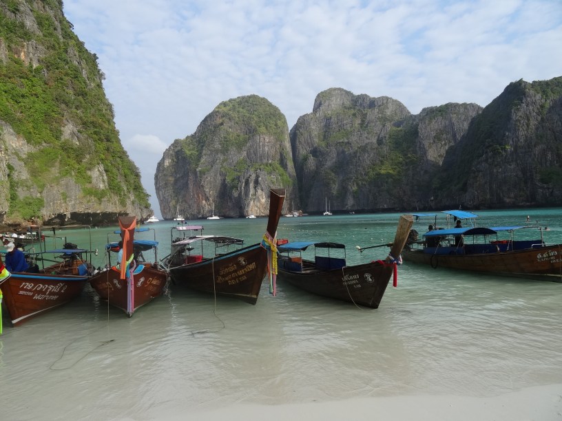 Dimineața următoare am închiriat o barcă cu motor și am plecat spre Phi Phi Leh. Leh este o insulă micuță și nelocuită – fiind rezervație naturală protejată de guvernul thailandez. Aici se află golful Maya adică renumita plajă din filmul The Beach. Turiștii nu pot rămâne peste noapte aici, dar și așa golful este extrem de aglomerat de vapoare care aduc valuri și valuri de vizitatori. Ca să mai evitam din mulțime am plecat dimineața imediat după răsărit. Dacă în film ei au înotat pana acolo, noi am mers cu o mică barcă cu motor, cu un „căpitan” care nu vorbea o iotă de engleza și am țopăit serios pe valuri vreo 20 de minute pana am ajuns.