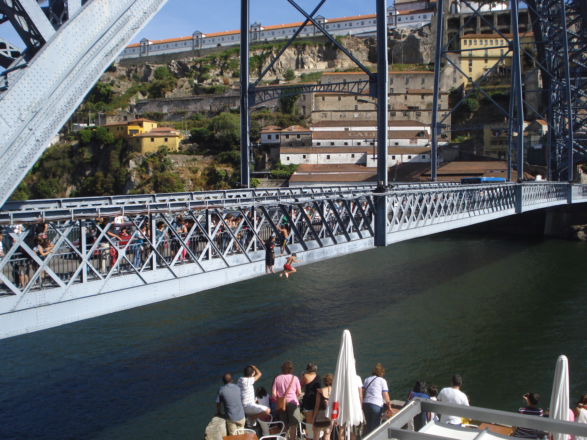 Am luat apoi cu funicularul Guindais și am revenit pe malul superior unde o grămadă de turiști erau adunați să-i vadă pe copiii din oraș care se întreceau să sară de pe pod direct în râu de la zeci de metri înălțime. Pe cât de mici, pe atât de curajoși – copiii strigau puternic, se aruncau și ieșeau apoi din apă puțin debusolați și fugeau repede înapoi sus că să sară din nou.