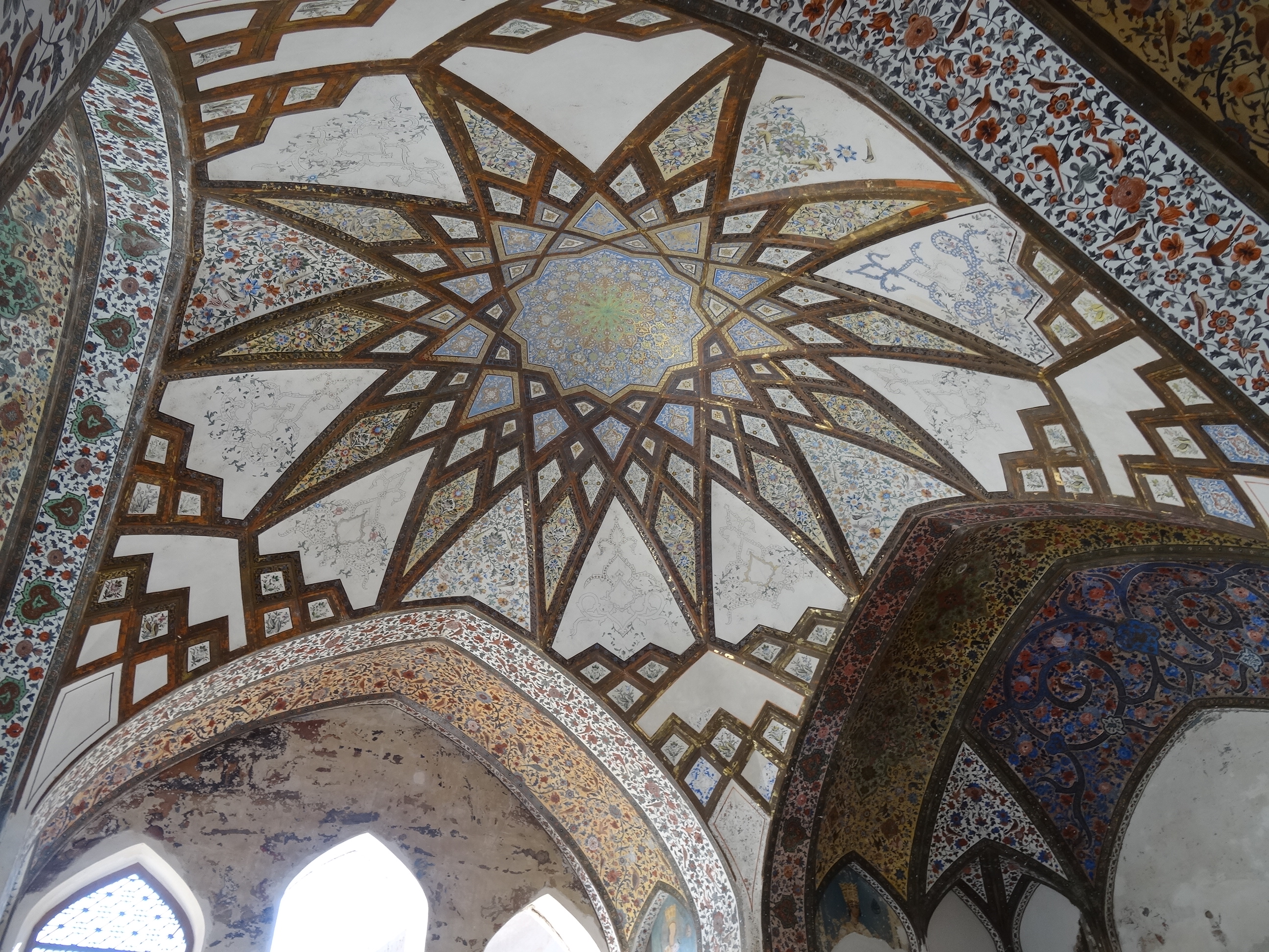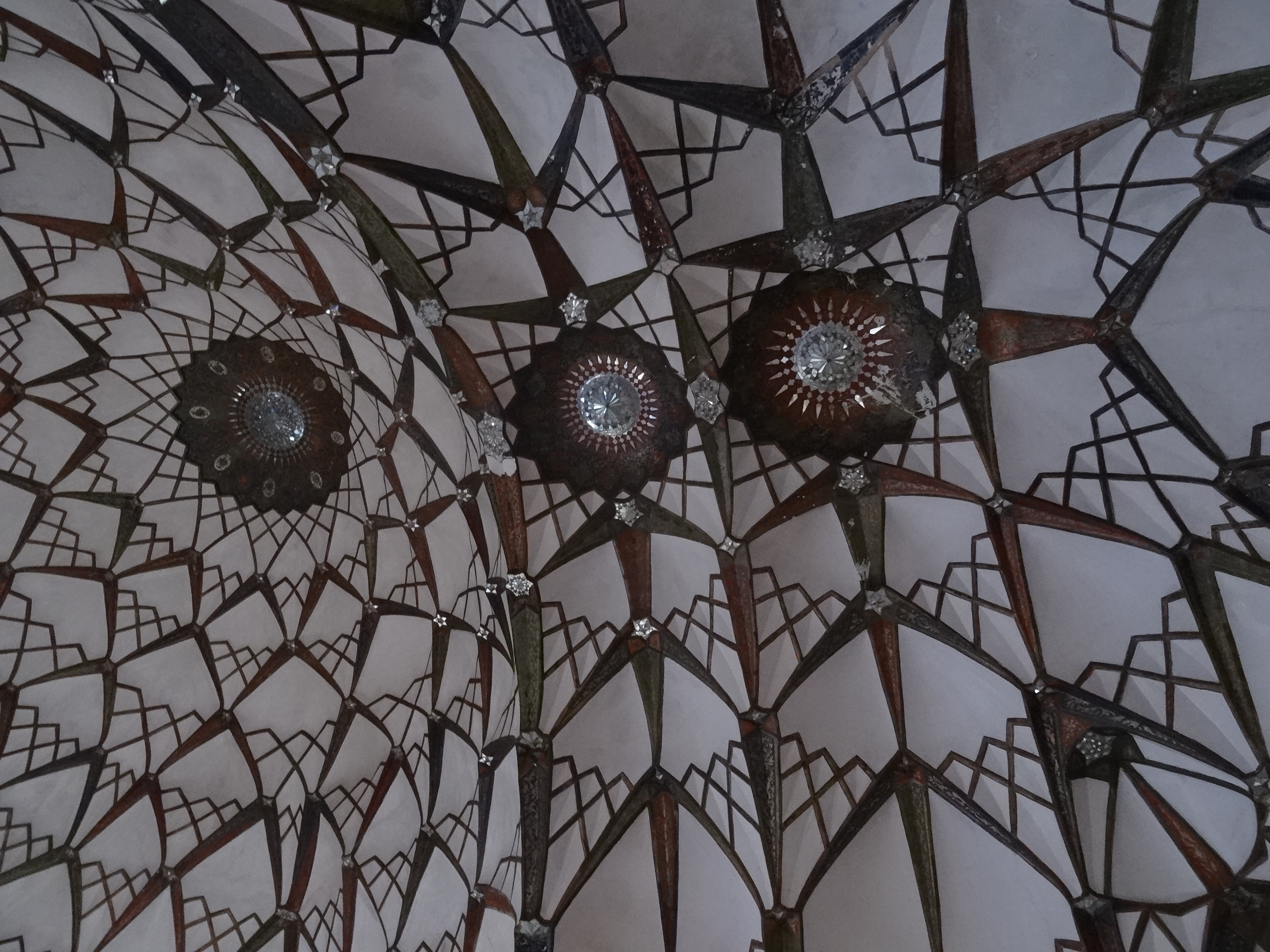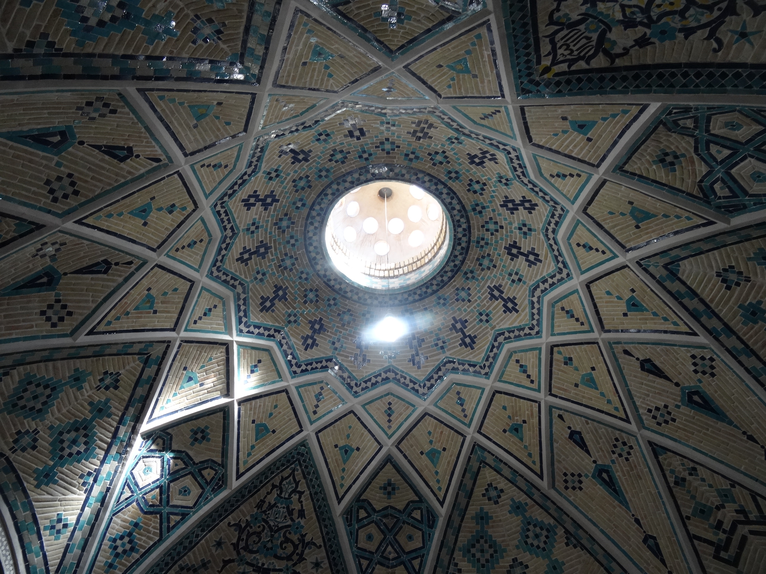 Am plecat din nou la drum spre sud către următoarea oprire, orașul Kashan, un oraș de unde am plecat cu o mare durere de gât. Nu am răcit, motivul este altul. La Kashan se găsesc o mulțime de palate cu decorațiuni spectaculoase dar absolut toate impresionează mai ales prin decorul incredibil al tavanelor. Sunt fantastic de frumoase, iar de cât de mult m-am uitat numai în sus la ele și le-am pozat cam așa am plecat cu durerea de gât. Motivul pentru existenta unei asemenea bogății aici este tradiția veche a meșteșugarilor în special a covoarelor persane (cele mai renumite covoare persană se fabrică în Kashan) dar și a faianței și mozaicelor. Deținătorii acestor ateliere au profitat și de așezarea orașului pe drumul mătăsii reușind să facă averi colosale. Kashan era în același timp și un loc preferat de vacanță pentru șahi care deseori poposeau în palatele construite în această oază naturală aflată la marginea deșertului central.