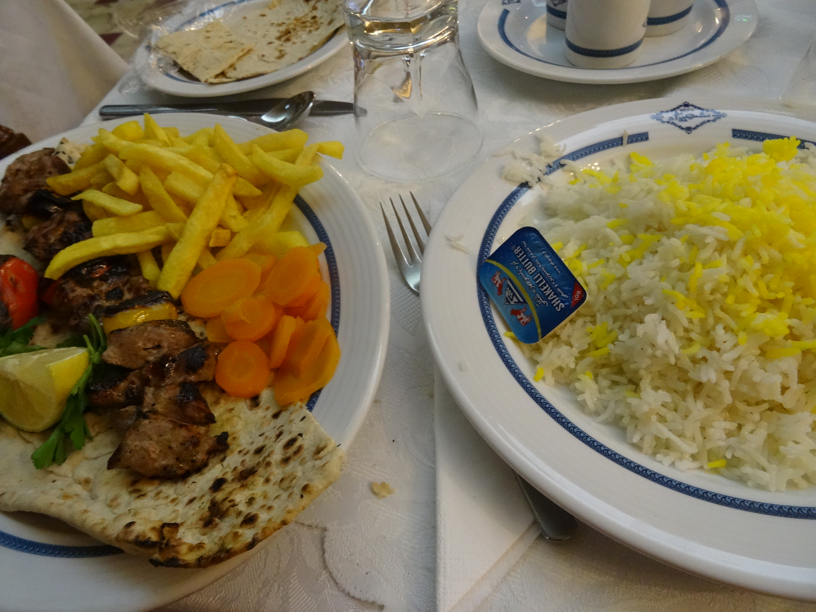 Organizatorul excursiei mi-a spus să nu ratez sub orice chip o masă la restaurantul hotelului Abbasi. Pentru că a insistat atât de mult am fost aici la cina în prima seara și am revenit din nou după prânz a doua zi. Abbasi este un hotel de 5 stele care poate fi considerat o atracție turistică în Isfahan. Are o arhitectură deosebită fiind un fost palat regal cu o grădină în mijlocul construcție pătrate. Aceasta grădină, transformată în terasa restaurantului e de departe cel mai frumos loc în care am luat masa vreodată. Cu mii de flori colorate, pomi fructiferi încărcați de fructe, râuri și fântâni arteziene și păsări cantând de pe crengile copacilor e supranumita Gradina raiului. Pe scaunele confortabile de la mese, oaspeții savurează un ceai de scorțișoară sau o narghilea sau servesc masa pe o muzica ambientala a formației hotelului. Am gustat câteva feluri de ceaiuri servite impecabil și tradiționala supă osh care la Abbasi este felul cel mai căutat.
