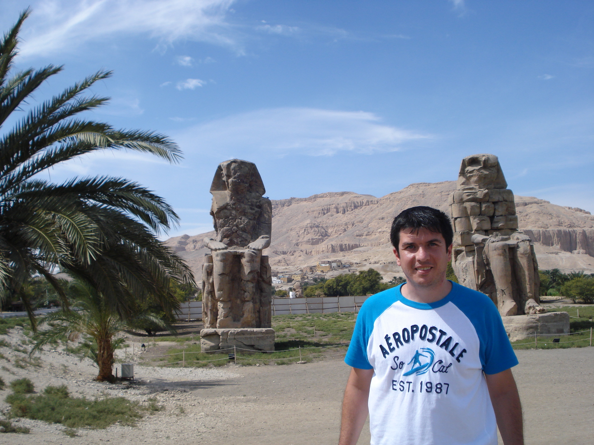 După ce am coborât din munte am făcut un popas la un magazin turistic de sculpturi din piatra. Îmi amintesc că aici m-a abordat unul din vânzători: „Hello sir, welcome! I am Ali. What is your name?”. Eu i-am răspuns politicos „Hi, I’m Cristian” la care el „Yes, yes! And I am muslim. But what is your name?” („Da, da, și eu sunt musulman dar cum te cheamă te fapt?”) :). Este un dialog pe care l-am avut de cel puțin 4-5 ori prin lumea arabă, dar care mă amuza de fiecare dată. În rest, de la magazin n-am luat mare lucru pentru că prețurile erau astronomice, făcute special pentru turiștii străini. Mai departe am făcut o scurtă oprire la coloșii lui Memnon, 2 statui uriașe care îl întruchipează pe faraonul Amenhotep III, ce cândva păzeau intrarea în templul acestuia.