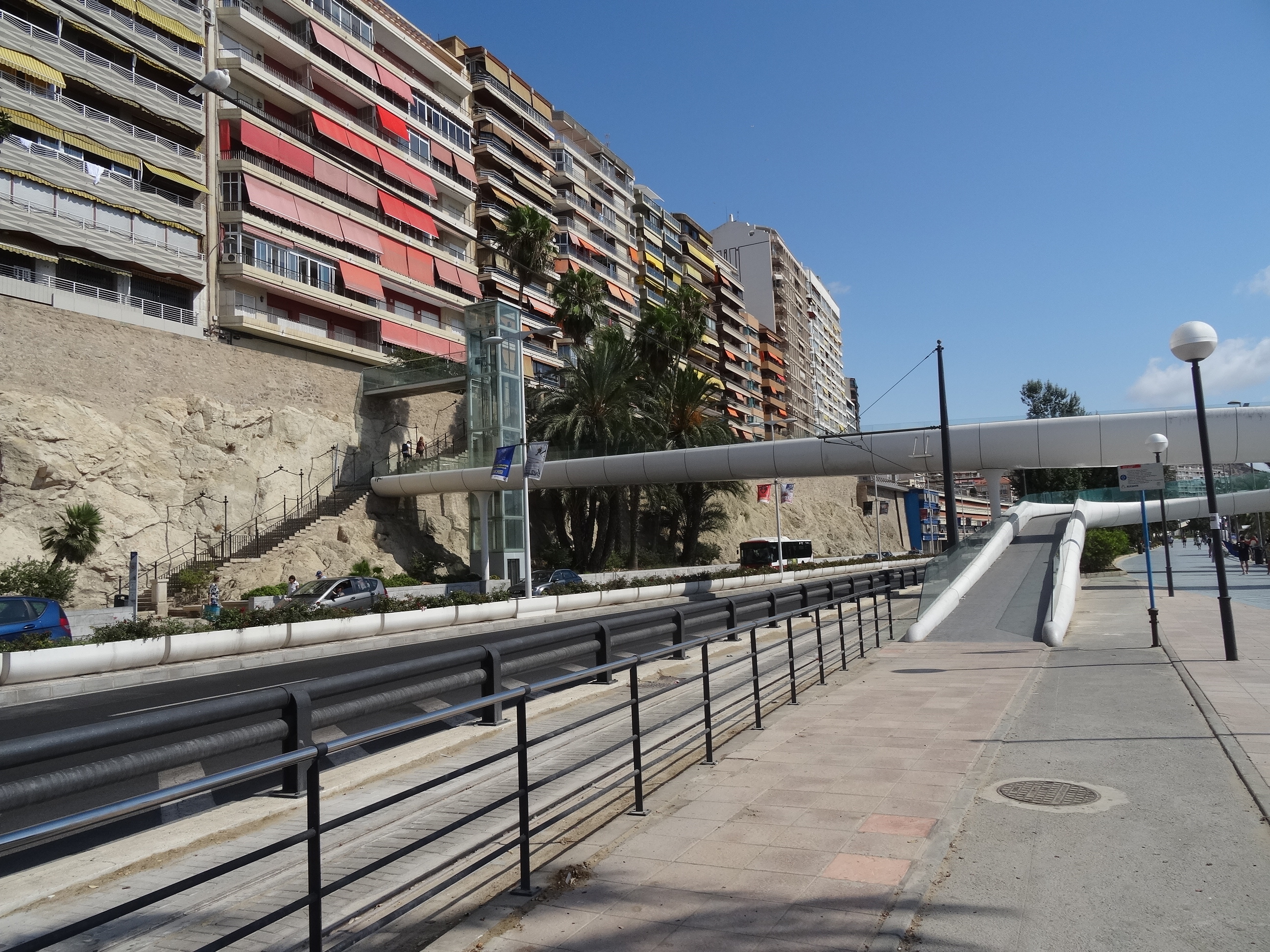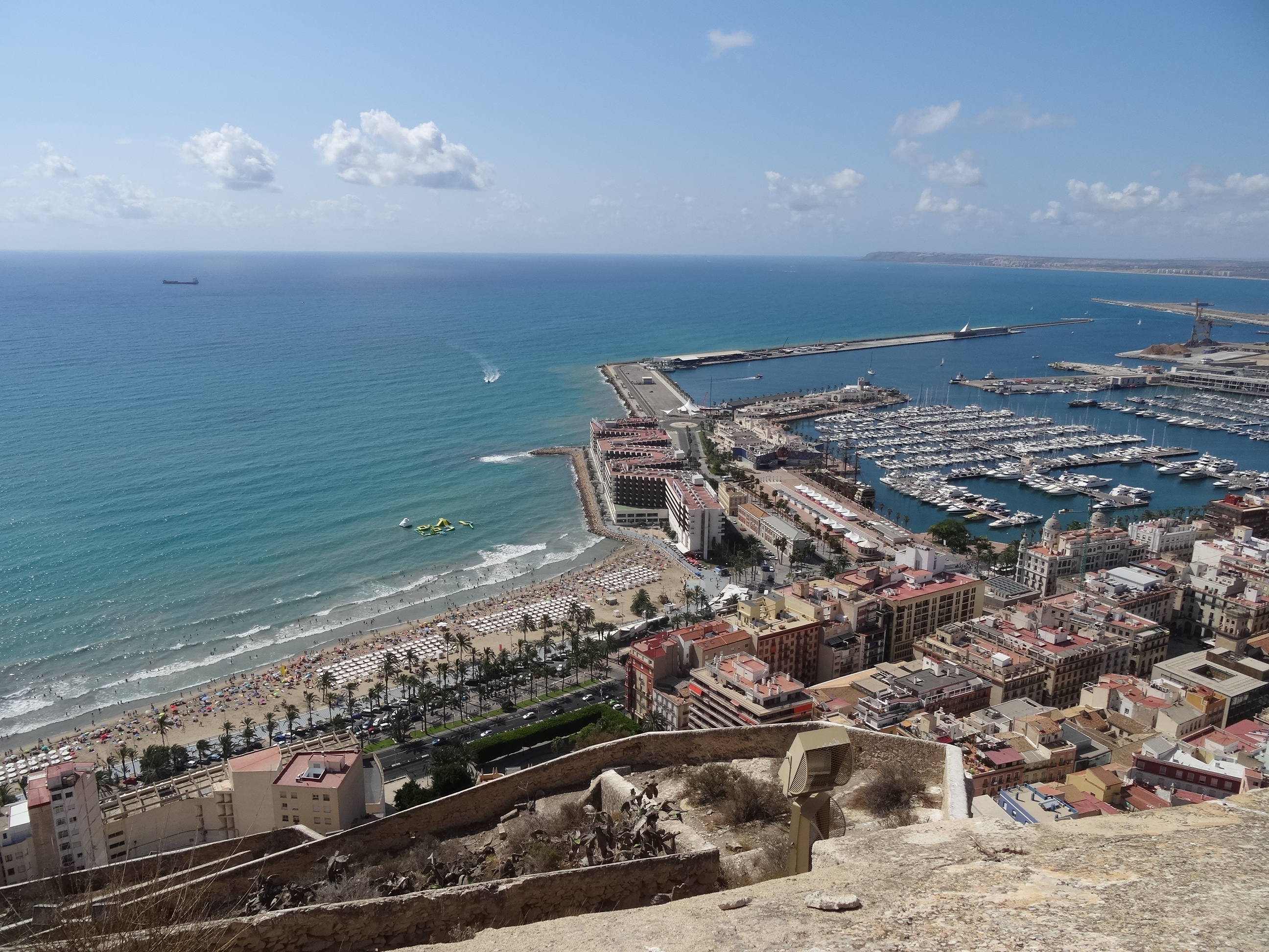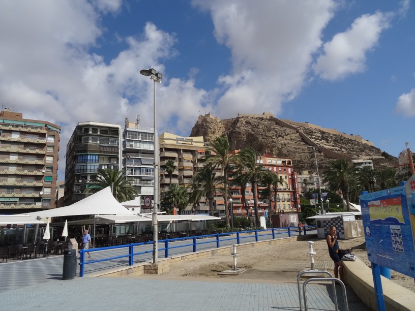 Am continuat apoi pe străduțele înguste ale orașului vechi, pe lângă catedrală și frumoasa clădire a primăriei pana am ajuns la promenada de la malul mării, bulevardul Esplanada d’Espanya. Aici de o parte se află portul turistic cu o mulțime de iahturi luxoase iar pe partea cealaltă se află plaja principală din Alicante, plaja Postiguet iar deasupra lor sus pe deal se vede cetatea Santa Barbara. Plaja este o frumusețe iar în ziua când am fost noi era arhiplină cu turiști, vremea fiind superbă. Urma însă o săptămâna întreagă petrecută la plajă așa că am preferat să mergem mai departe către cetate. La Santa Barbara se ajunge cel mai ușor cu liftul. De pe promenadă se traversează pe o pasarelă peste autostradă și apoi se merge printr-un tunel lung săpat până prin mijlocului dealului de unde se urcă cu liftul până sus.