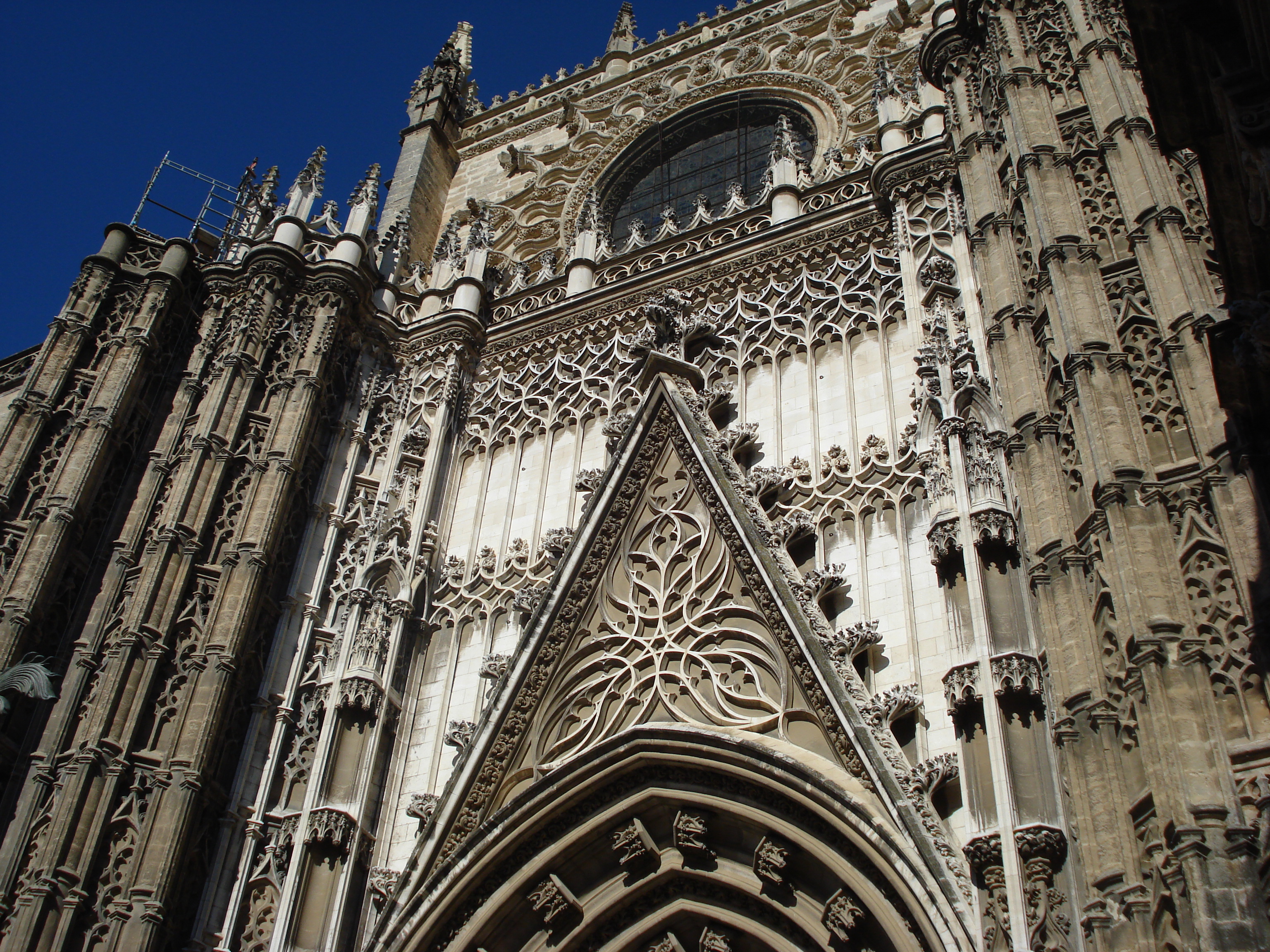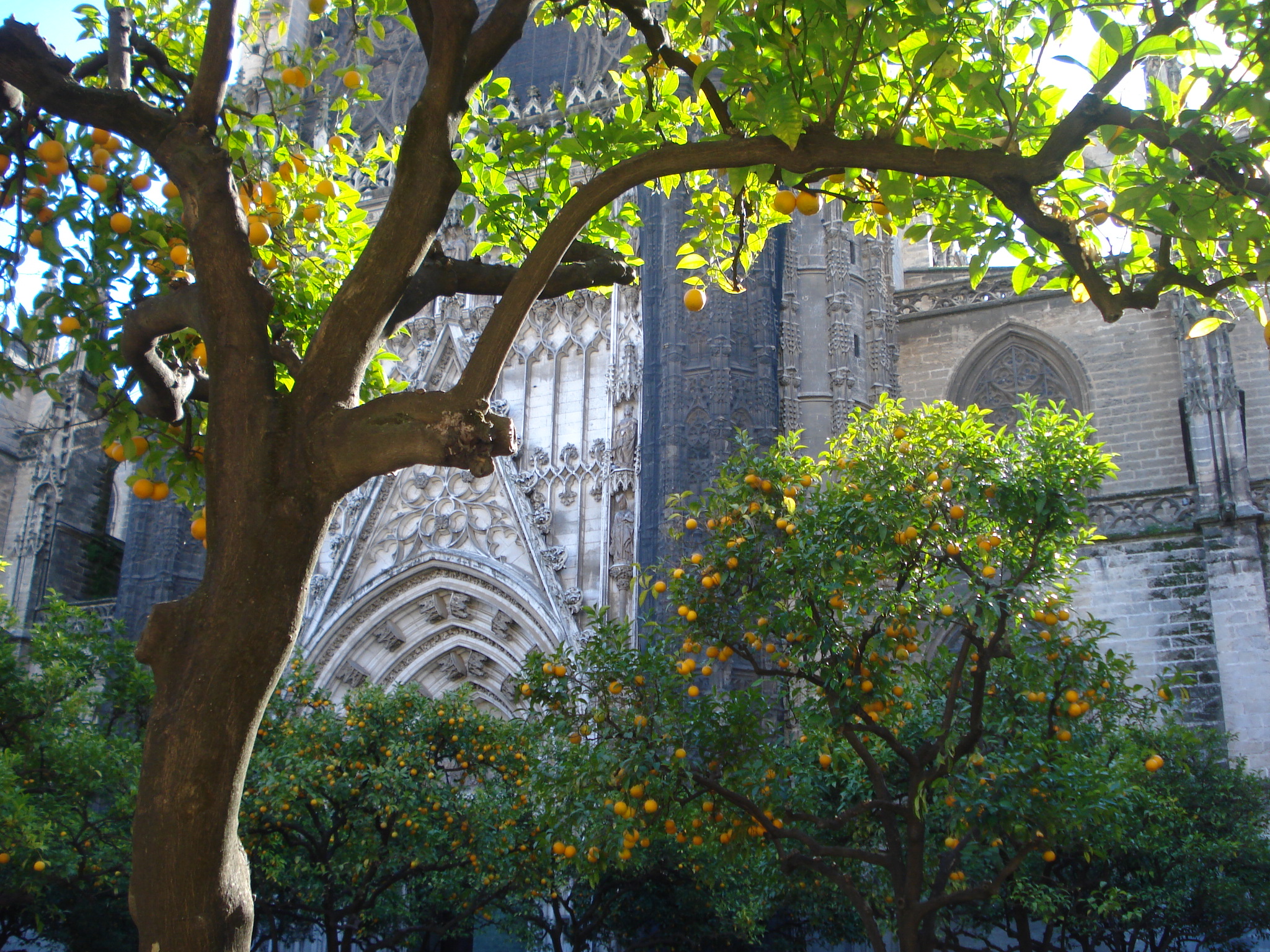 Sevilla are o zonă pietonală destul de vastă în centru cu mai multe bulevarde late pe unde pe lângă pietoni pot trece doar tramvaiele și caleștile pentru turiști. Am reușit să găsim o parcare foarte centrală de unde am luat-o la pas prin centru. Am mers direct la Catedrala Santa Maria de la Sede (Sfânta Maria a Mărilor), a treia cea mai mare biserică din lume și cea mai mare construcție gotică. Catedrala din Sevilla este și ea construită pe bazele unei mari moschei. Spre deosebire de Cordoba, aici a fost distrusă cea mai mare parte din vechea moschee dar s-a păstrat vechiul minaret transformat în turnul catedralei numit astăzi Giralda. Am vizitat mai întâi catedrala, dimensiunile interiorul fiind impresionante. În catedrală sunt înmormântați mai multi regi castilieni dar cel mai impozant mormânt este cel al lui Columb aflat în centrul capelei mari. Curtea bisericii este de asemenea una deosebită; acolo am descoperit Patio de los Naranjos cu ai săi portocali încărcați de fructe. La final am urcat până în vârful turnului Giralda. Turnul construit mai întâi ca o replică a minaretului moscheii din Marrakech a fost transformat de catolici și decorat cu detalii gotice oferă astăzi turiștilor o priveliște superbă asupra întregului centru vechi din Sevilla.
