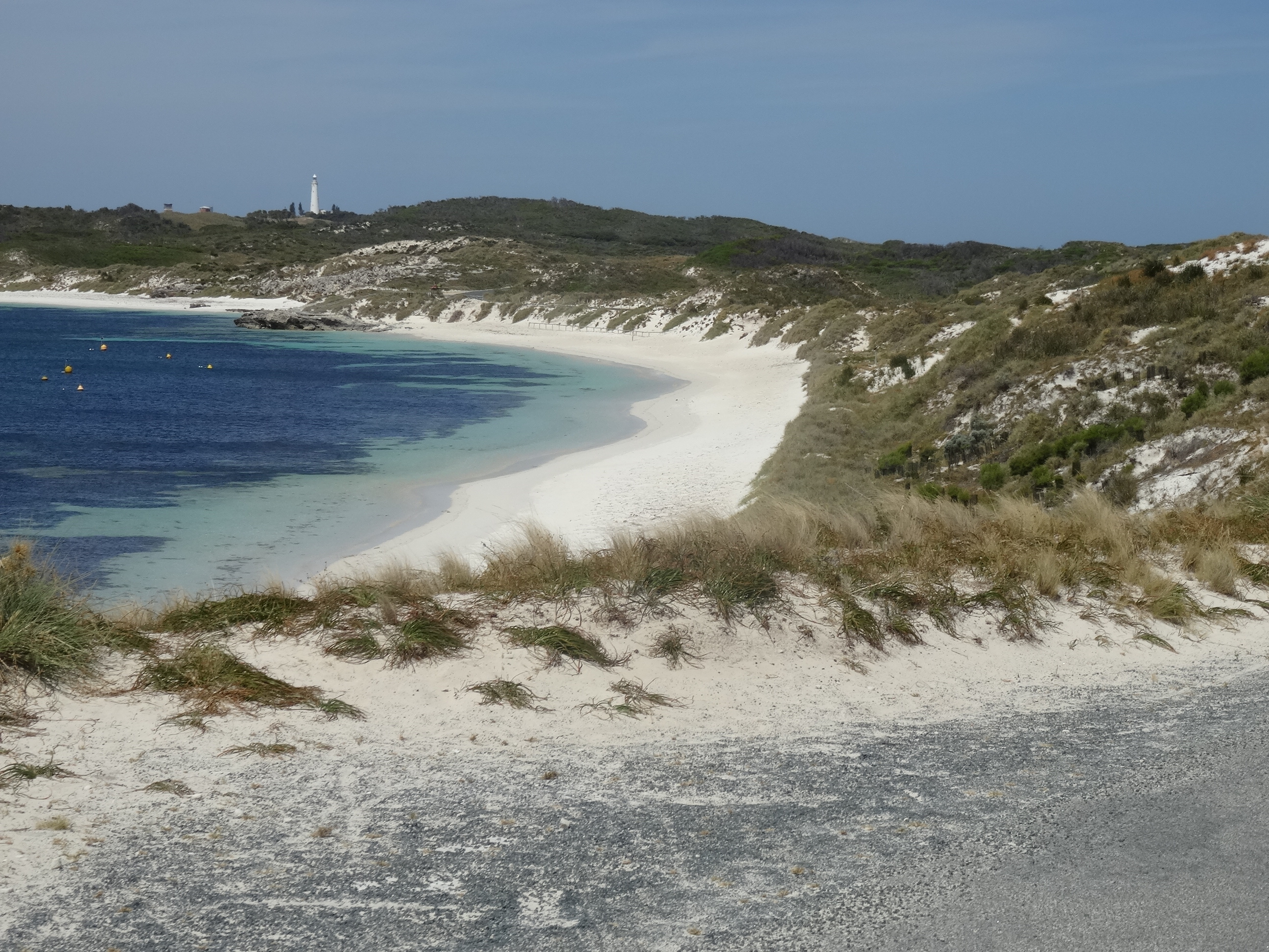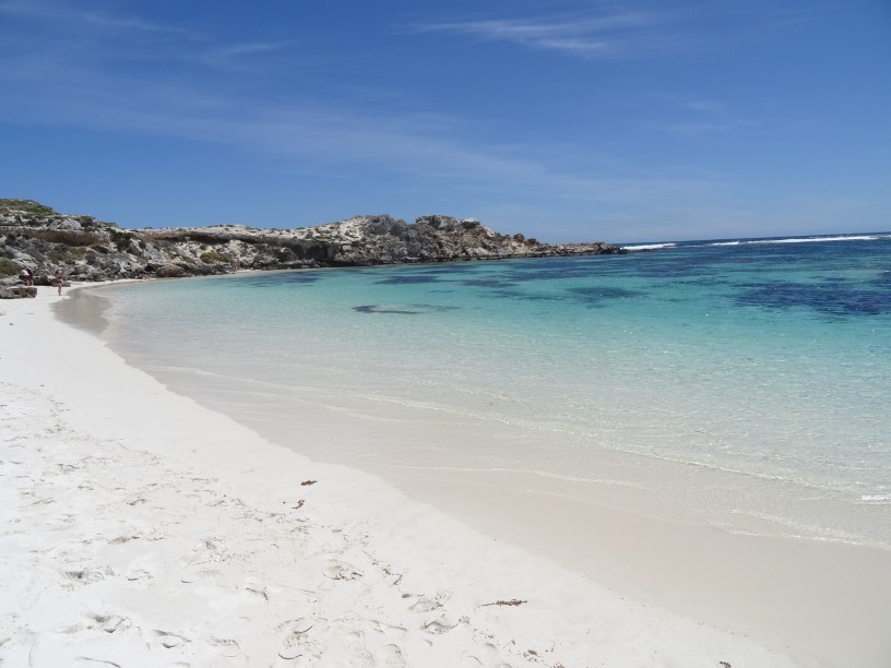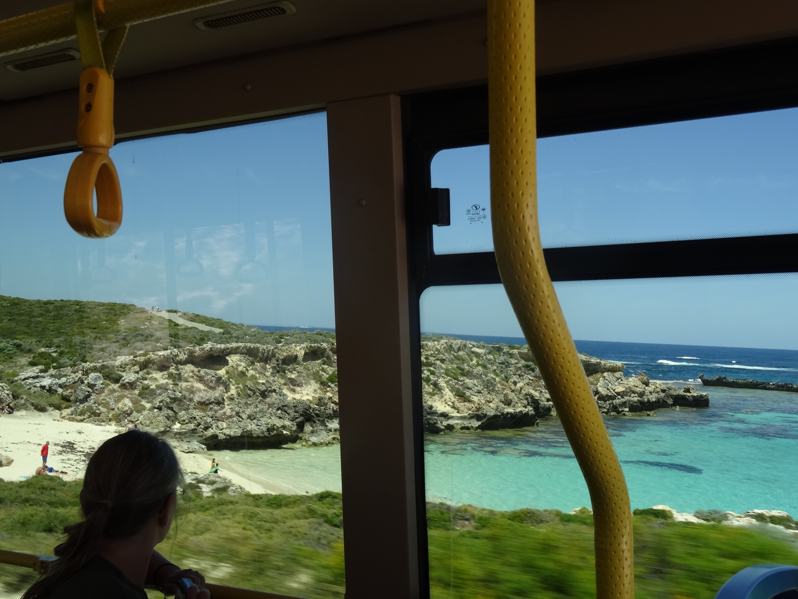 Pe drumul de aproape o oră pe mare am reușit să ma trezesc mai bine iar când am ajuns la insulă am fost pur și simplu fascinat de apa turcoaz și plajele de nisip alb. Insula Rottnest are 7 kilometri lungime și 3 lățime în punctul ei cel mai lat. Este rezervație naturală și nu este locuită. Există doar câteva case folosite mai ales de angajații care lucrează la întreținerea ei. La fel ca mai peste tot în Australia prima construcție de aici a fost o închisoare, folosită pentru deținuții considerați periculoși. Există și un drum asfaltat care înconjoară insula aproape de țărm. Insula este vizitată doar pe timpul zilei, iar turiștii pot face plimbări cu biciclete închiriate sau se pot deplasa cu autobuzul (singurul de pe insulă de altfel) care face ocolul oprind la punctele de atracție principale. Am optat pentru autobuz. Pentru un bilet care includea opriri nelimitate am plătit 20 de dolari.