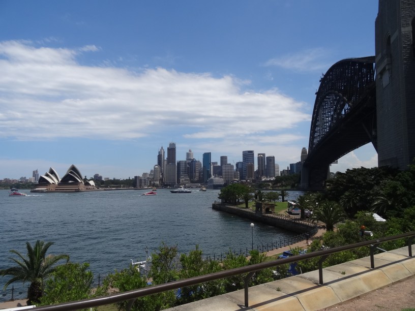 – Harbour Bridge: Locul meu preferat din Sydney. De ce ar fi un pod preferatul meu? Pentru că Sydney este în totalitate despre priveliști frumoase iar podul se află în inima lui legând cele două maluri ale orașului oferind cele mai frumoase și diverse vederi. Podul are o structură metalică și a fost inaugurat în 1932 fiind supranumit de localnici The Coathanger (umerașul) datorită formei arcuite. Pe lângă drumul auto cu opt benzi, podul mai găzduiește 2 linii de de metrou, o alee pietonală și o pistă pentru bicicliști. Turnul sudic poate fi vizitat. Un bilet costă 7 dolari incluzând vizita la muzeul dedicat construcției și intrarea la terasa panoramică. Pe pod se organizează un tur faimoși printre turiști, numit Bridge Climb. E vorba de traversarea podului pe deasupra mergând pe arcele abrupte metalice într-un traseu circular. Turul durează 2-3 ore și include costumul de siguranță, ghid, asigurări și fotograf (nu e voie cu camera proprie) și costă doar… 250 de dolari. Da, foarte scump, dar chiar și așa biletele se epuizează zilnic. Îmi plac mult experientele mai extreme (ca să fiu sincer nu sunt așa curajos, dar e o mare satisfacție să îmi întrec limitele din când în când) și m-am gândit serios să cumpăr un bilet. Am renunțat totuși când am văzut că se merge pe scări cu balustrade, asigurați permanent, am mai văzut la coadă și un grup de bătrâni din Anglia și câțiva turiști mai plinuți americani și am zis că e clar că nu e tocmai o provocare… Am ales să fac podul la pas (1,2 kilometri) văzând aceleași priveliști frumoase gratis. Am vizitat turnul sudic și am ajuns pe malul nordic unde am găsit cea mai frumoasă vedere a portului, dar și o mulțime de restaurante cu mâncare delicioasă. Am luat prânzul admirând priveliștea, am mai poposit pe la un parc de distracții tip Luna Park și am revenit către City cu feribotul.