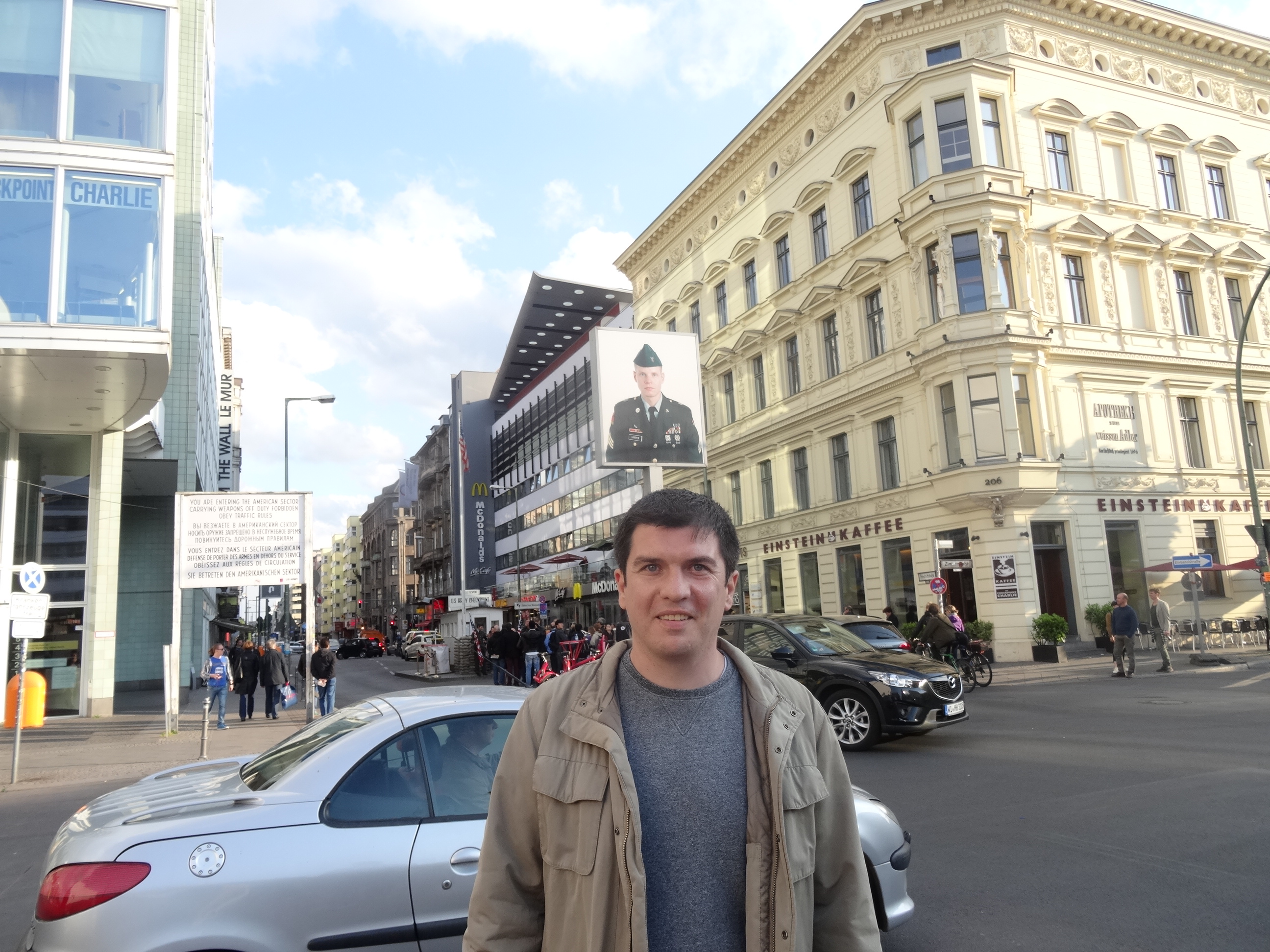 Vorba vine centrul vechi pentru că mai toate clădirile din zona centrală au fost construite după război. Berlinul, asemenea multor alte orașe din Germania, a fost bombardat puternic, majoritatea clădirilor istorice fiind distruse. Am trecut prin piața Gendarmermarkt mergând către Charlie’s Checkpoint. Acesta este un loc de mare importanta istorică fiind inițial, după separarea Berlinului, singurul punct de trecere intre sectorul american și cel rusesc. Pentru turism punctul de trecere și semnele de avertizare originale au fost păstrate, iar mai multe muzee dedicate zidului au fost amenajate în apropiere. Punctul de trecere este locul ideal pentru a înțelege mai bine istoria tristă a Berlinul din timpul divizării.