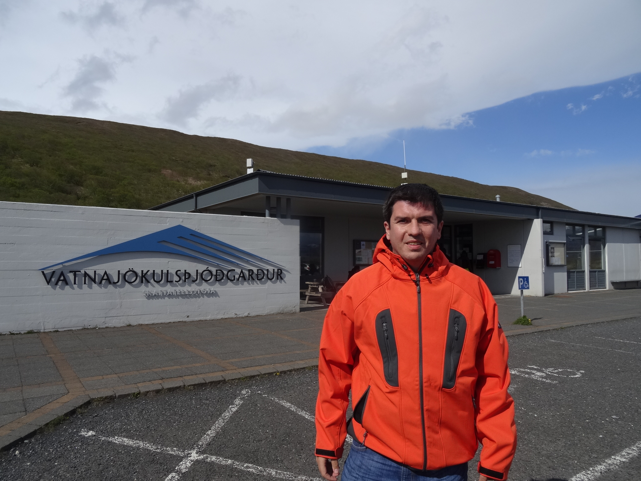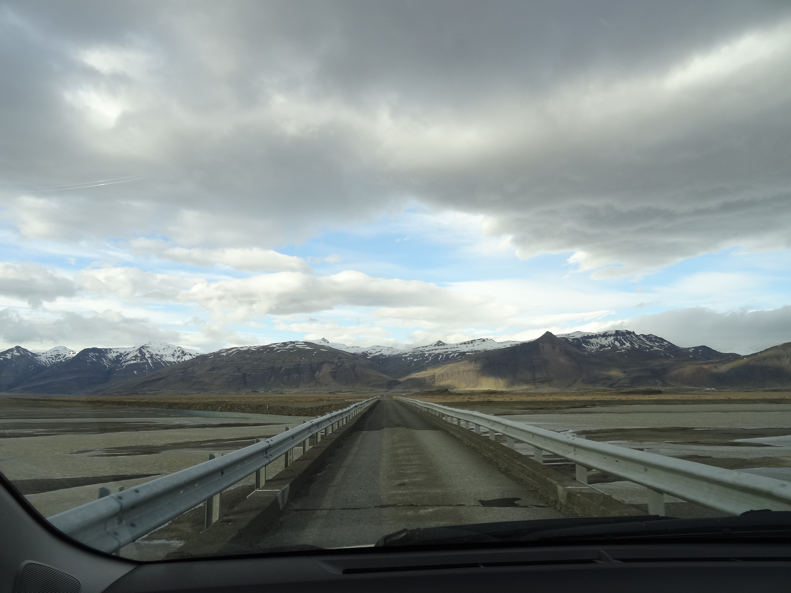 Pe drumul nostru spre Hofn unde aveam cazarea rezervată la un moment data am lăsat dealurile verzi în urmă iar la orizont au apărut munți înalți acoperiți de gheață și o perdea de nori deasupra lor. Era chiar marele Vatnajokull. După ce am traversat unde pod lung de câteva sute de metri, am oprit la o parcare pe marginea drumului pentru a admira întreg peisajul. Podul este construit peste câmpia ce se inundă anual la topirea gheții din masivul Skaftafell și a fost distrus de blocurile aduse de aluviuni de mai multe ori. În apropiere se află un monument dedicat constructorilor și mai multe panouri despre istorie. Nu oprisem pentru asta totuși, ci pentru a admira peisajul care este splendid.