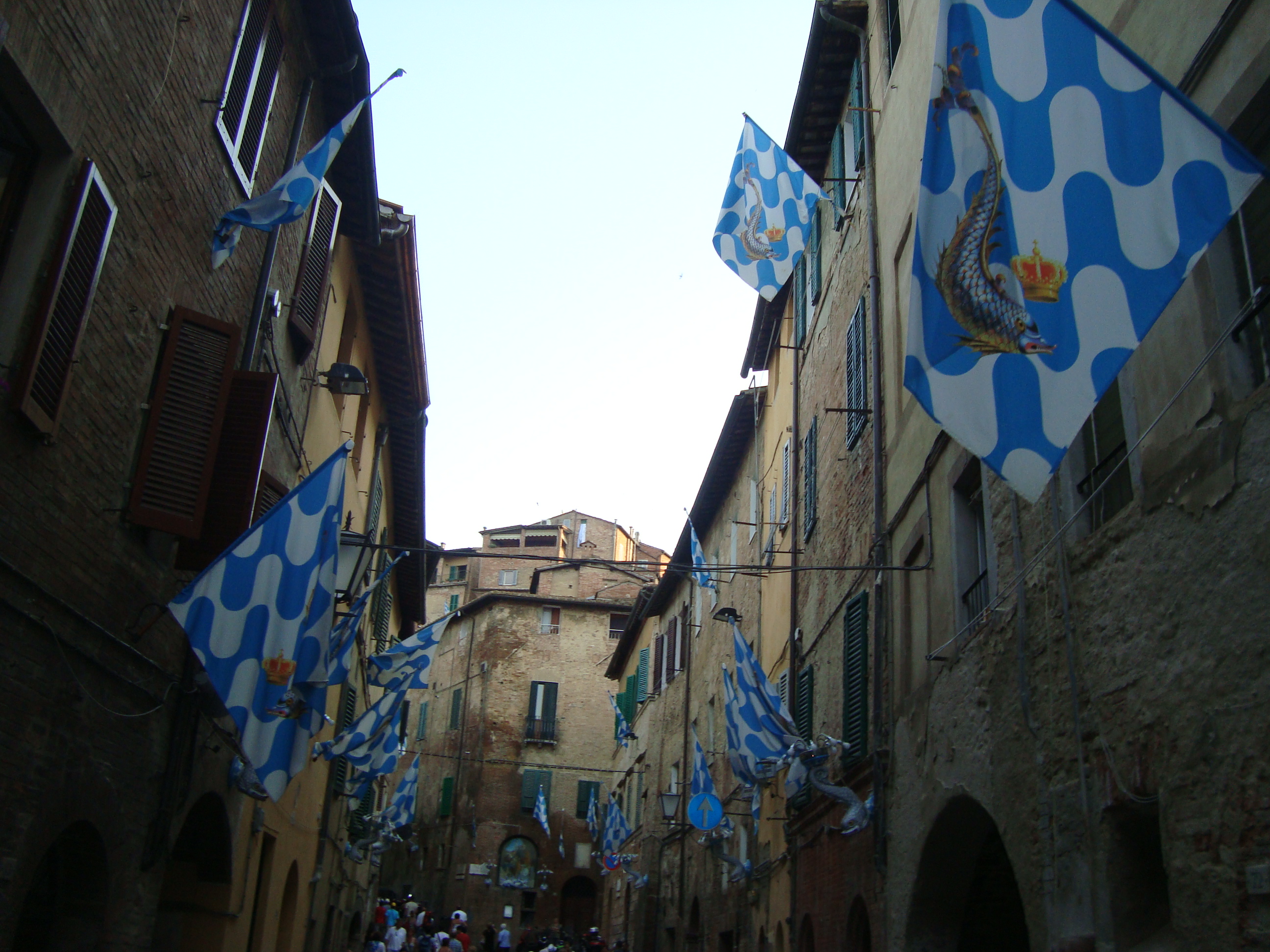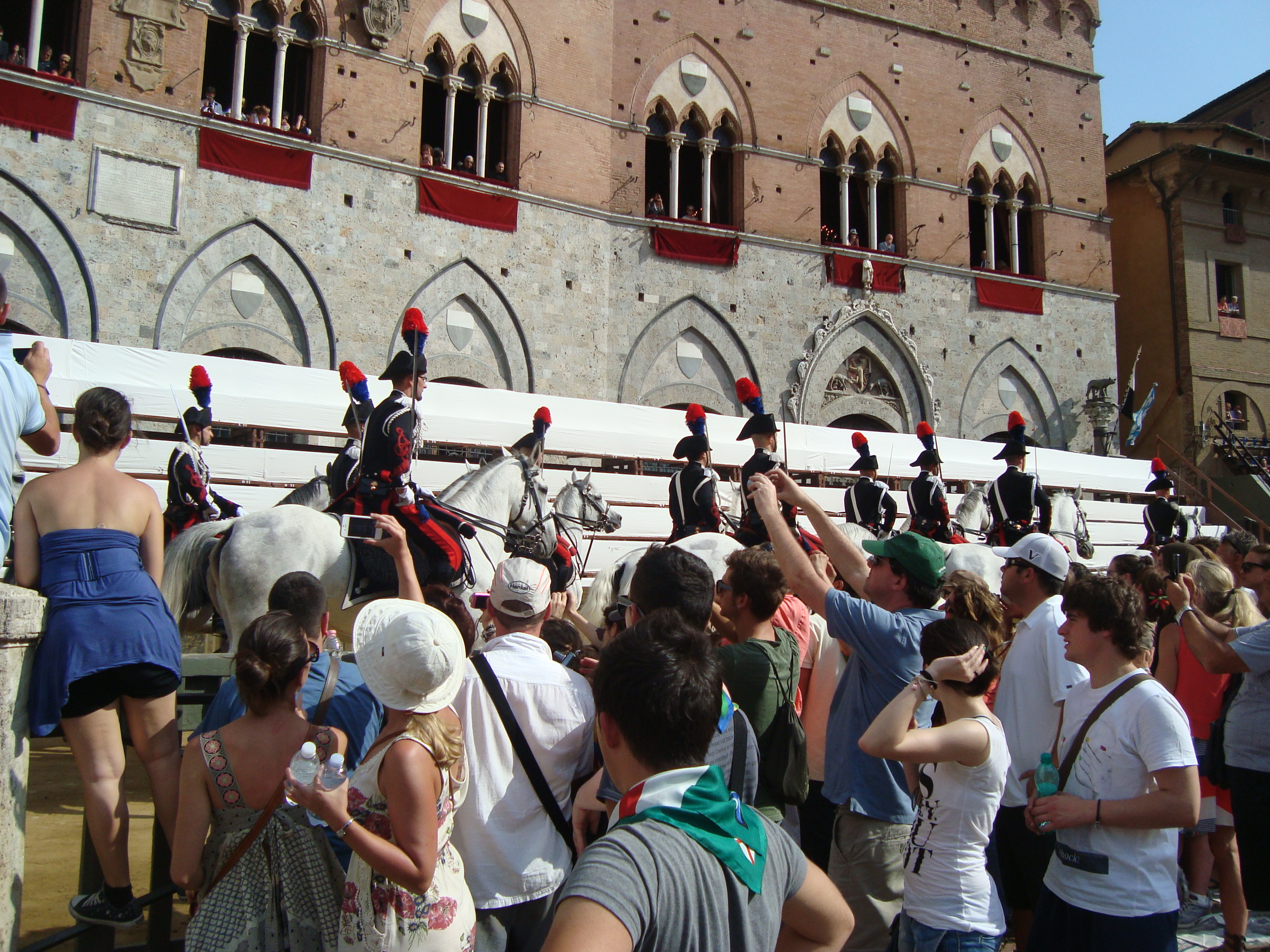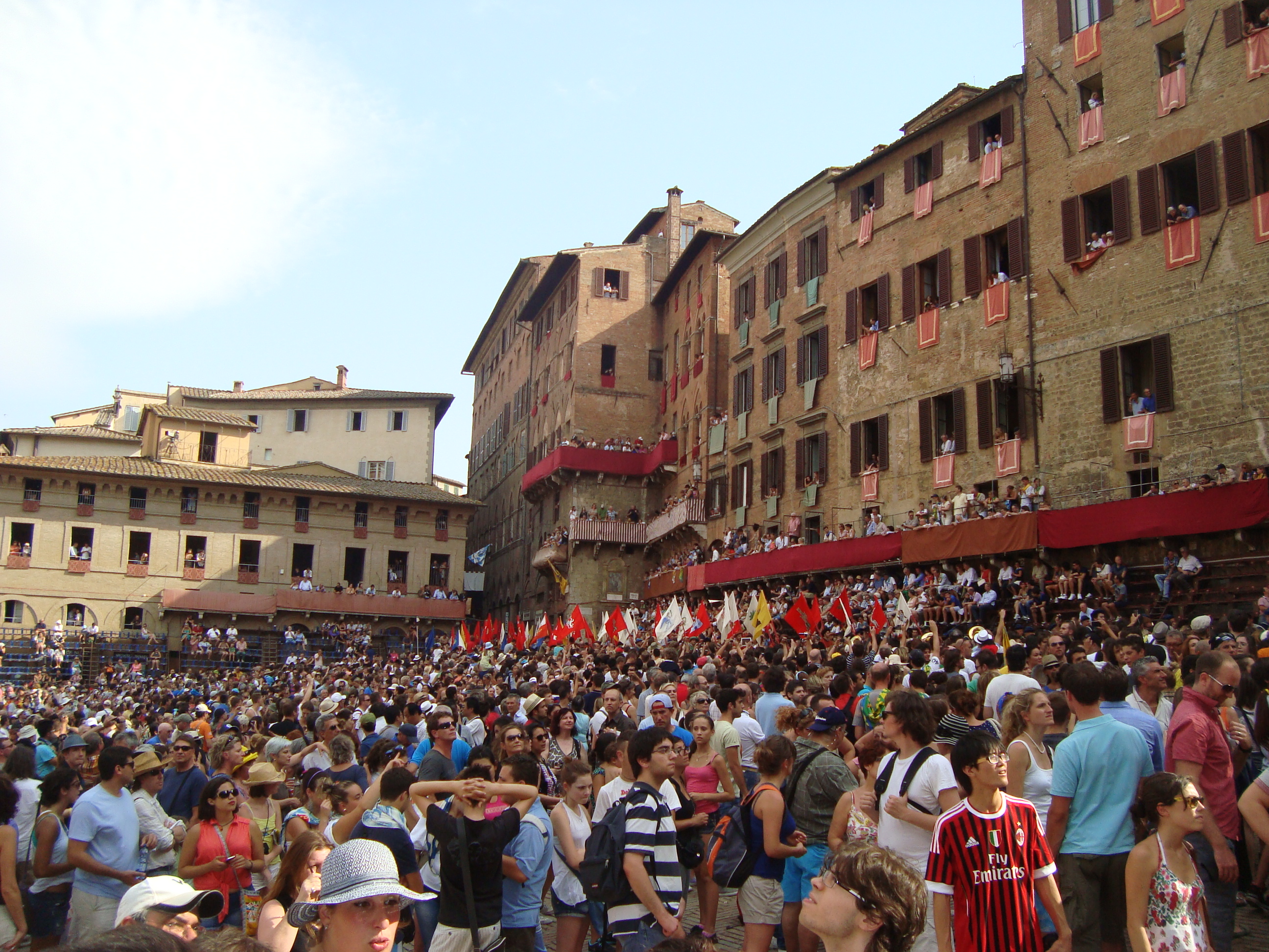 Am ajuns în centrul Sienei cu vreo trei ore înainte de cursă. Știam că trebuie să mergem din timp pentru a găsi locuri. Am abandonat mașina la hotel pentru că traficul în centru era blocat și am ajuns în schimb cu autobuzul. Prin oraș am dat de puhoaie de oameni, localnici și turiști, care se îndreptau spre Piazza del Campo, locul desfășurării cursei.