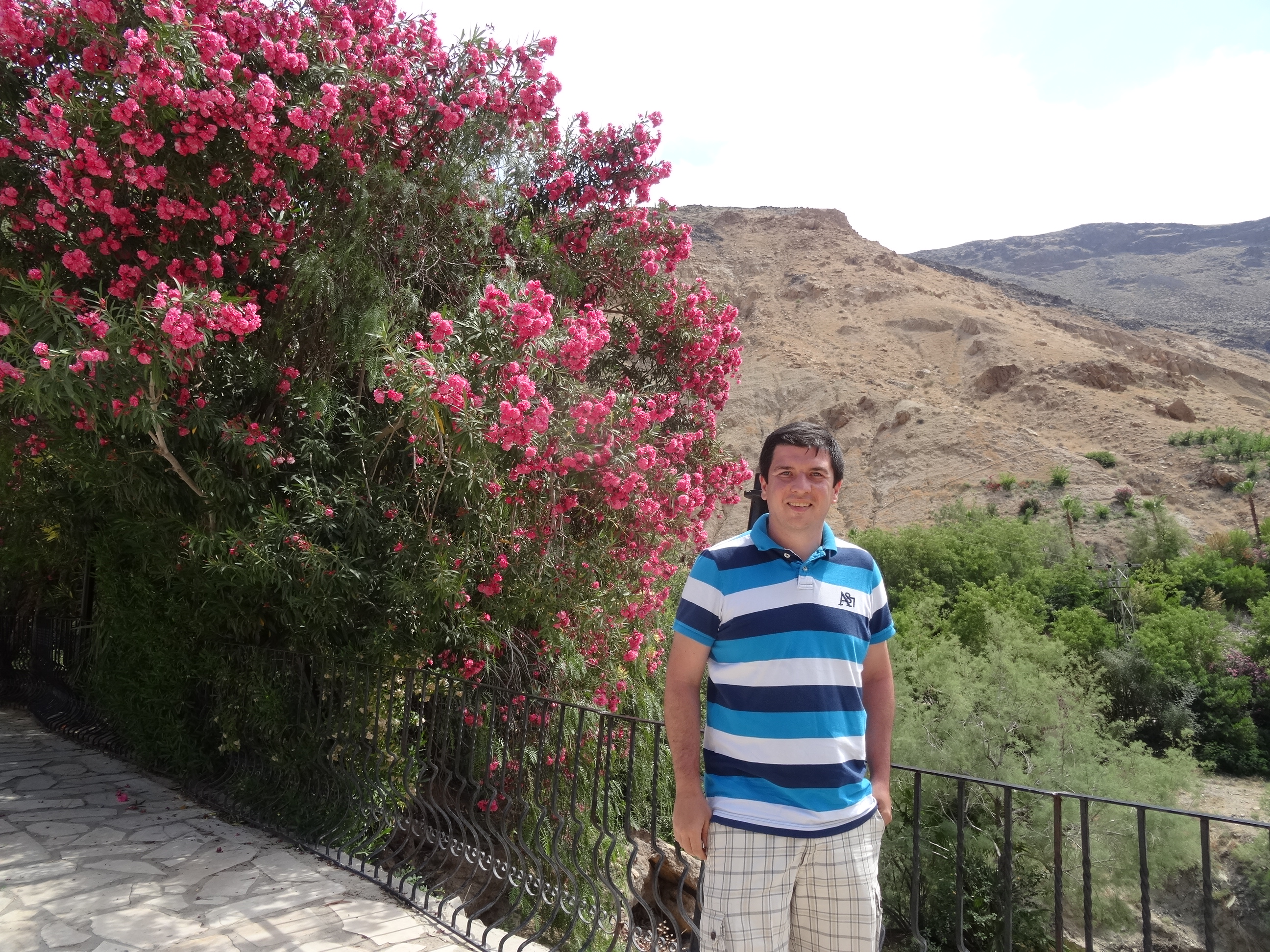 La vreo 30 de kilometri de destinația noastră se face un drum la dreapta către izvoarele Ma’in. Era destul de devreme și am zis că merită ocolul. Am condus pe pante de peste 20% și pe niște serpentine pe care de-abia mai trăgea mașina pentru ca apoi să testăm frânele la coborâre. Dincolo de munte se deschide o vale superbă plină de verdeață și flori. Pare incredibil să vezi așa ceva după ce multe ore de deșert sterp. Băile nu au acces liber. Există fie o taxă de vizitare de 20 de dinari (foarte mult aș spune eu) sau se poate intra gratuit pentru turiștii cazați la hotelul de 5 stele Evason Ma’in (unde o noapte costă minim 200 de euro. Nu voiam să facem baie oricum, ci doar să vedem zona așa că am spus la poartă că vrem doar să ne plimbăm puțin și am fost lăsați să intrăm în complex.