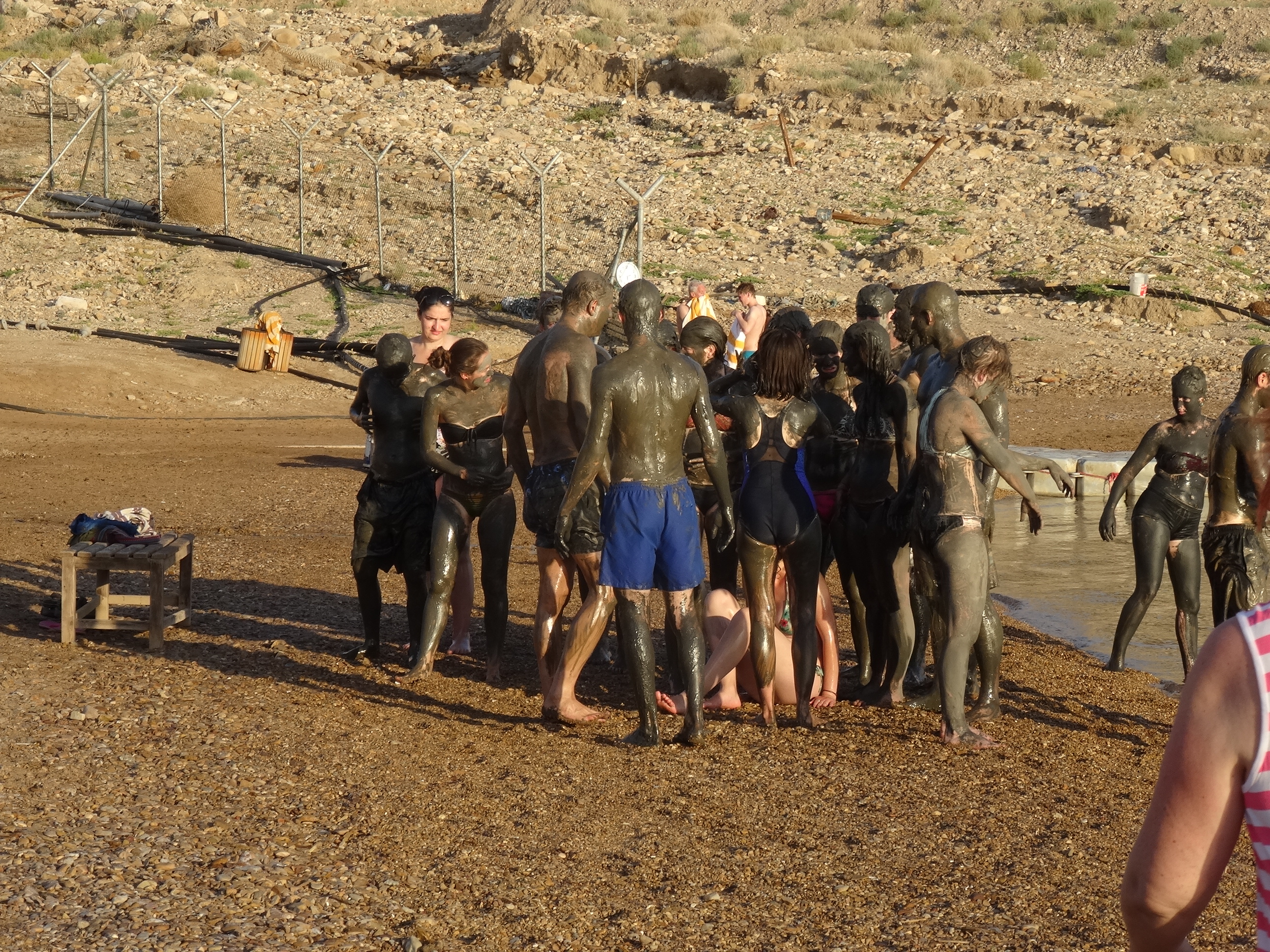 Trebuie știut că înotul e interzis la Marea Moartă. Mai exact, tehnicile comune de înot nu funcționează din cauza salinității și te pot scufunda cu capul în jos. Cel mai simplu e să te lași pe spate să te relaxezi. Asta am făcut și eu, am intrat în apă, m-am lăsat pe spate și am început să plutesc. Am mai fost la saline pe la noi, pe la Sovata sau Slănic unde teoretic te ține apa la suprafață. Concluzia mea e că nu se compară. La Marea Moartă nu ai cum să te scufunzi, chiar am încercat și orice ai face apa te ridică la suprafață. Relaxare totală și o mare bucurie pentru mine. Pe malul apei, hotelul a amenajat o groapă cu noroi pentru turiști. Noroiul este renumit în lumea întreagă pentru proprietățile terapeutice și din el se fabrică diverse produse cosmetice. Precum mai toți vizitatorii ne-am acoperit cu noroi și am stat la soare, iar după ce acesta s-a uscat am sărit direct în apă. Nu sunt eu tocmai expertul în produse cosmetice, dar pot să confirm că aveam pielea foarte fină după. Fetele în schimb s-au înghesuit să cumpere produse cosmetice pentru acasă.