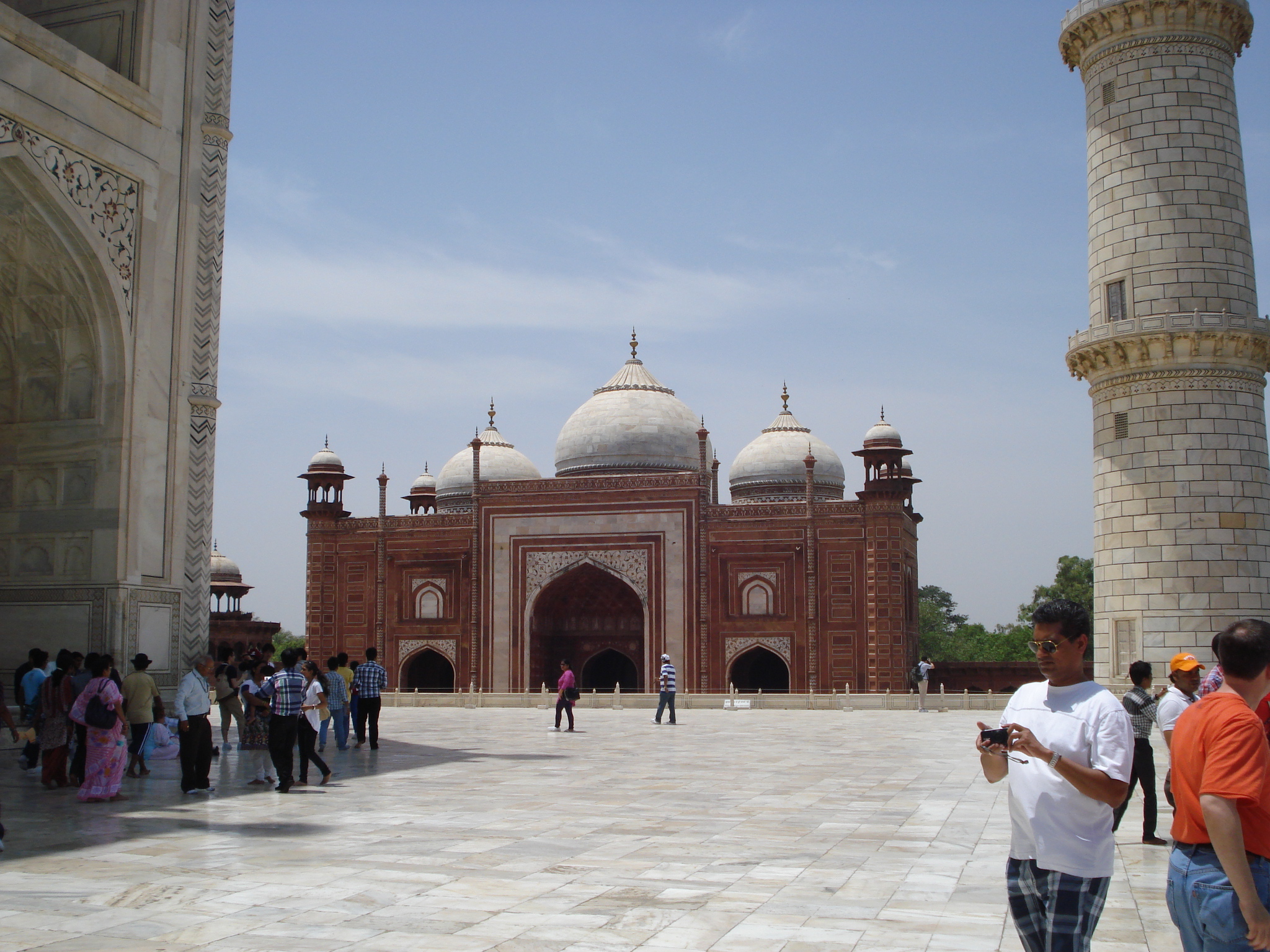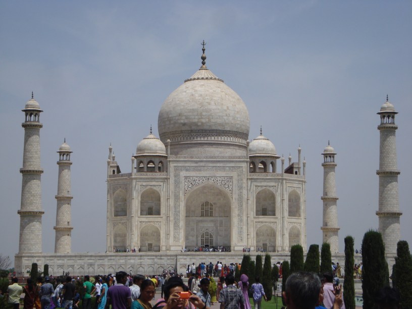 De la casa de bilete ne-am îndreptat spre marea poartă dincolo de care se vede Tajul. Momentul acela în care prin poarta deschisă începe să se vadă palatul e unul care nu poate fi uitat de nimeni care ajunge aici. La fel și eu. Văzusem atât de multe imagini de la Taj Mahal dar când îl vezi cu ochii tăi e altceva. E un loc magic. Dincolo de poartă sute de turiști încercau să găsească un cadru pentru o poză fără alți oameni în jur. Dincolo de poartă încep fântânile numite poetic „reflecting pool”. La capătul lor, marea construcție de marmură albă. Se spune că Tajul își schimbă culoarea în funcție de lumină, fiind gălbui dimineața, roșiatic la apus și de un alb orbitor la lumina lunii. Fațada cupolei este decorată cu desene florale și caligrafii islamice. Interesant este că decorațiile sunt făcute prin încastrarea de pietre prețioase de diferite culori în marmura albă și șlefuite până suprafața devine plană, o muncă extrem de dificilă și migăloasă. La interior sunt interzise fotografiile. Turiștii pot vedea decorațiile interioare ale cupolei de o măiestrie unică. Acolo se află două morminte false. Adevăratele morminte se află într-o cameră închisă sub cupola Taj Mahal și acolo se odihnesc Jahan și Mumtaz Mahal.