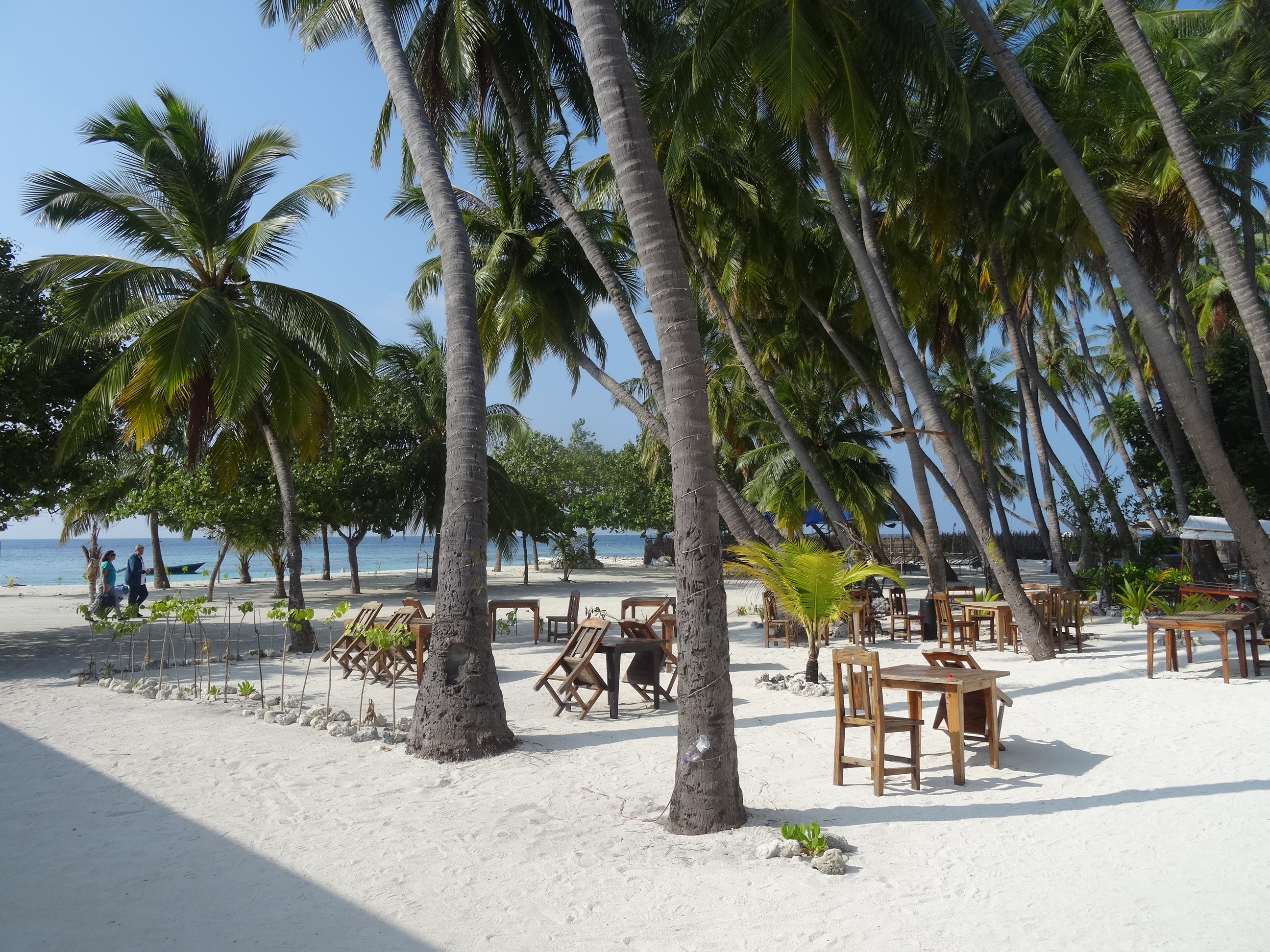 Hotelul nostru era la doi pași de plajă, dar era vorba de plaja localnicilor unde costumul de baie era interzis. Aveam terasa pe nisip și am putut servi masa într-un cadru natural superb. Animalul de casă al hotelului era papagalul vorbitor Kiki care știa să spună și câteva fraze în engleză. Tot el a avut grijă să ne trezească în fiecare dimineață. Un angajat al hotelului srilankez a avut grijă de noi, pregătind masa pentru noi și făcând curățenie. Patronii hotelului, câțiva tineri de pe insulă, erau și ei pe acolo însă nu i-am văzut decât dormind în hamac. Ne-au explicat că nu ai cum să fii altfel pe insulă, după câteva luni în Maldive sigur vei deveni leneș.