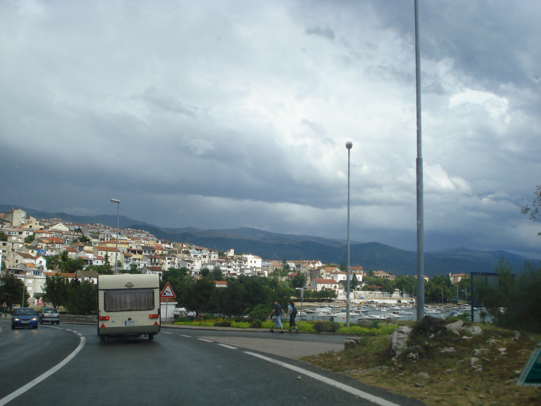 De pe drumul de coastă am avut o vedere excelentă asupra insulei Krk, cea mai mare insulă a Croației, singura dintre ele legată cu un pod de partea continentală. De la Senj am urcat câteva serpentine după care am revenit pe autostrada A1 în direcția Split. Autostrada principală a Croației care leagă capitala Zagreb de coasta Dalmată este o mare capodoperă inginerească. Relieful pe care îl traversează este unul dificil cu dealuri abrupte stâncoase. Autostrada a reprezentat un adevărat țel al Croației independente după ce proiectul ei a fost anulat de guvernul de la Belgrad pe vremea lui Tito în urma mișcărilor de independență croate. După separarea de Serbia, drumul a fost un obiectiv național iar cei aproape 500 de kilometri care au fost inaugurați pana în 2005 sunt un adevărat simbol al mândriei și unității croaților. Momentan drumul este realizat până la enclava bosniacă Neum urmând ca în viitor să ajungă la Dubrovnik și granița cu Muntenegru.