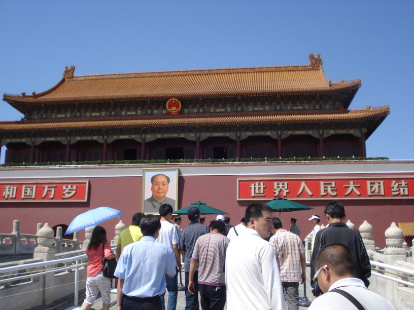 Seara am mers la Tien An Men, cea mai mare piață din lume. Este un loc imens înconjurat pe trei laturi de clădiri uriașe comuniste, precum Parlamentul, Mausoleul lui Mao sau Muzeul de Istorie, iar pe latura de nord se află marea poartă a Palatului Imperial. Nu venisem acolo să mergem la muzee ci să vedem ceremonia steagului. Zilnic la Tien An Men are loc o ceremonie militară foarte formală în care steagul național este ridicat la răsărit și coborât la apus. Am ajuns spre lăsarea serii și am luat un loc pe jos alături de alți turiști în așteptarea procesiunii. De o dată am auzit un strigăt în spatele meu. Mă întorc repede și văd un grup de soldații care veneau amenințător spre mine. Am înghețat pe moment cu gândul la masacrul care avusese loc chiar acolo cu 20 de ani în urmă dar după un moment am realizat că eram chiar în drumul lor spre piedestalul drapelului și m-am dat urgent la o parte.