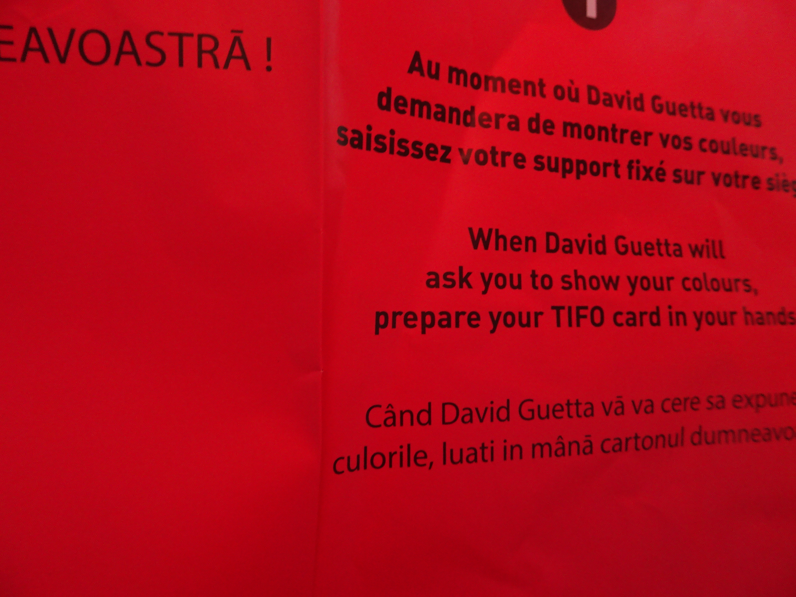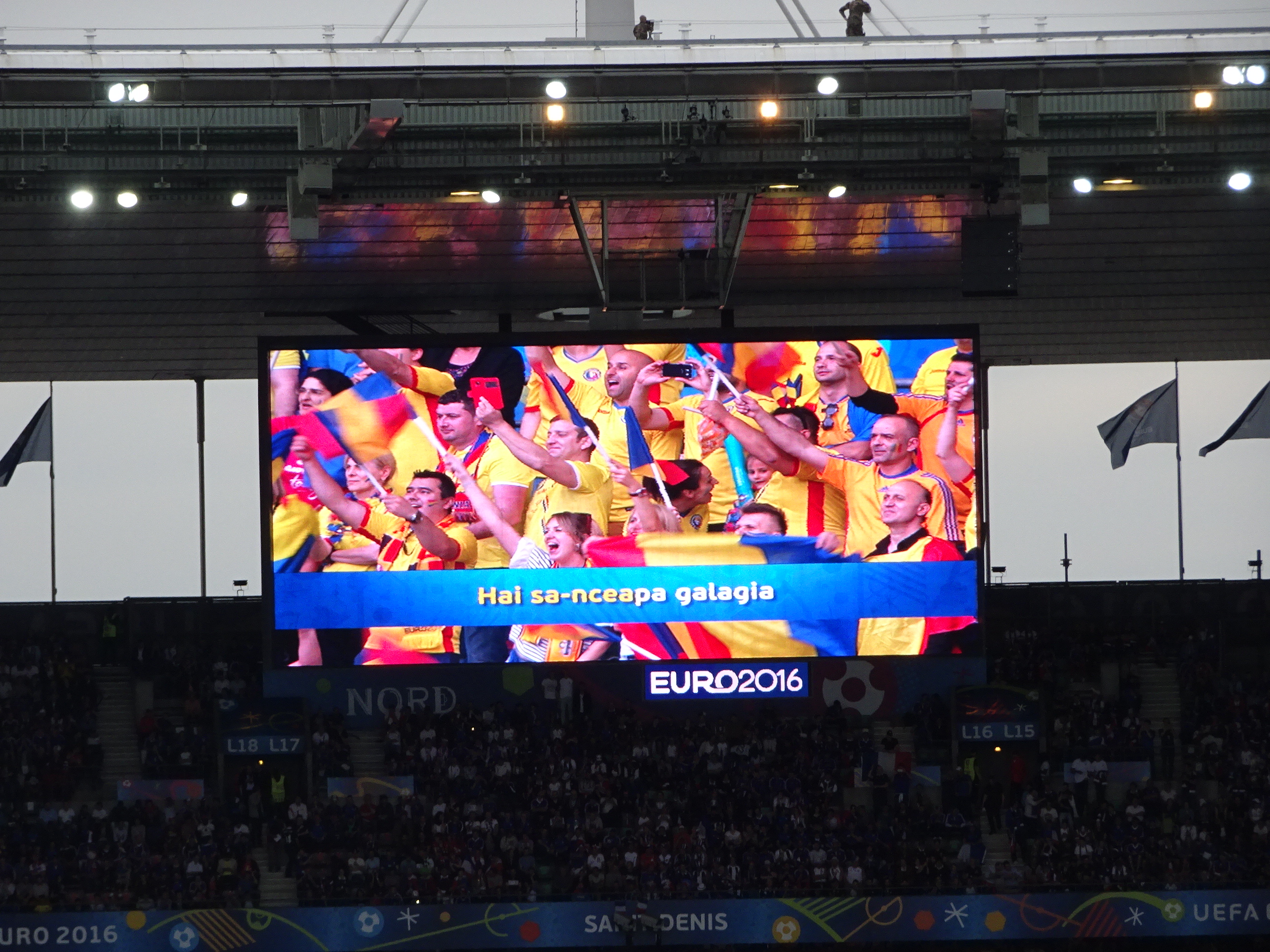 Am intrat apoi pe stadion și am uitat complet de alte probleme. Stade de France arată impresionant, iar peluza noastră era o mare de galben care cânta din toate piepturile. Până la meci mai aveam de urmărit festivitatea de deschidere. A fost un spectacol de dans uriaș pe un teren ce simboliza grădinile de la Versailles cu dansatoare de cancan, mimi și acrobați. La finalul dansului de sub caruselul din mijlocul terenului a apărut David Guetta care a cântat imnul campionatului. Tot Guetta a declanșat coregrafia din tribune care a reprezentat turnul Eiffel alături de toate steagurile echipelor participante. Nu pot spune că fost ceva extraordinar. Ce mi-a plăcut totuși mult atenția față de suporterii români. Toate anunțurile crainicilor erau făcute atât în română cât și în franceză, la fel și informațiile meciului erau traduse în ambele limbi. Imnul suporterilor (prostia de cântec „Să înceapă gălăgia”) dar și imnul național au fost prezentate pe ecranele stadionului cu versurile în română.