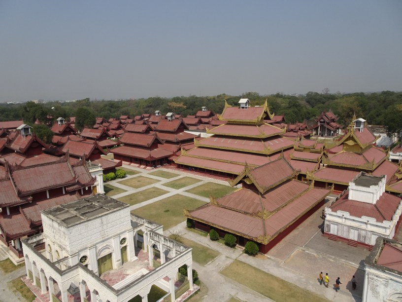 Tocmai la palatul regal am mers după ce am coborât de pe deal. Am observat că șoferul meu nu era foarte incantat să mă ducă acolo, mi-a zis că nu e chiar cel mai interesant loc. Motivul pentru care localnicilor nu le e drag de loc palatul este că acolo și-a stabilit armata sediul din Mandalay, zona din împrejur fiind plină de cazarme și barăci ale soldaților care locuiesc acolo. Armata nu le deloc dragă localnicilor datorită atrocităților comise în trecut dar și datorită averilor uriașe pe care le deține. Am trecut prin mai multe filtre și controale pentru a ajunge la palat. Mandalay Royal Palace a fost construit în preajma anului 1860 de către regele Mindon. Bombardamentele din timpul celui de-al doilea război mondial au distrus cea mai mare parte din clădiri, dar toate au fost reconstruite de armată în anii ’90. Chiar înțelegând că mare parte dintre clădiri nu sunt decât o replică a palatului inițial, locul mi s-a părut fascinant, vizita fiind ca o călătorie în timp. Palatul mi-a adus cumva aminte de Orașul Interzis din Beijing. La finalul vizitei am urcat în turn de unde se poate vedea perfect arhitectura complexului.