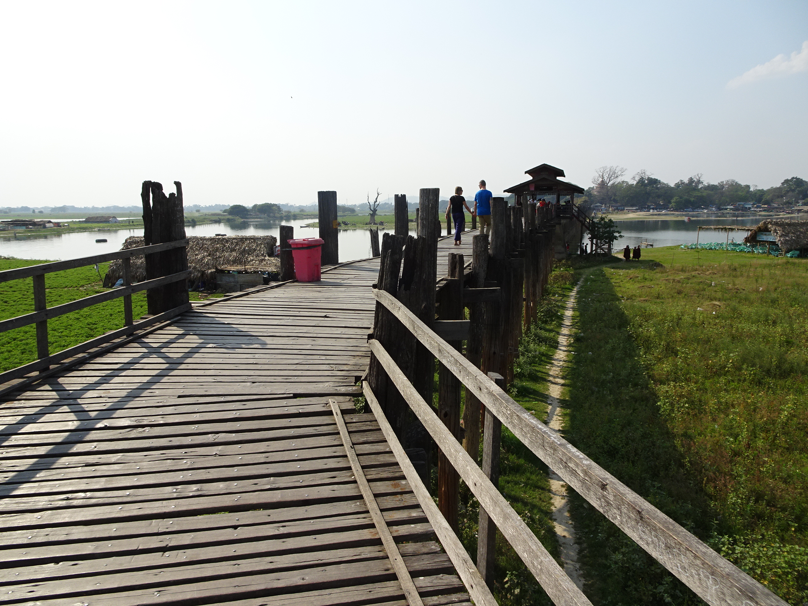 După sesiunea de cumpărături am părăsit Mandalay și ne-am îndreptat spre sud către satul Amarapura. Am mers vre0 oră pe un drum de țară foarte aglomerat unde am observat multe vehicule care mai de care mai încărcate cu oameni. Soe, originar din Amarapura, mi-a povestit mai multe despre istoria satului. Marea atracție turistică din Amarapura este podul U Bein, un pod de lemn fascinant lung de peste un kilometru. Aceasta traversează lacul Thaungtaman și leagă satul de o importantă școală budistă. Podul construit din lemn de tec arată fascinant fiind sursa unora din cele mai comune fotografii care reprezintă Myanmar-ul. Pe timpul sezonului ploios, nivelul apei crește foarte mult, iar podul devine singura legătură dintre cele 2 părți ale lacului. Eu am vizitat în sezonul uscat când lacul este mult mai mic. Era după amiază și căldura era sufocantă, peste 35 de grade. Am primit de la șofer o umbrelă care m-a ajutat să mă feresc oarecum de soare. Am mers cam o oră dus întors pe pod, iar la jumătatea drumului am făcut un popas la o terasă la umbră ca să mai rezist căldurii. Podul tremură la pașii mai grei iar undele scânduri mai vechi de tec trosnesc când calci pe ele, dar cumva reușește să reziste de peste o sută de ani. Imaginile sunt minunate, un deliciu pentru orice fotograf. Am făcut multe poze, dar am dat și de mai multi localnici care m-au rugat să fac o poză cu ei. Mi-am făcut și niște prieteni un grup de tineri călugări budiști foarte glumeți care vorbeau bine engleză.
