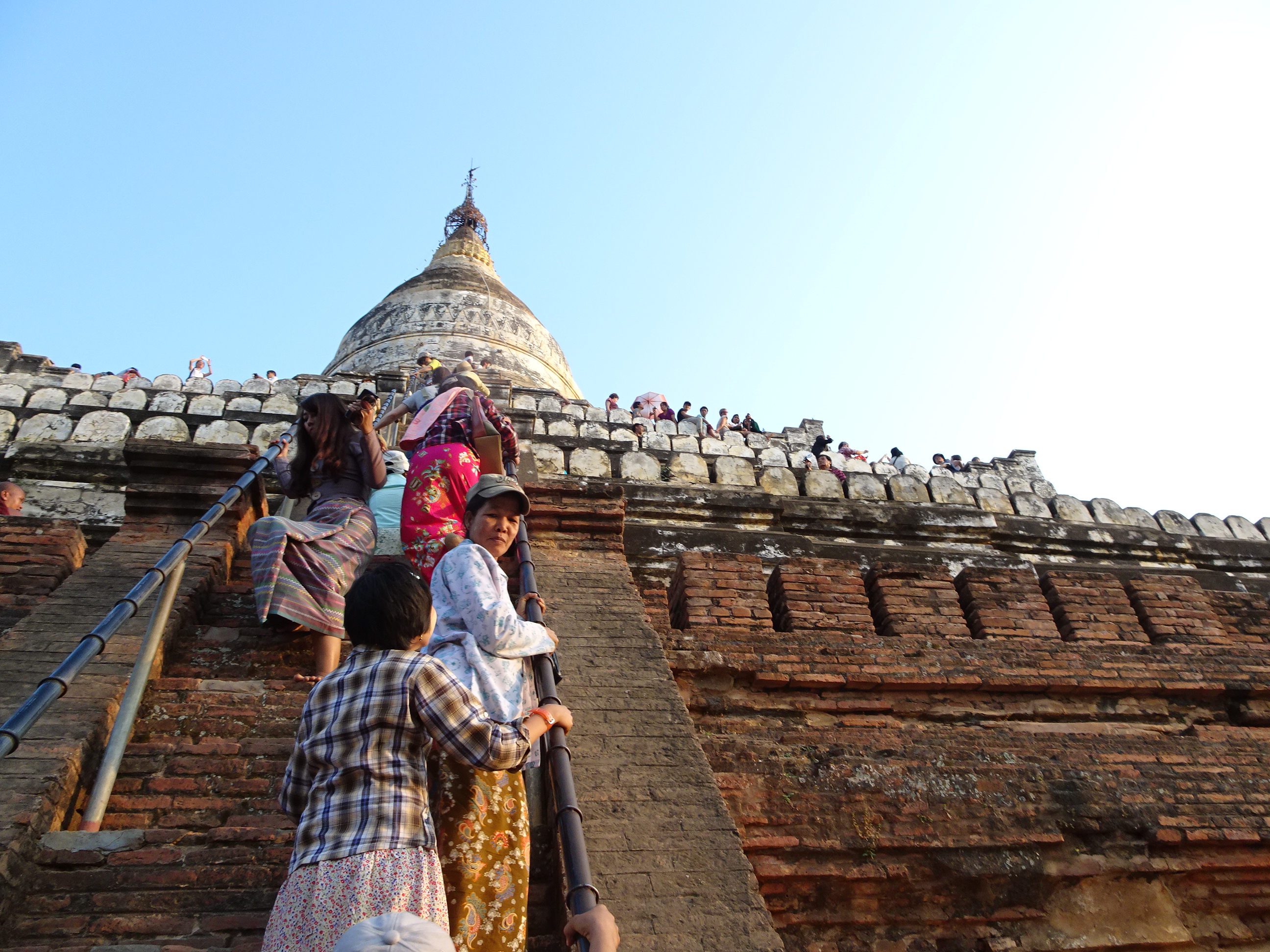 După o zi lungă în care am vizitat o mulțime de stupe și pagode am ajuns la templul apusului unde cu o jumătate de oră înainte de asfințit erau mai multe mașini parcate decât am văzut în tot orașul. Templul se numește Shwe San Daw și poate prin coincidență sau nu, sună foarte apropiat cu „see sun down”, iar asemănarea este exploatată la maxim de ghizii locali. Dincolo de nume, templul are tot ce trebuie – e printre cele mai înalte și are mai multe etaje cu terase spațioase care pot găzdui câteva sute de vizitatori. Cum spuneam era aglomerație mare când am ajuns. Sute de turiști străini desculți încercau să își găsească un loc bun urcând pe treptele abrupte ale templului. La ultimul etaj era plin, nebunie de selfie-uri și camere cu obiective cât mai mari care de-abia își găseau locul să facă o poză. Eu am găsit un loc liniștit la un etaj mai jos unde vederile erau la fel de frumoase. Ce e drept, la tropice apusurile sunt parcă mai deosebite pentru că soarele coboară mult mai brusc și creează culori unice. Puteți vedea mai jos cum arată apusul la Bagan.