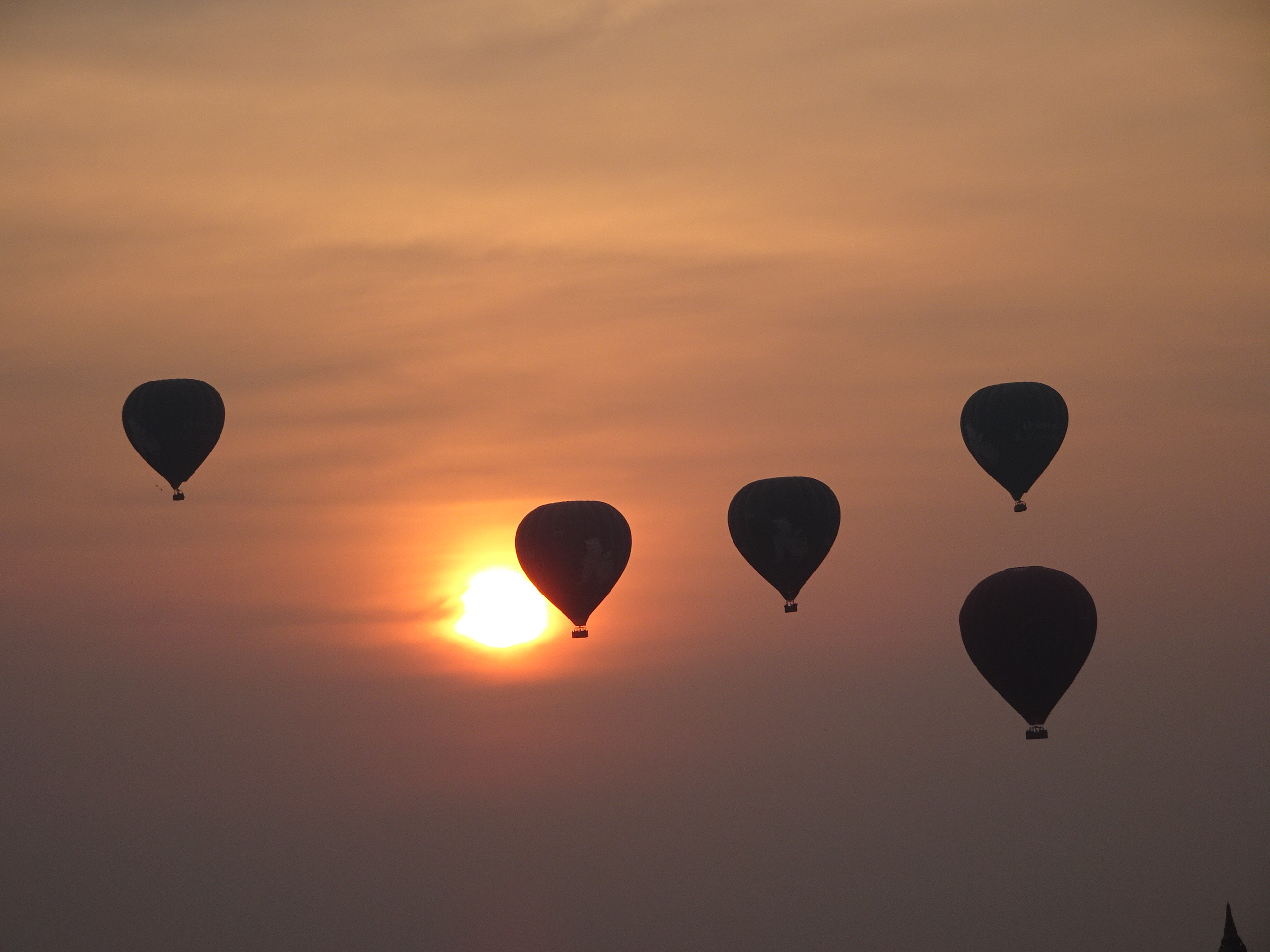 Dimineața la 6 fără ceva am plecat la drum pe întuneric. Am mers cu mașina vreo 15 minute până la templul Lowka Ou Shang. De data aceasta nu am mers la unul din templele mari unde probabil era mai aglomerat ci la unul pe care „doar șoferul meu îl știa”. Când am urcat pe templu am realizat că mai știau de el cel puțin încă vreo 20 de turiști, dar nu era o problemă, era destul spațiu pentru toți. Locul de decolare al baloanelor nu este cunoscut din timp, ci este ales zilnic altul în funcție de condițiile atmosferice. Se pare că acest templu permite mereu observarea lor în zbor indiferent de punctul de plecare. Baloanele decolează cam în același timp cu răsăritul când aerul e încă rece și temperatura le permite să se ridice. Imaginea cu soarele la orizont și zecile de baloane colorate brăzdând cerul peste templele de culoarea focului vă pot spune că o să-mi rămână mereu în amintire. E ceva minunat. Am stat vreo oră acolo și am făcut o mulțime de poze.