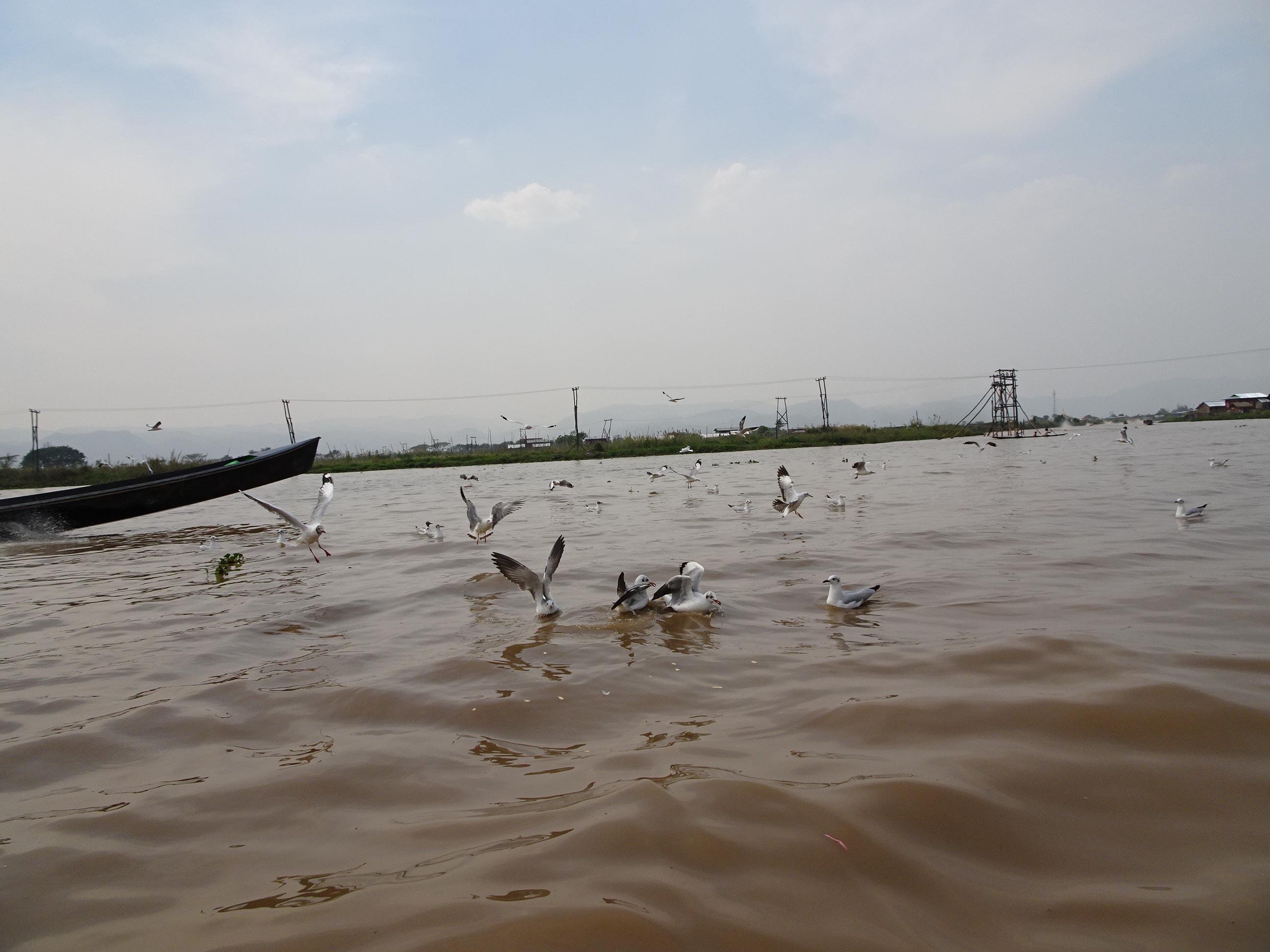 Am trecut din nou printre impresionantele grădini de legume pe apă, am urmărit pescari în acțiune și am hrănit sute de păsări pe lac. Am vizitat apoi două mari mănăstiri de pe Inle. Mai întâi am mers la Phaung Daw, cea mai mare pagodă de pe lac unde se „construiesc” 3 statui ale lui Buddha din aur masiv. La Phaung Daw se fac și mari procesiuni pe apă în timpul festivalurilor anuale. Nu am prins un festival, dar am văzut adăpostită marea barcă aurită care conduce cortegiile. Am oprit și la Jumping Cat Monastery, unde pe vremuri pisicile erau antrenate să sară pe acoperișuri, dar acum cu un nou stareț, pisicile stăteau cuminți la umbră.