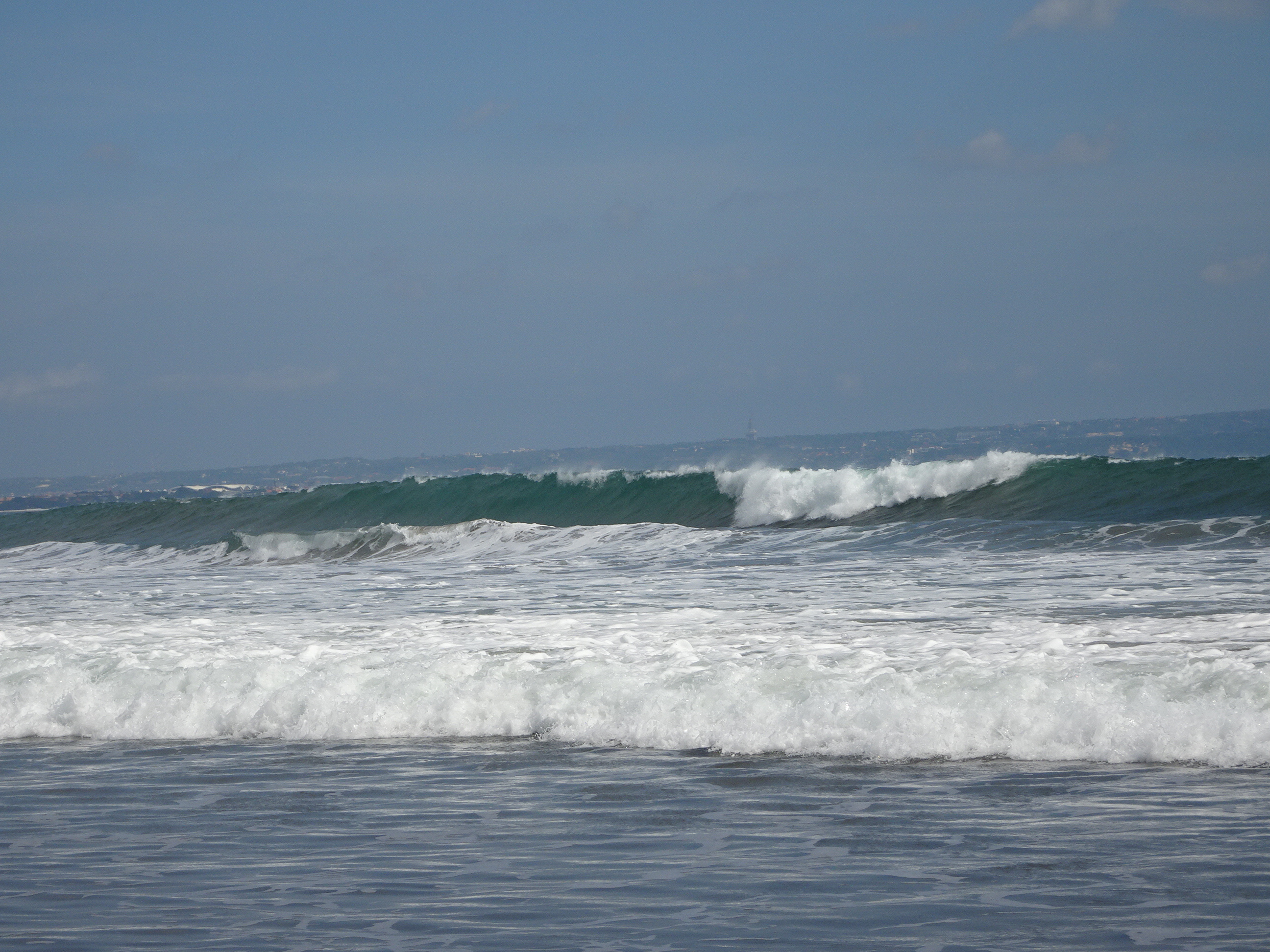 Prima zi am mers la plajă pe jos. Cum spuneam, nu am avut un hotel chiar pe plajă și erau vreo 800 de metri distanță. După o plimbare pe străzile aglomerate din stațiune am ajuns pe o plajă vastă, lungă de vreo 5 kilometri unde spre surprinderea noastră nu era aproape nimeni. Maxim 20-30 de oameni pe întinderea vastă de nisip. Vremea era ideală, 28 de grade și apa foarte caldă dar lumea nu prea se înghesuia. O problemă pe plaja sudică erau valurile, foarte puternice, care erau poate potrivite pentru surfing, mai puțin pentru o baie în mare. Nisipul era fin dar nu extrem de curat. Noi am stat în apă destul de aproape de mal, nu ne-am aventurat prea mult prin valurile puternice. Oricum erau steaguri roșii arborate la mal, dar chiar și așa se mai găseau câțiva temerari să se încumete printre ele. Mai spre amiază am observat puterea mareelor când au apărut dintr-o dată valuri puternice care au ajuns chiar până la prosoapele noastre puse la distanță mare de mal. Într-un interval de 5-10 minute marea s-a deplasat câteva zeci de metri spre mal.