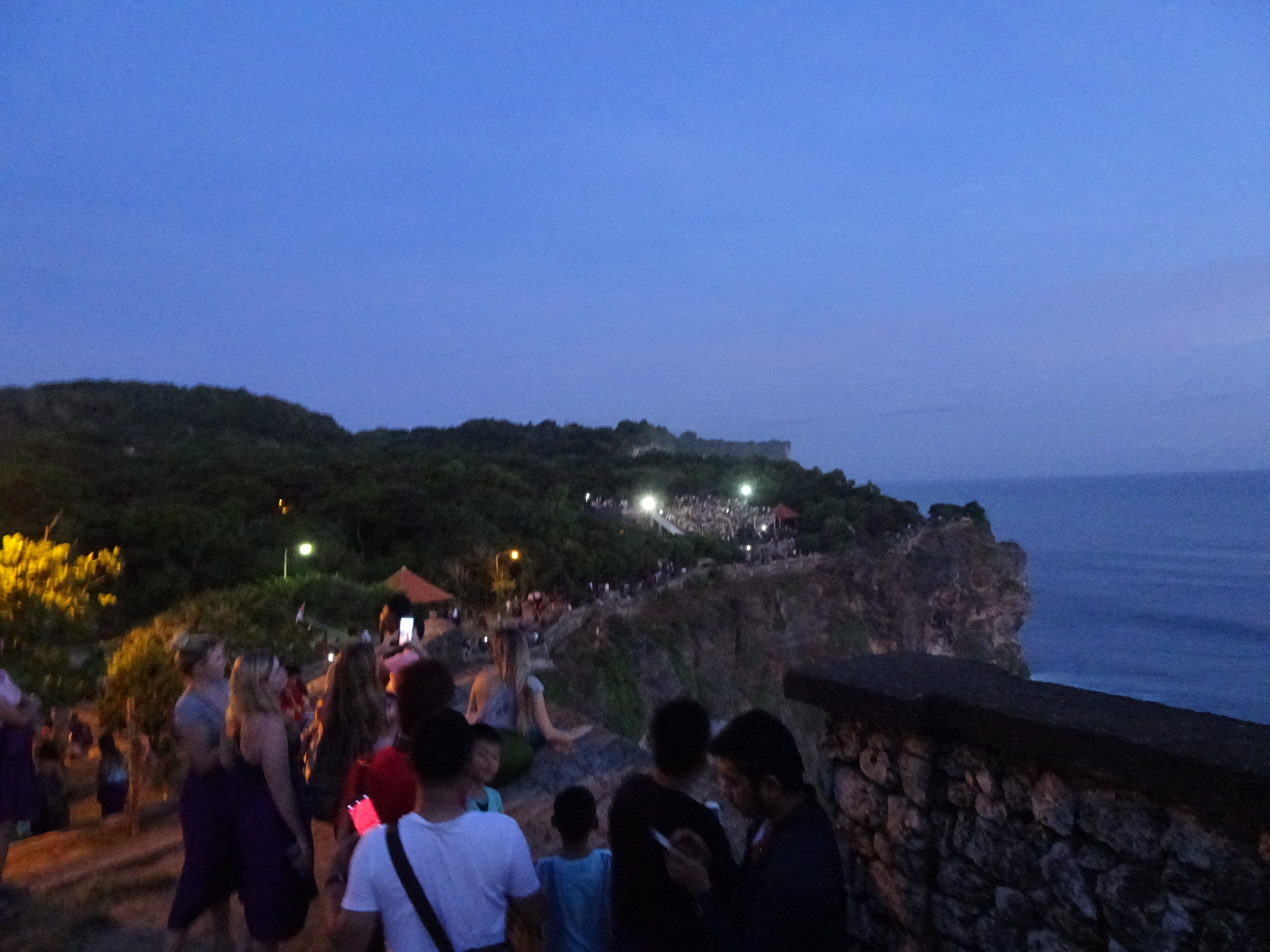 Excursia era la templul Uluwatu, un loc preferat de turiști pentru a vedea apusul. Toți turiștii merg să vadă apusul de obicei la unul din templele de pe malul mării. Așa am descoperit noi traficul de apus. Mergând bară la bară pe străzile insulei l-am întrebat pe șofer dacă e ora de vârf pentru aglomerație iar el ne-a răspuns „This is sunset traffic”. Sute de microbuze duceau turiști să vadă apusul. Am făcut o oră până la Uluwatu. Nu am apucat să ajungem la templu la timp dar am făcut o oprire mai aproape la o frumoasă plajă din Labuan făcută faimoasă de filmul Eat, Pray, Love. Am urmărit cum soarele coboară în mare și apoi am continuat drumul spre templu. Am ajuns la Uluwatu aproape pe întuneric dar chiar și așa am putut admira culorile cerului și peisajul stâncilor din jurul templului. Dincolo de a fi loc de privit apusul, templul arată foarte bine și găzduiește câteva sute de maimuțe. Majoritatea sunt prietenoase, dar am văzut și unele agresive față de turiști și am preferat să păstrăm distanța. Tot la Uluwatu are loc în fiecare seară un spectacol de dans tradițional – Kecak, sau dansul focului. Am ajuns târziu și acolo și am prins doar finalul. Pun totuși un video de pe net mai jos filmat chiar la Uluwatu să vedeți despre ce e vorba.