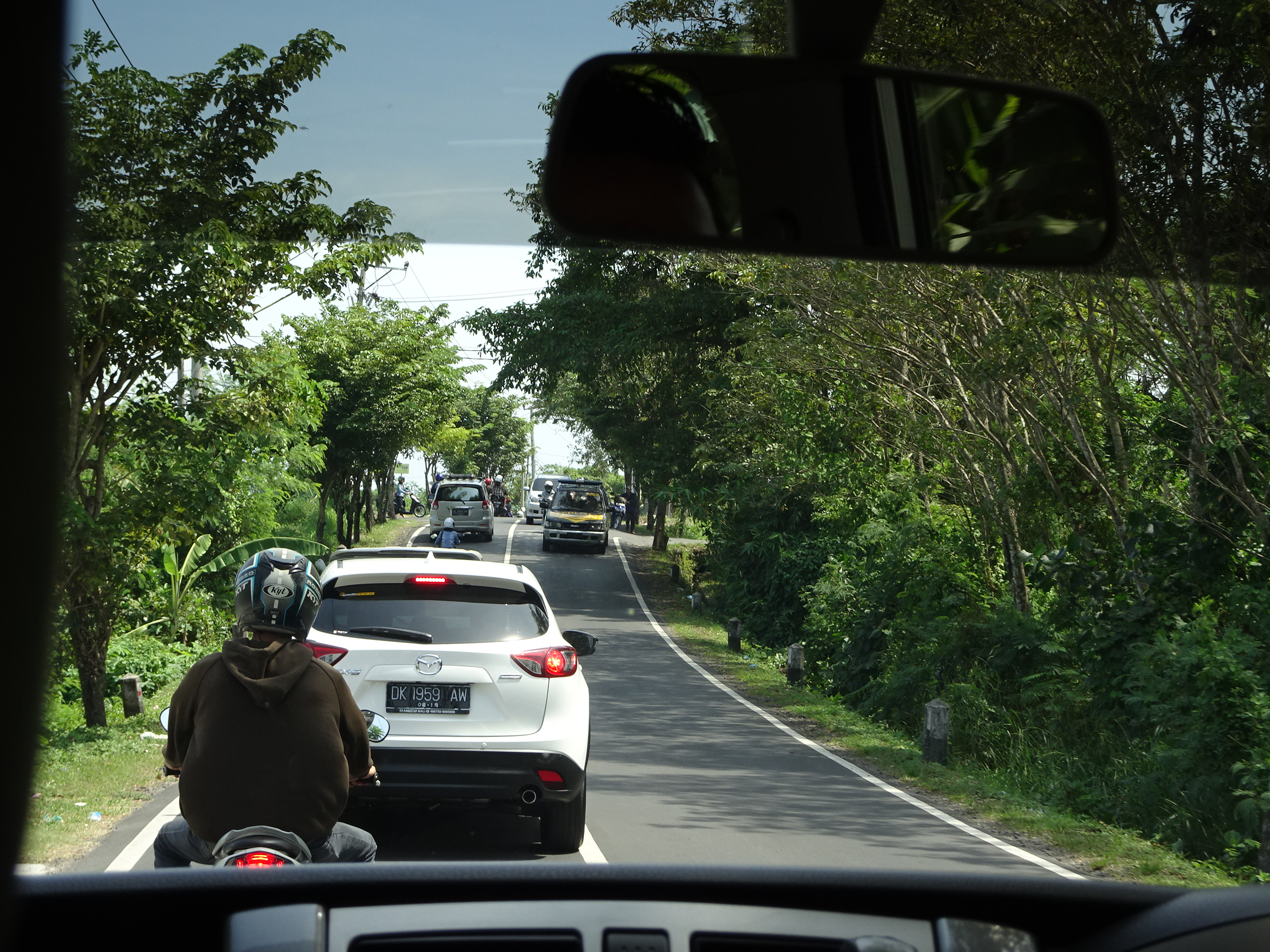 După o zi petrecută la Singapore am aterizat pe aeroportul din Denpasar pe la 8 seara. Am trecut imediat de controlul pașapoartelor (de la 1 ianuarie 2016 românii nu au nevoie de viză în Indonezia), am luat bagajele și ne-am întâlnit cu șoferul hotelului care ne aștepta la sosiri. Pe hartă părea că hotelul nostru e foarte aproape de aeroport. Nu erau decât 10 kilometri de mers și ne gândeam că vom ajunge în cameră imediat. Asta până am descoperit traficul de Bali… După jumătate de oră de mers (vorba vine, mai mult am stat) printr-un blocaj haotic nu făcusem nici jumătate din drum. Am ajuns după cam 45 de minute în total la hotel, timp în care nu am depășit 20-30 km/h.