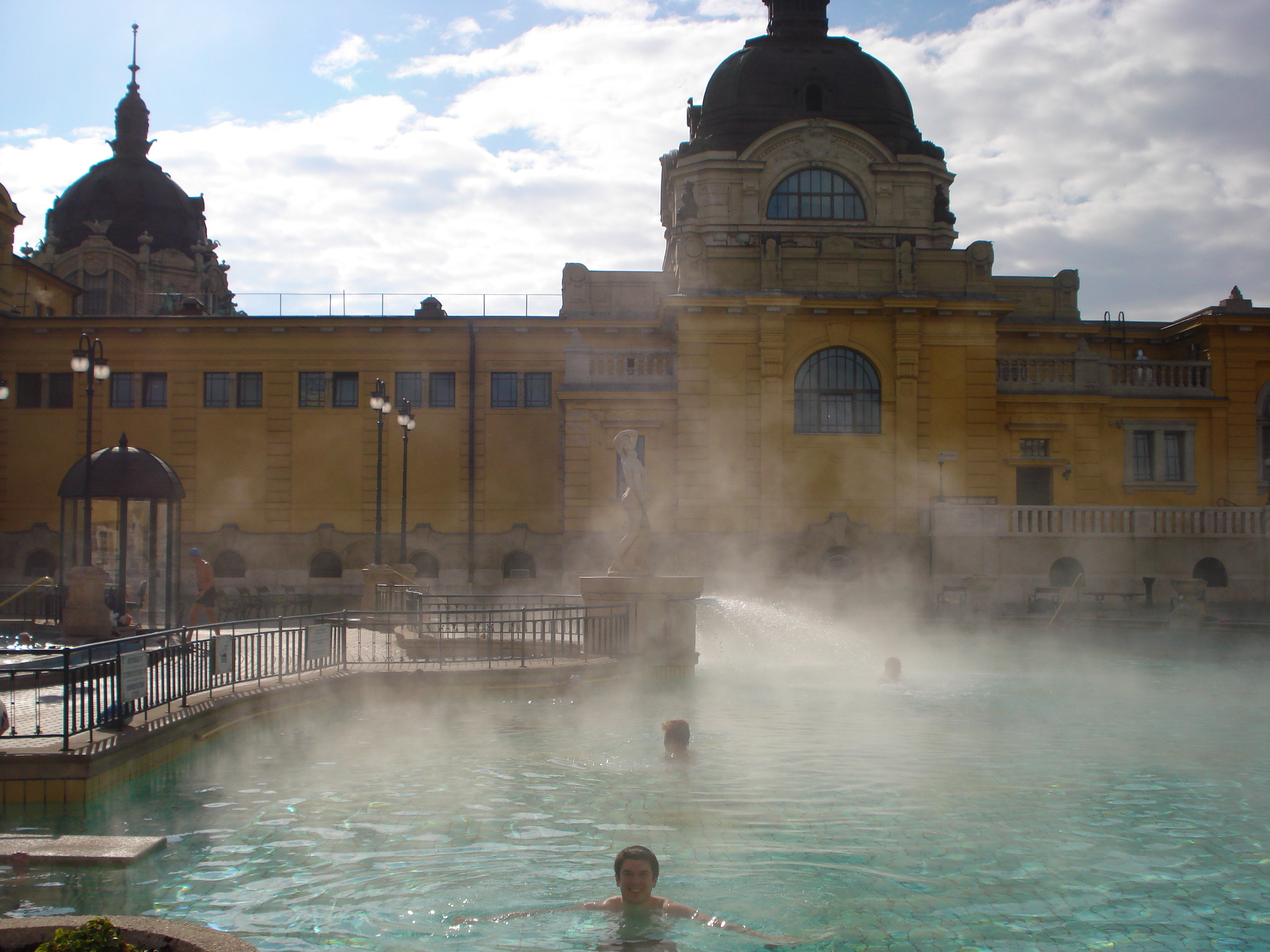 - Băile Szechenyi se află în apropiere de Piața Eroilor. Similar ca la Gellert sunt mai multe piscine iar aici se poate face și saună și masaj. Diferența este că zona cea mai amplă de la Szechenyi este la exterior unde se găsesc 3 piscine mari cu temperaturi de 32-38 de grade Celsius și acestea sunt deschise tot timpul anului. Un bilet costă 5.200 de forinți sau 10.000 cu masaj inclus.
