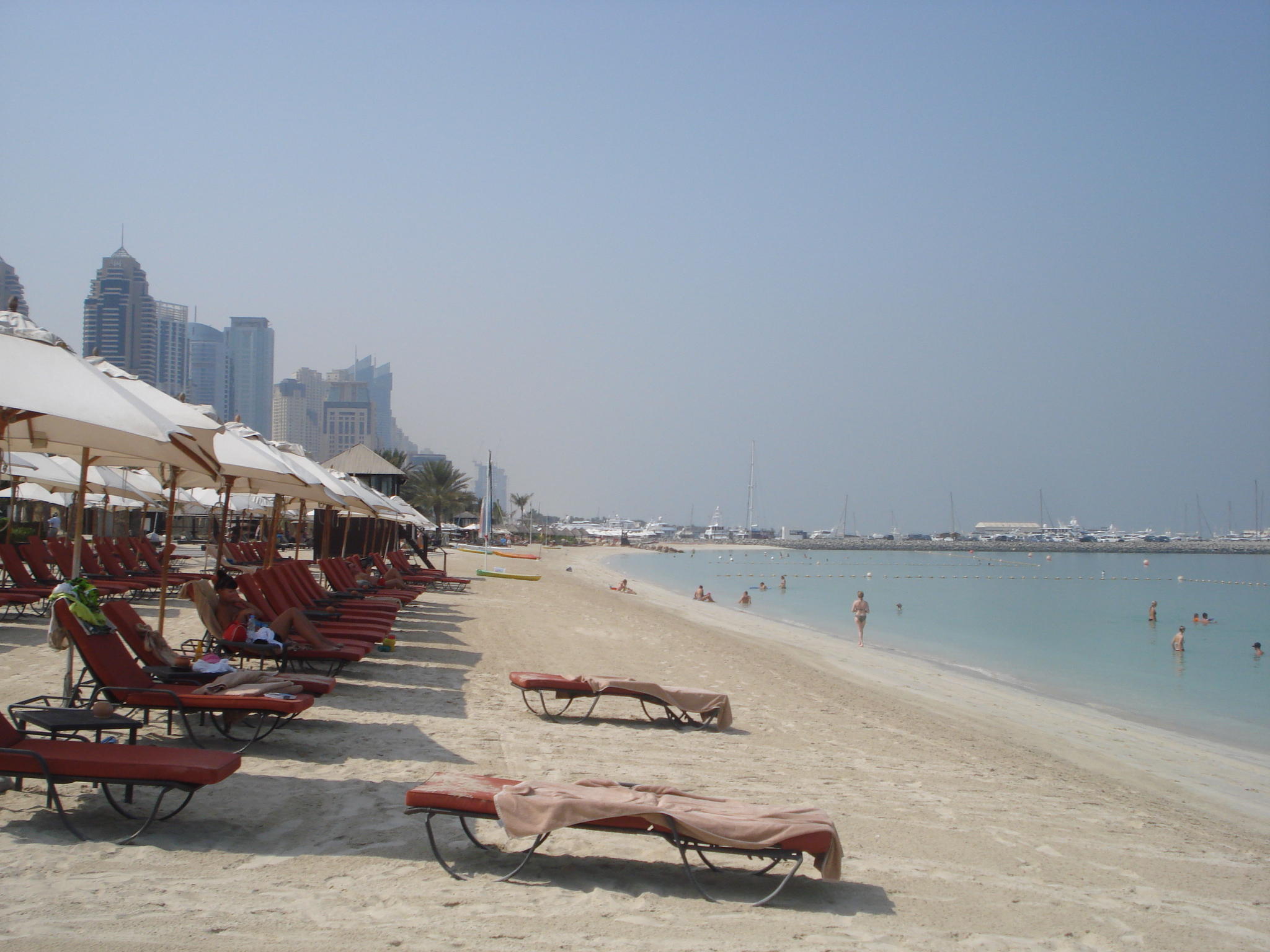 - Plajă. Există plaje exclusive ale hotelurilor dar și câteva plaje publice accesibile tuturor precum Jumeirah Beach, Marina Beach sau Burj al Arab public beach. Toate cele menționate oferă pe lângă mare o vedere frumoasă a hotelurilor din jur. Trebuie să știți că plajele sunt artificiale (nisipul e adus din deșert) iar marea nu prea are valuri. De obicei există șezlonguri doar la plajele amenajate ale hotelurilor. Peste tot este permis costumul de baie, dar puteți vedea și localnice în apă îmbrăcate din cap până în picioare. Apa mării este relativ rece iarna (dec-ian) și fierbinte ca un jacuzzi vara (mai-sep.). În restul anului e numai bună de baie.