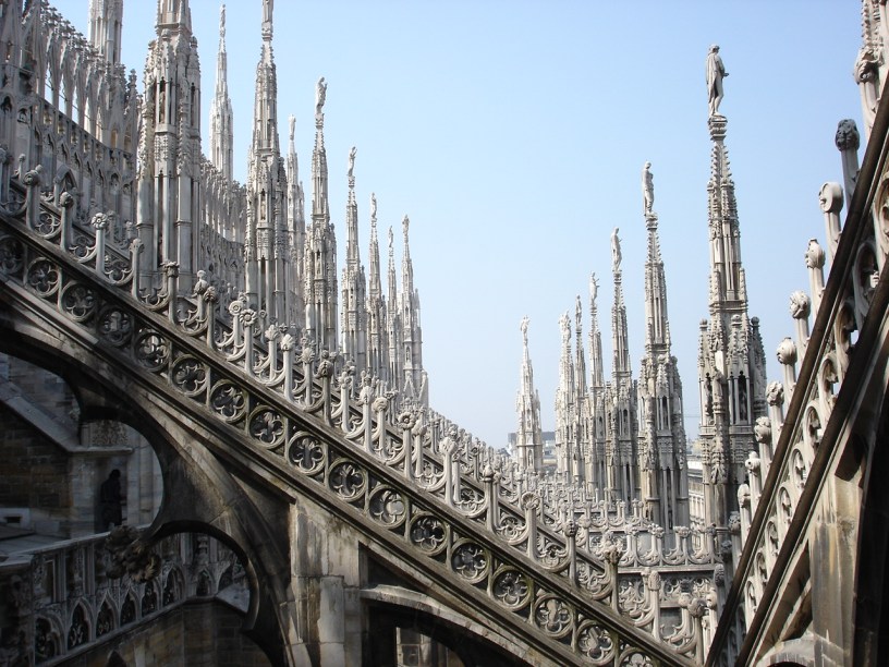 Marea piață Duomo este centrul orașului – locul unde localnicii se întâlnesc la terasă pentru a bea un espresso sau a servi cina și unde turiștii se adună pentru a merge la cumpărături sau pentru a vizita marea catedrală. Noi nu venisem la cumpărături așa că ne-am pus la coada de bilete la Duomo. Am cumpărat bilete pentru acoperiș dar mai întâi am asistat la slujba de Paște în catedrală. A fost o ceremonie impresionantă la care au asistat mii de persoane. Am mers apoi pe acoperiș de unde se poate vedea una din cele mai frumoase priveliști peste oraș. Domul din Milano este unul din cele mai impresionante exemple de arhitectura gotică, iar cele mai impresionante detalii ale construcției se pot observa pe acoperiș. Se poate urca pe scări sau cu liftul (cost suplimentar) iar de sus se vede bine toată piața și orașul până la mare depărtare. Era senin și se vedeau și vârfurile Alpilor.