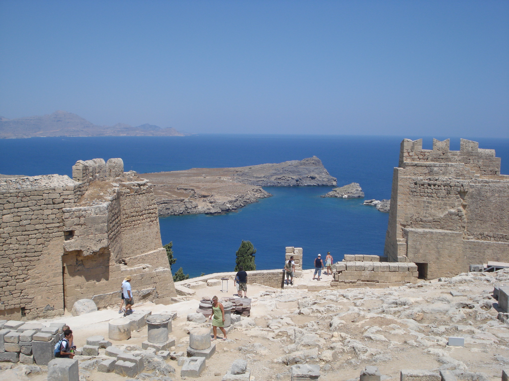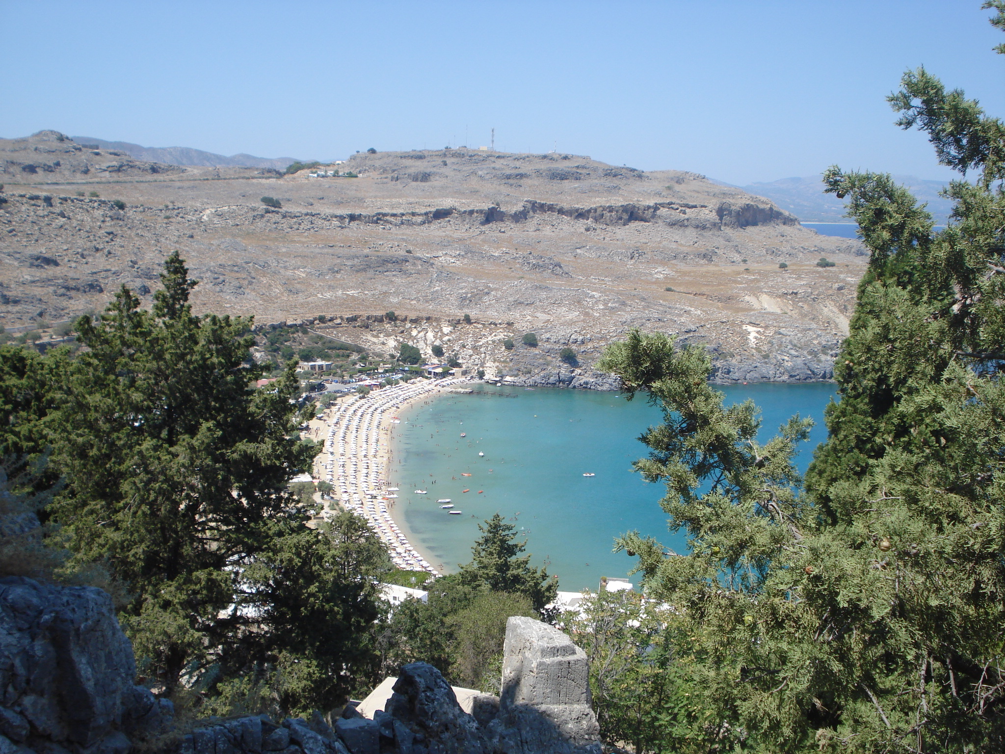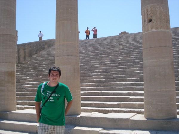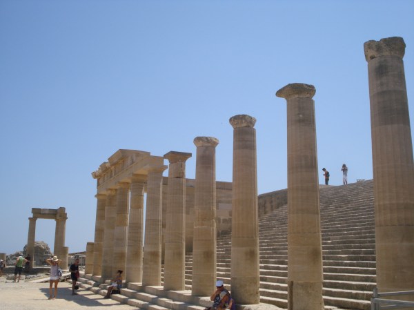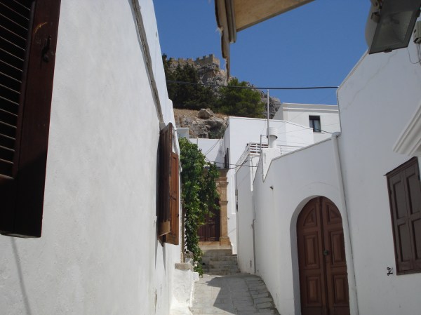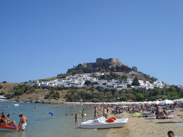 Mai departe am ajuns cu mașina pe coasta estică, în satul Lindos. Acesta este unul din cele mai vechi din Rodos și una din principalele destinații turistice. Nu este permis accesul cu mașina în sat și există parcări amenajate la marginea localității. Se poate merge pe jos sau se poate închiria un măgar. Am preferat să mergem la pas spre cetate. Satul este de o frumusețe unică. Toate casele sunt văruite alb, iar la fiecare colț se poate găsi un magazin de suveniruri, un atelier sau o terasă. Fiecare casă este frumos decorată, cu ferestre vopsite colorat și cu flori la balcoane. Din sat am urcat spre vârful muntelui. A fost o urcare dificilă pe o pantă abruptă și fără umbră la aproape 40 de grade Celsius. Efortul a meritat pentru că vederile de sus sunt fantastice peste golful St. John și peste sat. Cea mai importantă construcție din Lindos este acropolis-ul care datează din secolul 4 I.e.n. din timpul perioadei doriene când Lindos era unul din cele mai importante orașe din Pelopones. Din acropolis mai stau în picioare templul doric al Atenei și Propylea sanctuarului – o uriașă scară care ducea către vârful muntelui. Revenind jos în sat, ne-am reîncărcat cu o gustare proaspătă în port iar apoi am petrecut amiaza pe plajă. Pot spune că plaja din Lindos este cea mai frumoasă de pe insula Rodos, cu nisip fin alb, apă cristalină și o vedere minunată spre acropolis. Am plecat spre seară, dar înainte să ajungem la hotel, am mai oprit la o altă plajă deosebită a insulei – plaja Anthony Quinn de lângă Faliraki, redenumită așa după ce actorul a filmat mai multe scene din „Turnurile din Navarrone” acolo.
