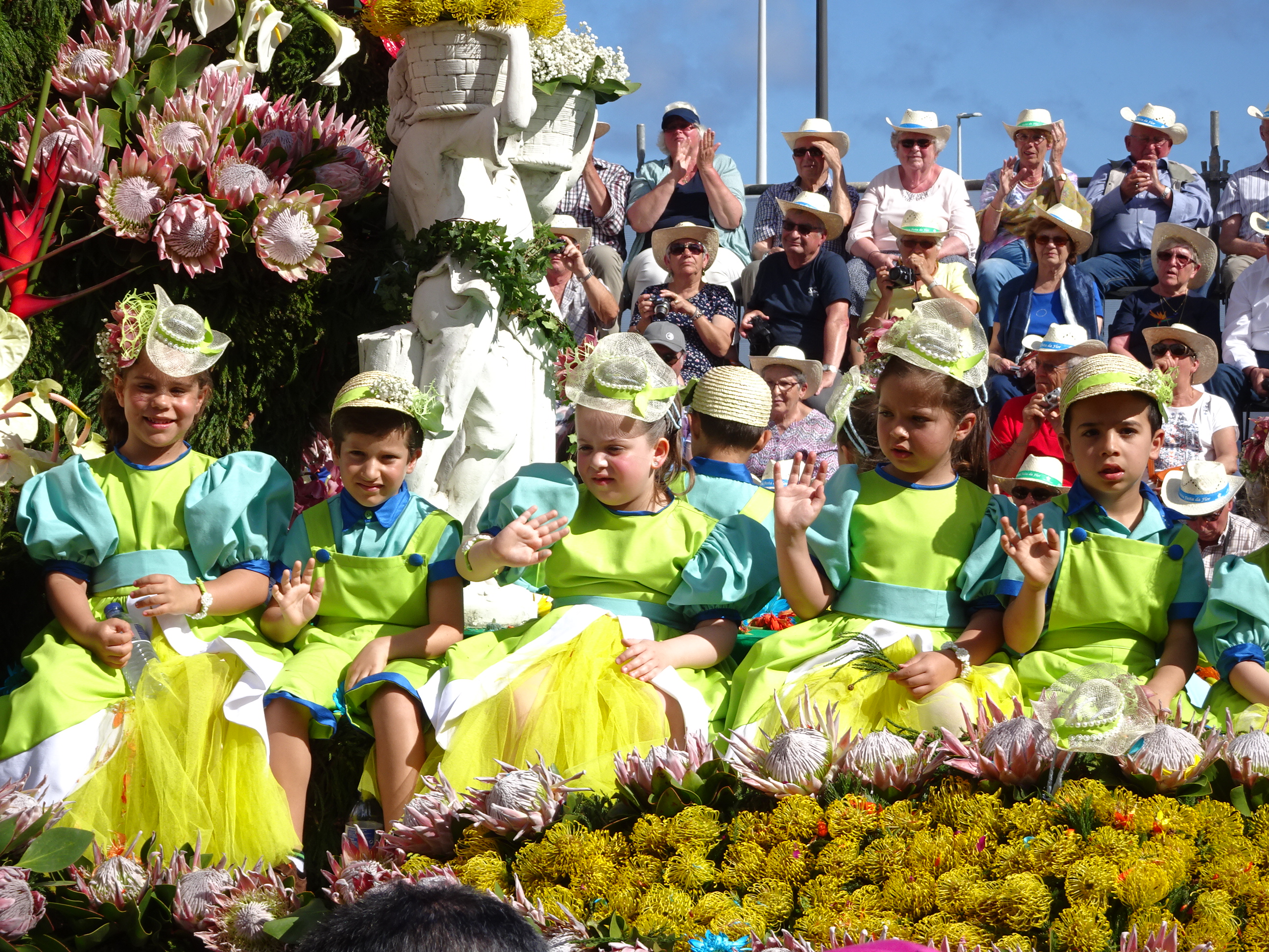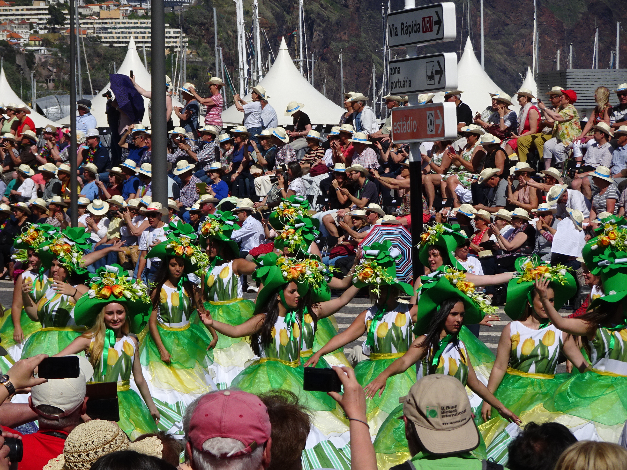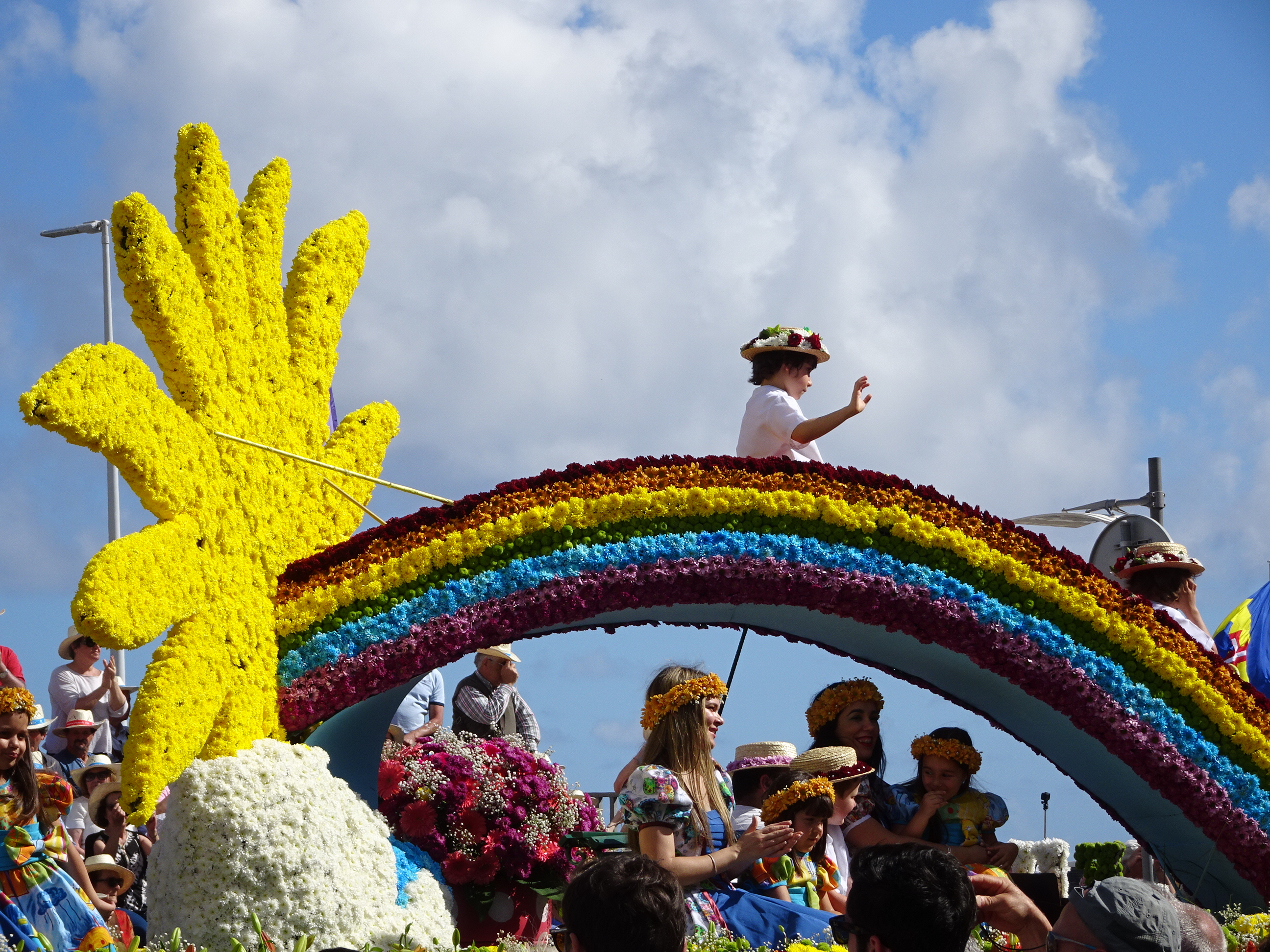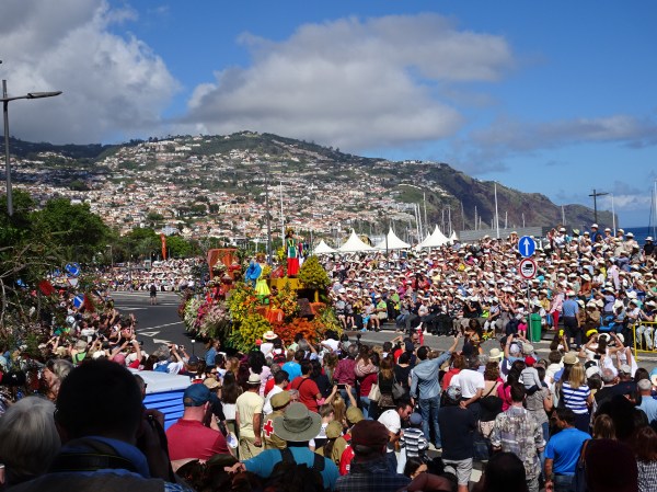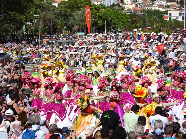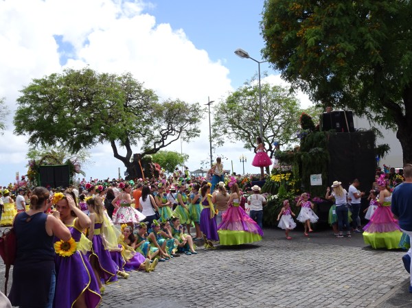 La 4 fix a început parada și muzica. Defilarea are loc pe Avenida do Mar, bulevardul de pe malul Atlanticului, iar în zona centrală a sa erau amenajate mai multe tribune pentru spectatori. Biletele nu erau scumpe, dar se rezervă cu mai multe săptămâni înainte și nu am mai găsit nimic disponibil. Am stat astfel pe marginea paradei între mii de alți oameni veniți să o vadă. Carele alegorice aparțineau de instituții foarte diverse – începând cu Primăria din Funchal, universitatea Madeira și continuând cu oficiul de turism al Africii de Sud sau o scoală de samba din Brazilia. Fiecare are mesajul său, muzica și coregrafia proprie, dar tema centrală sunt florile – milioane de flori care decorează carele de paradă și costumele dansatorilor. A durat în total vreo două ore. Căldura era foarte puternică și nu am stat chiar până la final, dar am reușit să vedem toate carele alegorice. E ceva unic de văzut. Am făcut o mulțime de poze, iar câteva din ele le puteți vedea mai jos să vă faceți o idee.