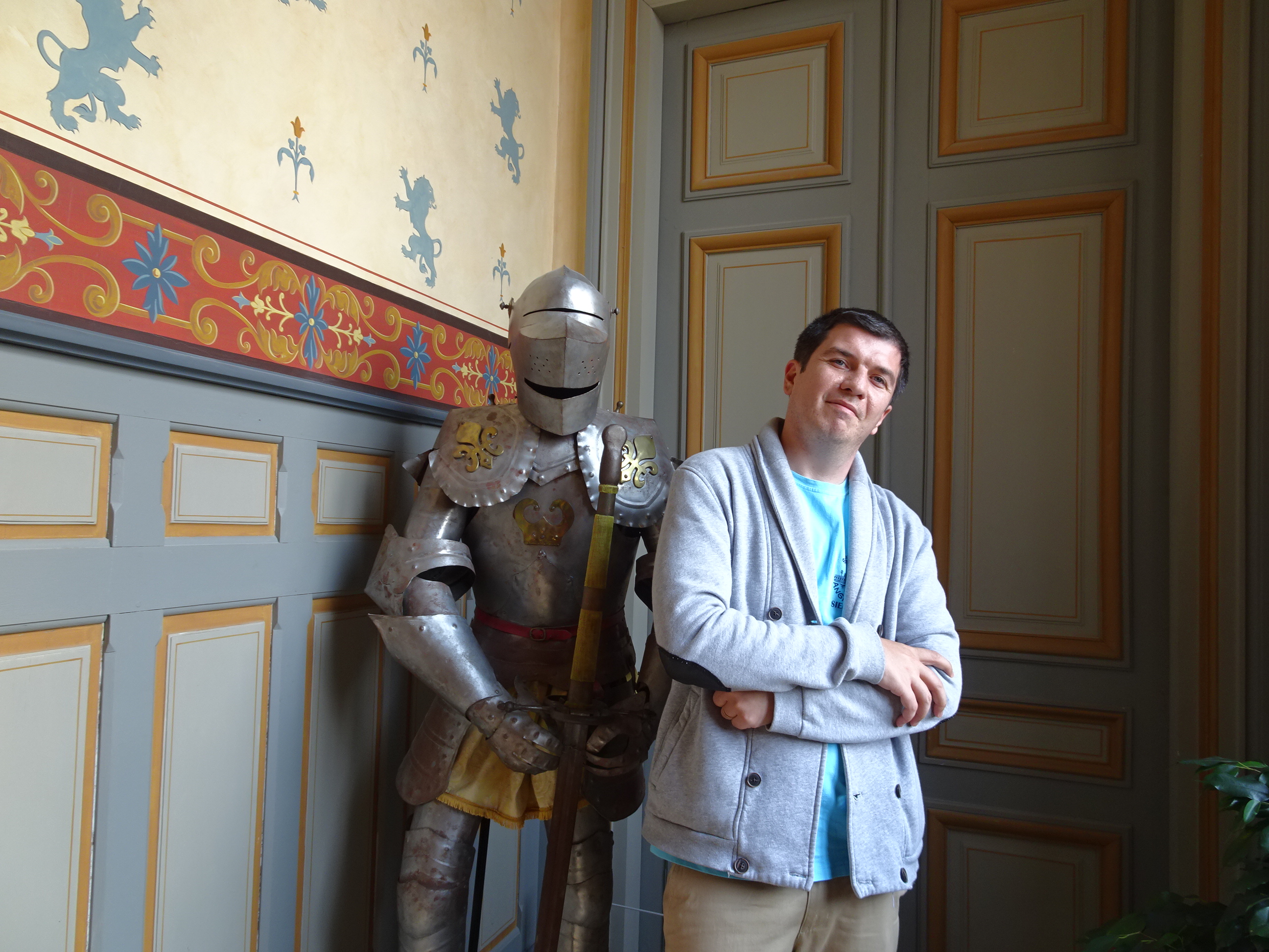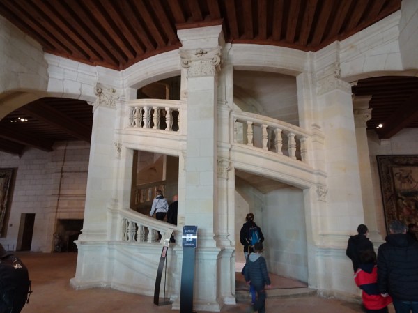 Am dat de o aglomerație mare la castel. Există 3 parcări de mari dimensiuni pe domeniu (cea mai apropiată de castel fiind contra cost) dar de-abia am găsit unde să lăsăm mașina. De acolo am mers ceva până la casa de bilete iar după ceva așteptare la coadă am intrat la castel (tariful întreg 13 euro). Castelul este imens, mult mai mare decât orice altceva am mai vizitat prin Loira. Interiorul are zeci de camere. Cel mai remarcabil detaliu al castelului este scara interioară dublă din mijlocul clădirii. Ea leagă cele 3 etaje și de acolo se poate ajunge pe terasă de unde se vede priveliștea peste întregul domeniu. La castel sunt expuse o colecție de armuri, de arme dar și de calești regale.