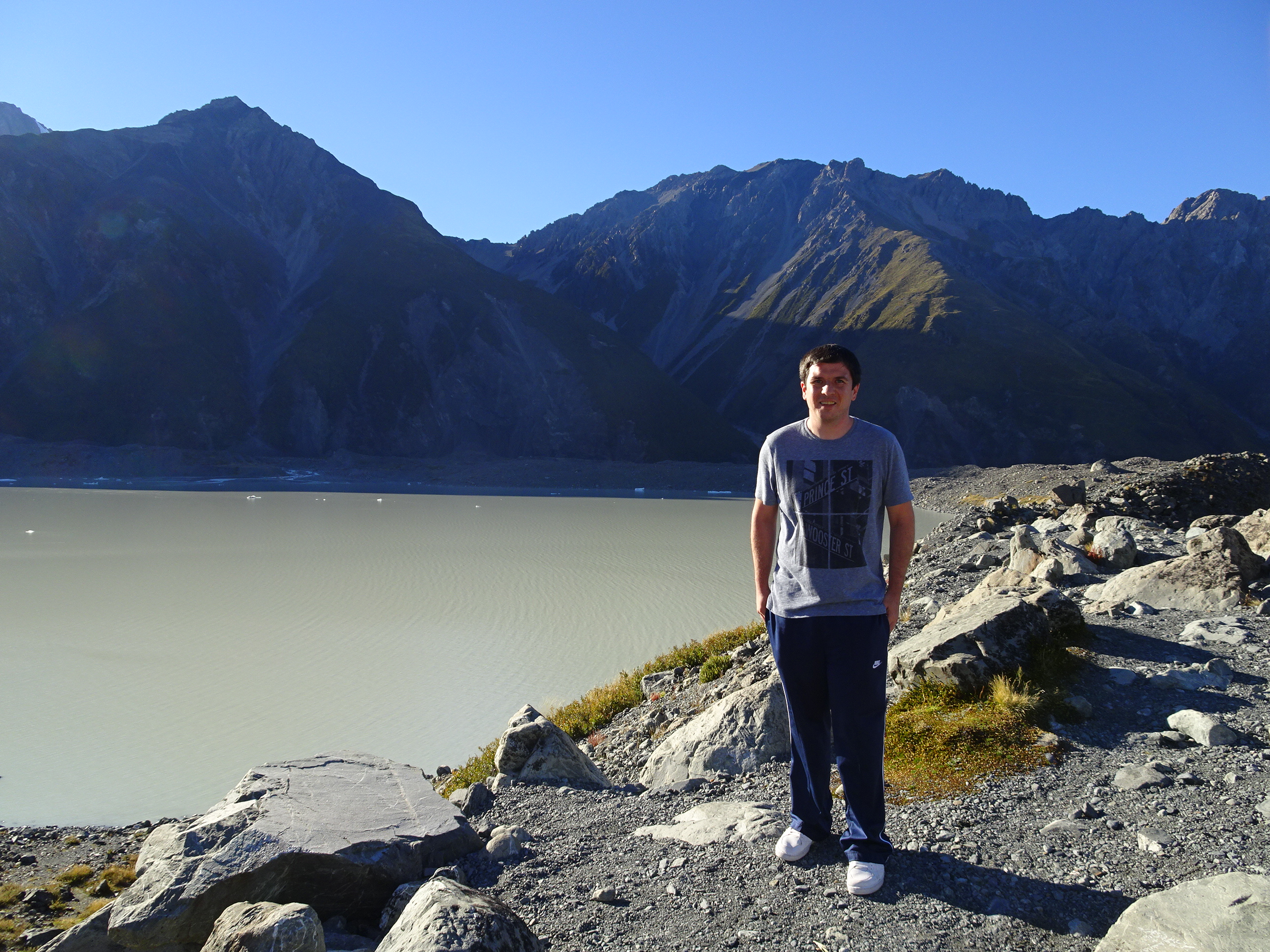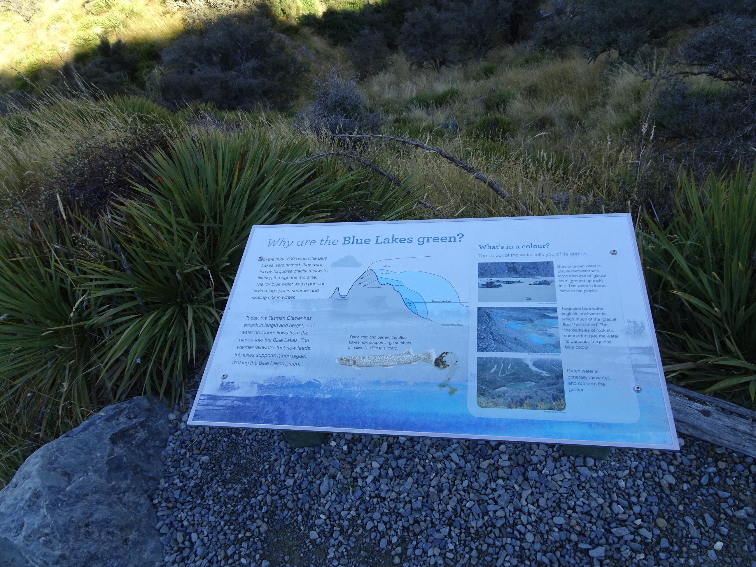 Am plecat cu mașina spre Tasman Lake aflat la vreo 5 kilometri distanță. De la parcare se merge cam 15 minute până la un prim view point de unde se vede laguna glaciară. Este un lac glaciar format din topirea ghețarului Tasman pe care plutesc sloiuri uriașe de gheață. Pe lac se pot face plimbări cu bărcile cu ghid. Am preferat să merg mai sus pe munte într-un loc de unde se vede întreg masivul. Traseul este amenajat cu scări (vreo 800 de scări) iar de pe drum se pot vedea mai multe lacuri glaciare numite Blue Lakes (în mod ironic, lacurile erau verzi; ele capătă culoarea albastră doar vara când au loc topiri masive al gheții). Panorama de sus este fantastic de frumoasă, cum puteți vedea în imaginile de mai jos, iar urcarea destul de dificilă merită tot efortul. De acolo am revenit la mașină, unde am încheiat drumeția. Era timpul să merg la aeroport.