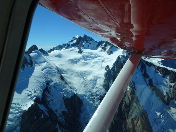 Am continuat urcarea și am ajuns deasupra platoului de gheață zburând pe lângă cele două mari vârfuri, Cook și Tasman. Peisajul era atât de frumos că uitasem de toate – de turbulențele care deveneau din ce în ce mai puternice cu cât urcam și de teamă. Imaginile care le-am văzut nu o să le uit niciodată. La un moment dat, când zburam deasupra ghețarilor, pilotul ne-a întrebat dacă vrem să aterizăm. Am zis da, fiind siguri că glumește, dar imediat a început o coborâre abruptă spre întinderea de zăpadă. A fost o surpriză fantastică, mai ales că așa cum spuneam anterior – o oprire pe ghețar nu era în plan și asemenea zboruri costau mult mai mult. A coborât schiurile avionului iar aterizarea pe zăpadă a fost neașteptat de lină.