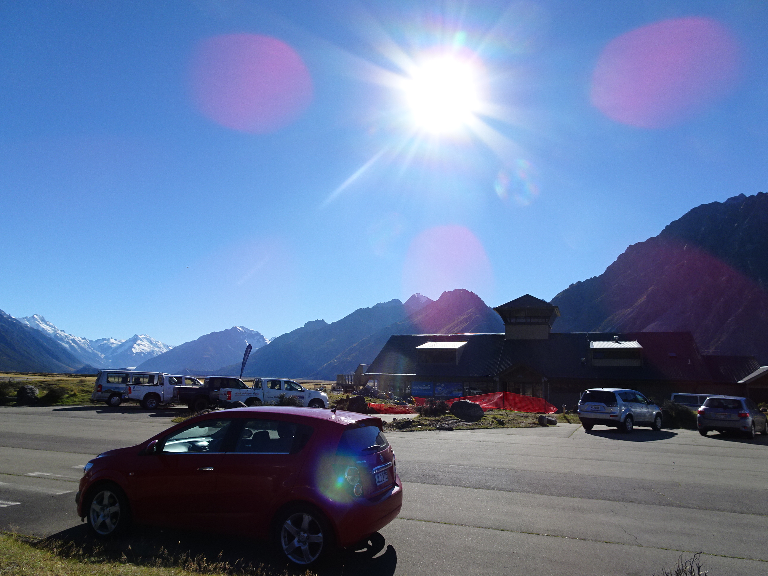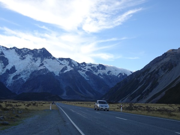 După 2 zile de plimbare cu mașina pe insula de sud văzusem niște peisaje fantastice, dar tot mai aveam multe de descoperit. Am sosit aproape de apus pe malul lacului Pukaki – lacul de culoare turcoaz – de unde se vede o priveliște magnifică a muntelui. Drumul pe malul lacului e o plăcere de condus. Am sosit la cazarea din Mount Cook Village după lăsarea întunericului și după mai multe pauze pe drum în care am oprit pentru a admira peisajul.
