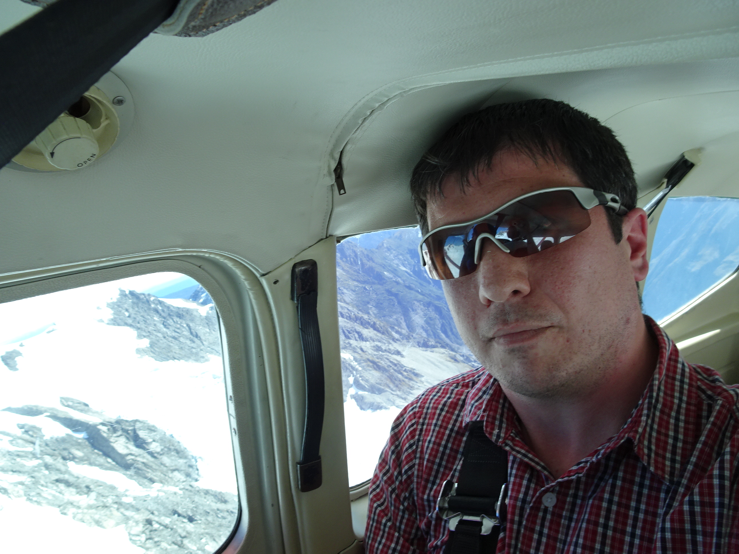 La scurt timp a început decolarea, pilotul a pornit motorul și cu mare greutate ne-am ridicat de la sol. Am stat pe locul din față din dreapta pilotul și trebuie să recunosc că (la figurat) făceam pe mine de frică. Avionul tremura din toate încheieturile la fiecare rafală de vânt mai puternică iar eu trebuia să fiu foarte atent la maneta copilotului din fața mea pe care o mai atingeam din greșeală și schimbam direcția avionului 🙂 Am zburat mai întâi peste Tasman Lake pe unde tocmai ce mersesem. Mă uitam în jos să recunosc din aer locurile văzute mai devreme.