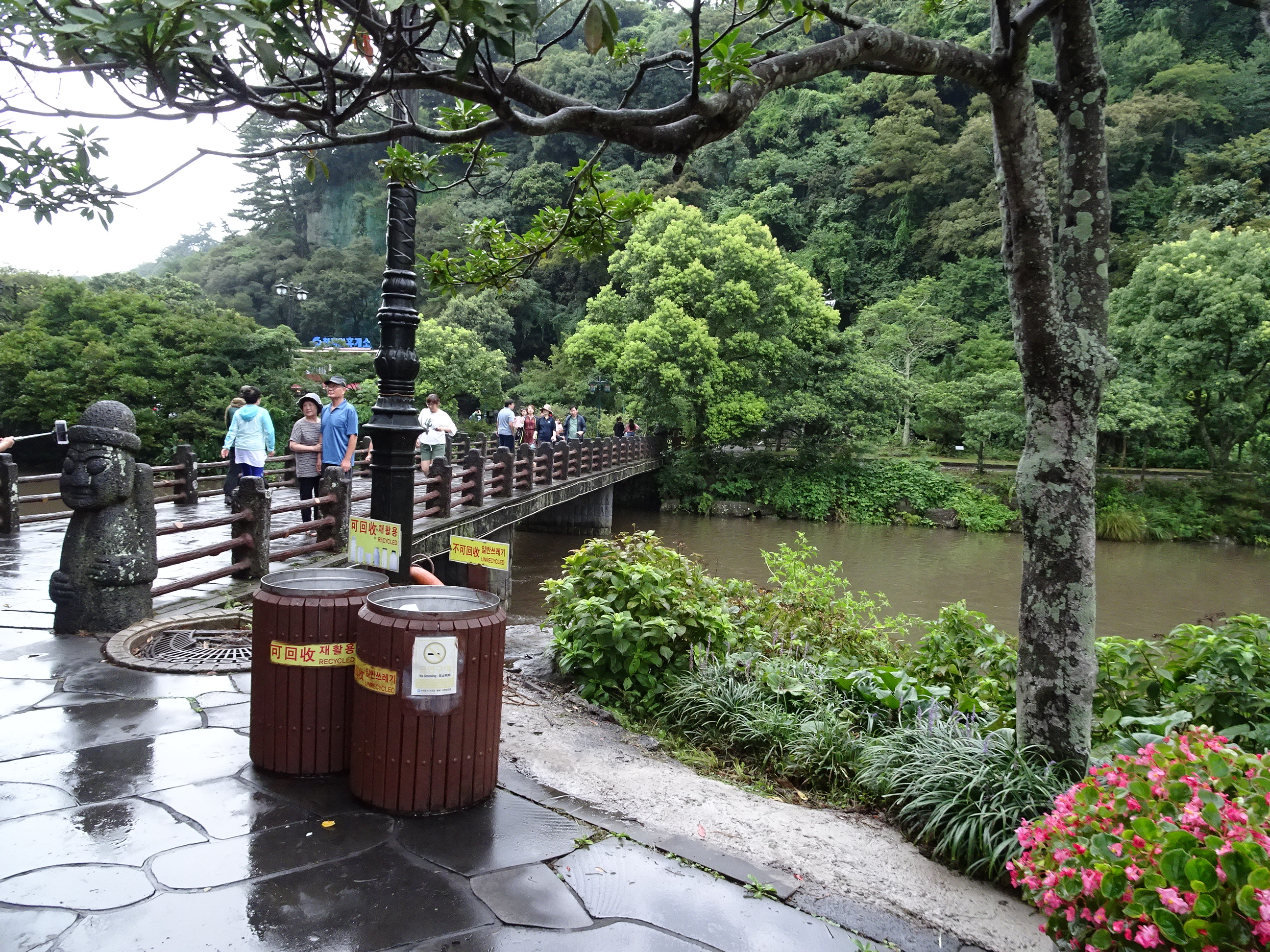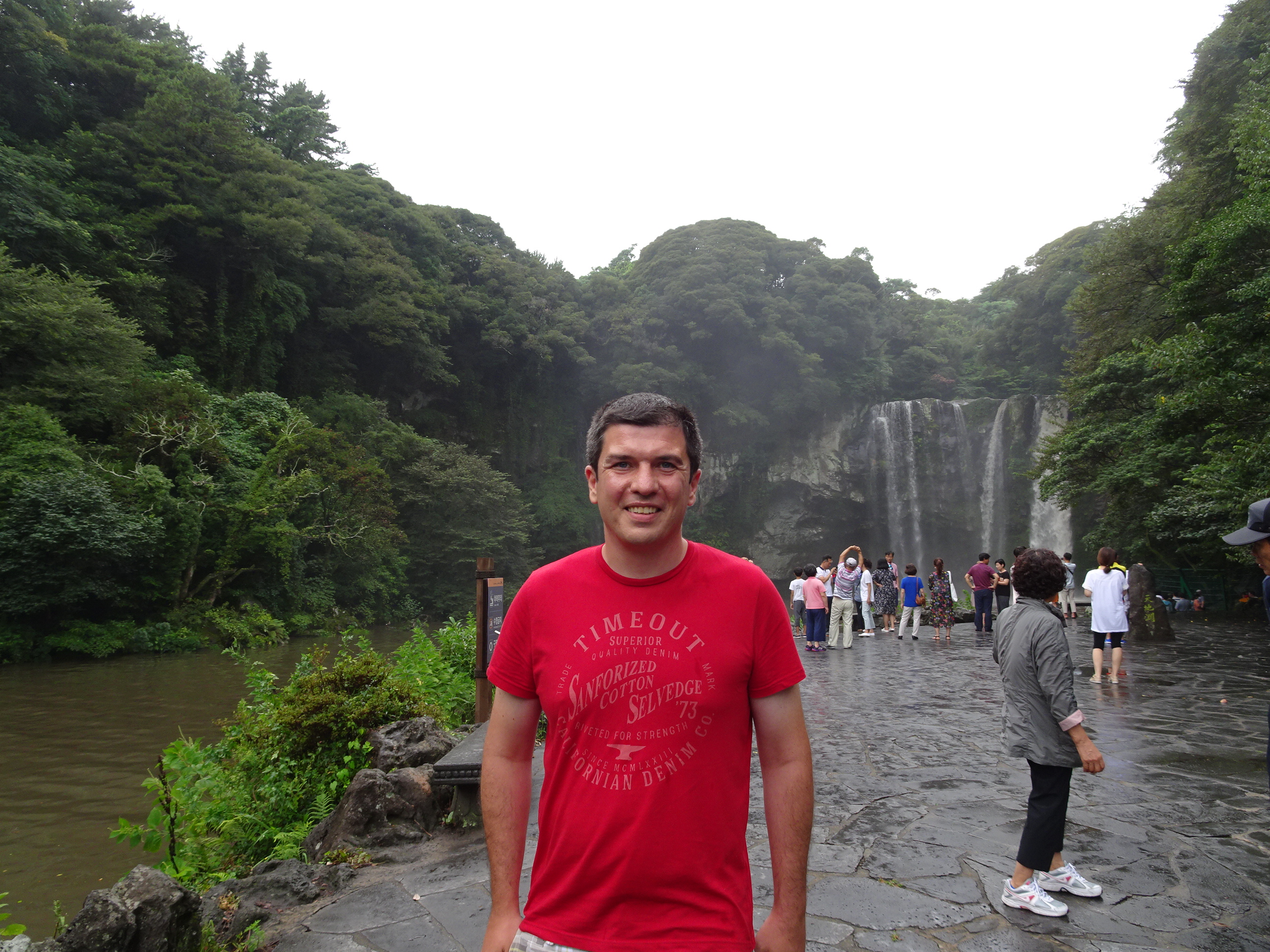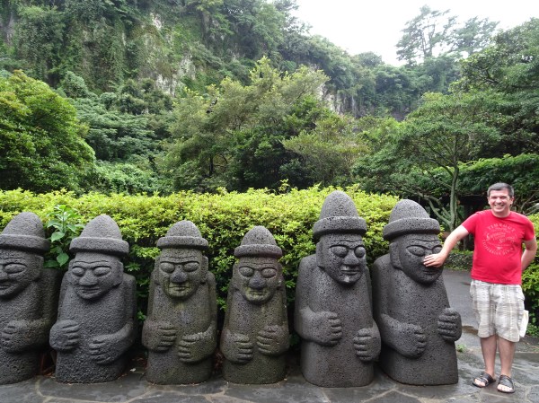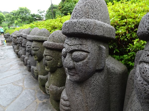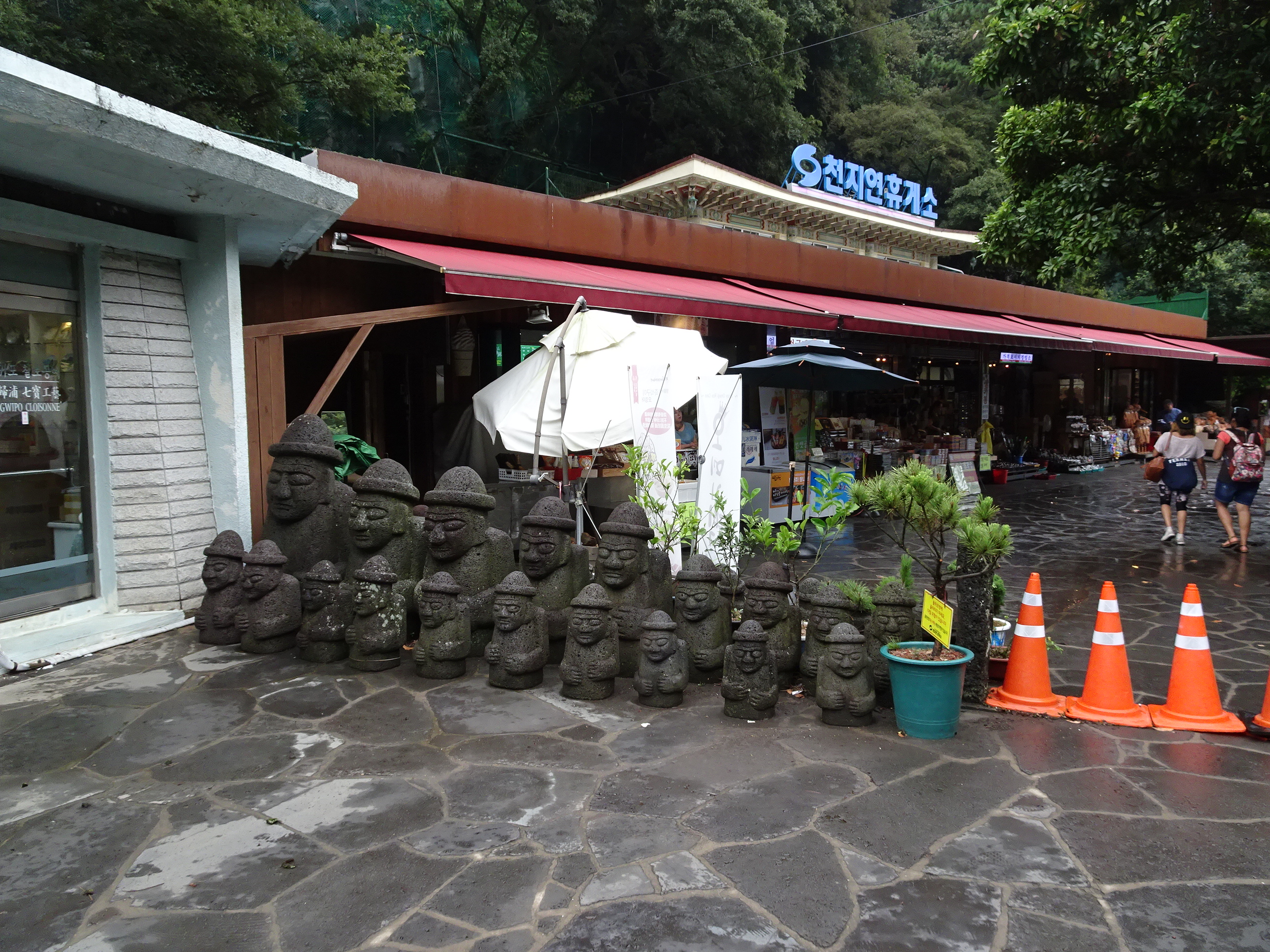Mai departe am trecut pe la cea mai mare cascadă din Jeju la Cheonjiyeon în apropiere de Jungmun. Pentru a ajunge la cascade se merge cam 15 minute printr-un parc cu o vegetație deosebită iar drumul este decorat cu sute de ‘bunicuți’ de Jeju. Acestea sunt niște statui specifice insulei care reprezintă persoane mai în vârsta; sunt un fel de a aduce omagiu strămoșilor. Bunicuții sunt foarte simpatici iar pentru noroc este musai să pui mâna pe nasul unuia. La finalul drumului am descoperit cascada Cheonjiyeon, al cărui nume înseamnă ‘Cerul unit cu pământul’ și într-adevăr impresia e că apa cade din ceruri. Cascada a fost și ultimul loc vizitat pe Jeju, iar după amiaza am revenit la hotel.