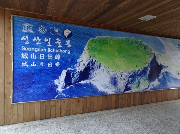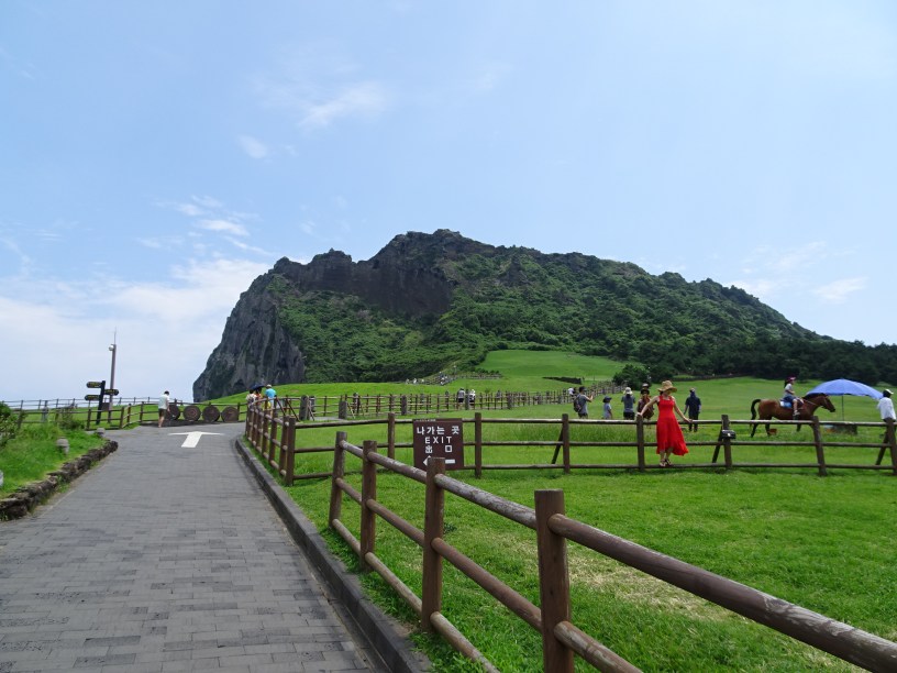 Primul loc unde am mers ziua următoare a fost vulcanul Seongsan Ilchulbong (sau Sunrise Peak). Este un vulcan mai aparte pentru că este înconjurat de mare fiind legat de pământ doar printr-un scurt braț iar craterul perfect rotund este acoperit de o vegetație deasă. Fiind pe malul estic din Jeju și deasupra mării, vulcanul este considerat unul dintre locurile ideale pentru a vedea răsăritul.