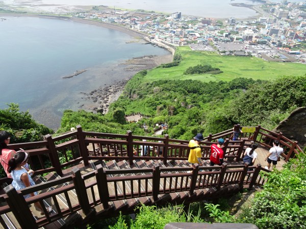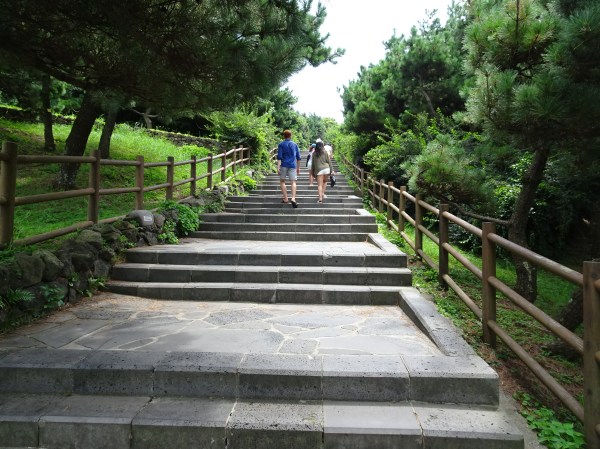 Noi nu am fost suficient de matinali pentru a merge acolo la răsărit. De-abia ce ne mai obișnuisem cu fusul orar cu 6 ore mai devreme. Pe la ora 10 am chemat un taxi la hotel și am plecat în direcția Seongsan. Drumul are vreo 40 de kilometri dar a durat aproape o oră pentru că traseul e plin de semafoare, treceri de pietoni și camere radar (nu zic că oricum coreenii nu ar depăși viteza legală). Am mers mai întâi la casa de bilete iar apoi am început urcarea spre vârf. Drumul durează 30-45 de minute în funcție de forma fizică a fiecăruia. Este amenajat cu poteci pietruite și scări dar pe alocuri este foarte abrupt.