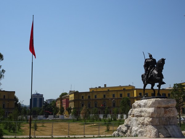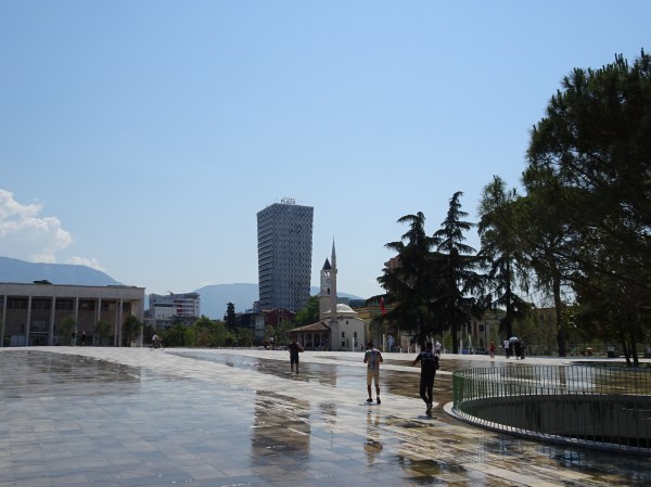 Primul loc vizitat la Tirana a fost piața Skanderbeg, una dintre cele mai mari ale Europei. Piața dreptunghiulară este înconjurată de câteva dintre cele mai importante clădiri ale orașului – Palatul de Cultura, Moschee Ethem Bey, Turnul cu ceas, Catedrala ortodoxă, Hotelul Tirana și Muzeul Combatanților – un important simbol din perioada comunistă. Gresia din piață încingea parcă și mai mult atmosfera iar localnicii se înghesuiau să găsească un traseu pe la umbra copacilor. Doar câțiva copii se jucau printre țâșnitoarele cu apă amenajate. Pe o latură a pieței domină statuia eroului național Skanderbeg alături de un drapel uriaș.