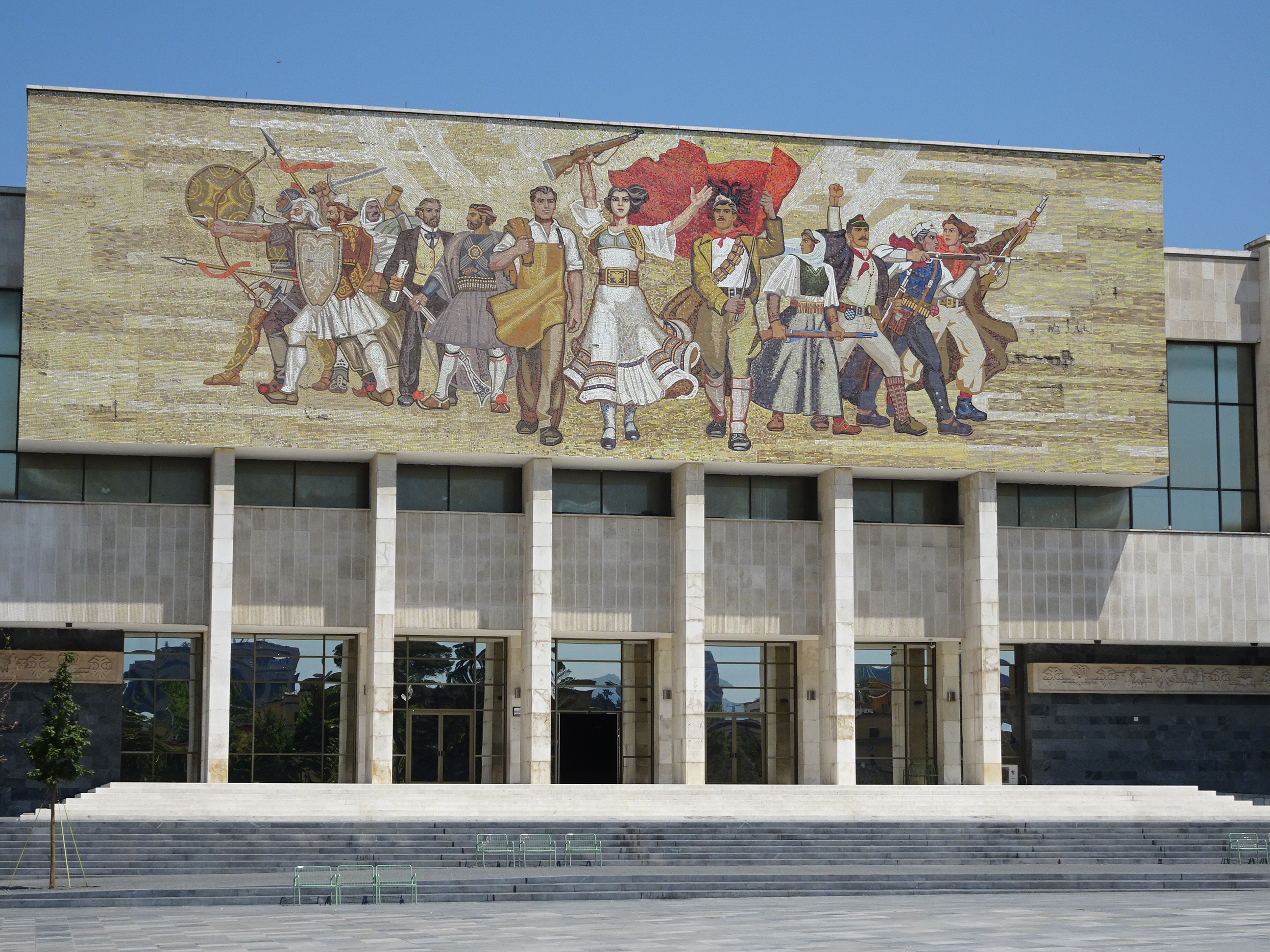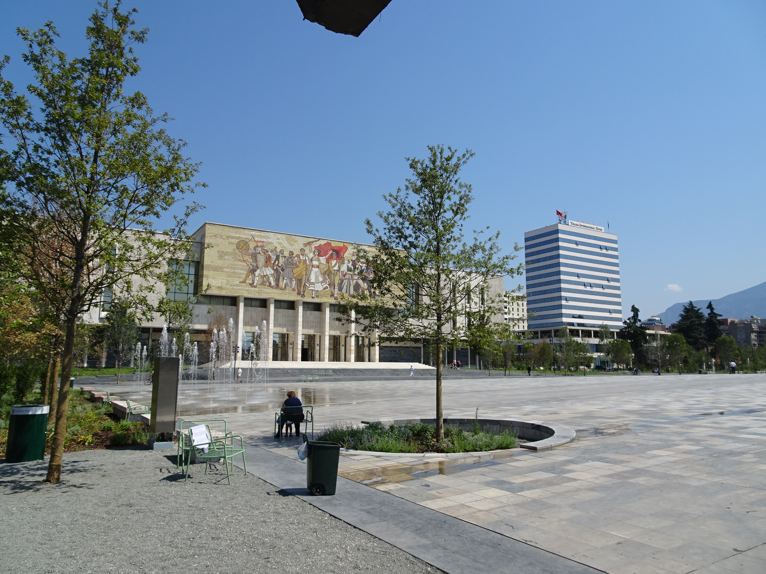 Primul loc vizitat la Tirana a fost piața Skanderbeg, una dintre cele mai mari ale Europei. Piața dreptunghiulară este înconjurată de câteva dintre cele mai importante clădiri ale orașului – Palatul de Cultura, Moschee Ethem Bey, Turnul cu ceas, Catedrala ortodoxă, Hotelul Tirana și Muzeul Combatanților – un important simbol din perioada comunistă. Gresia din piață încingea parcă și mai mult atmosfera iar localnicii se înghesuiau să găsească un traseu pe la umbra copacilor. Doar câțiva copii se jucau printre țâșnitoarele cu apă amenajate. Pe o latură a pieței domină statuia eroului național Skanderbeg alături de un drapel uriaș.