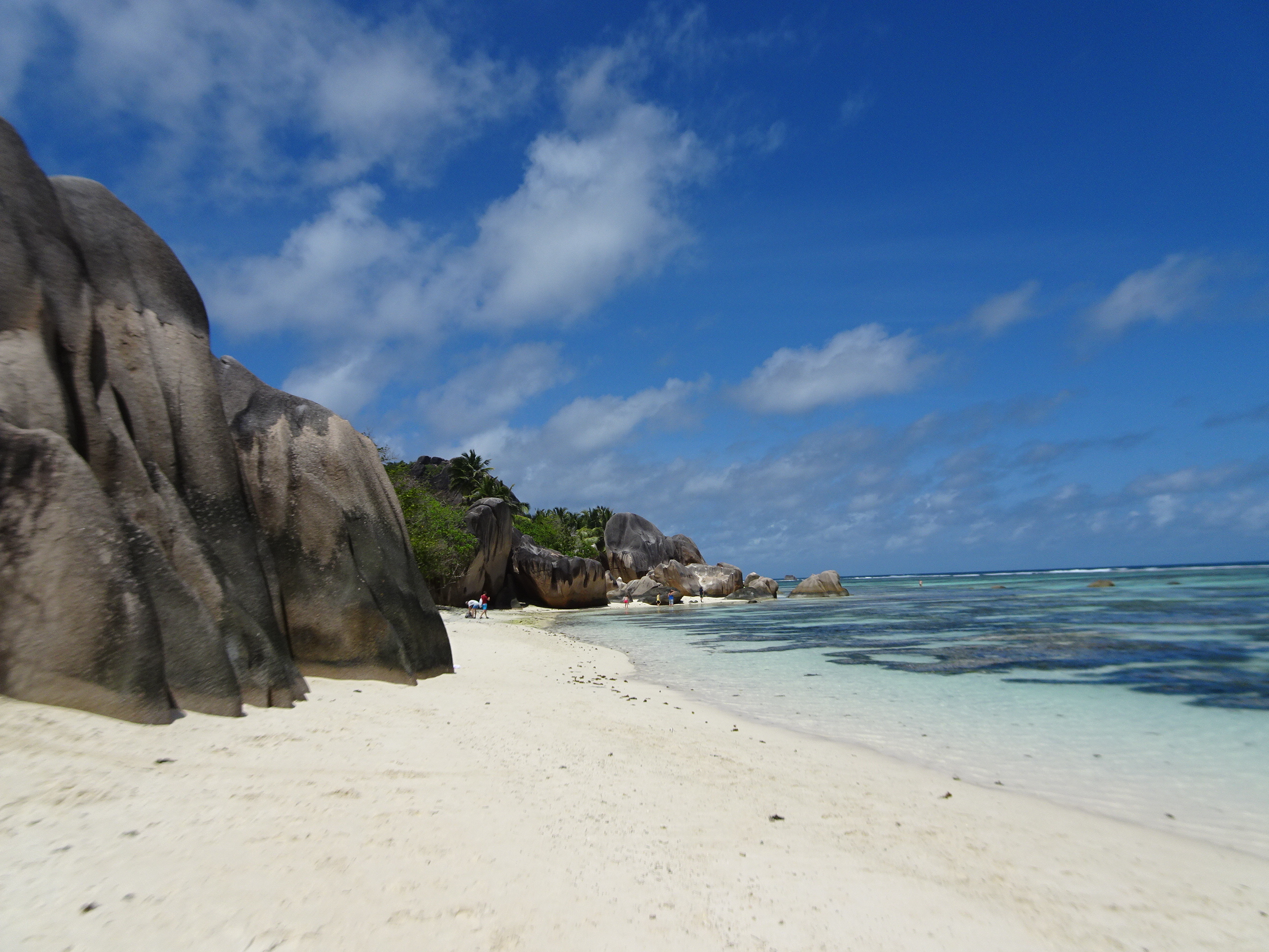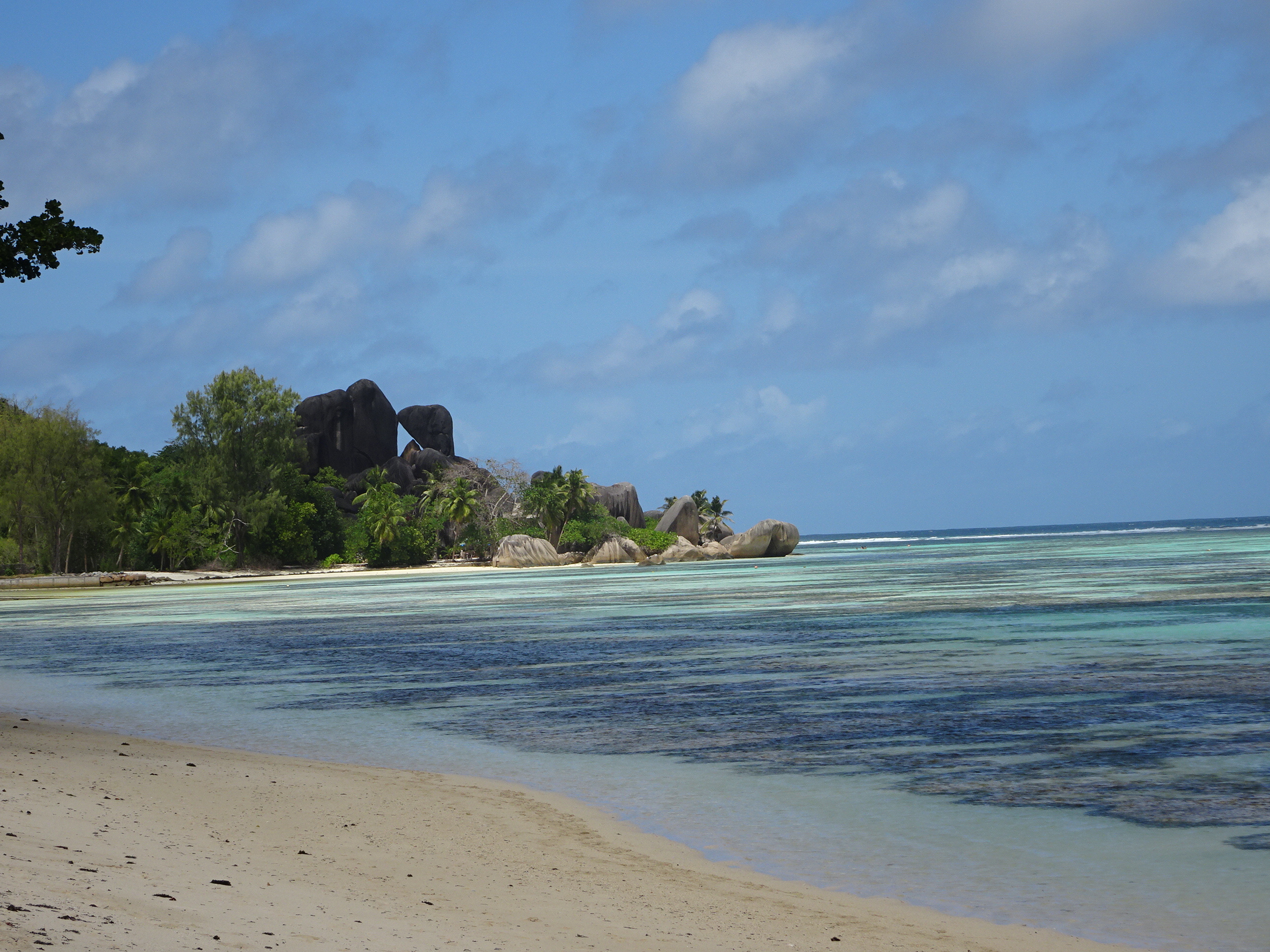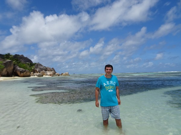 După turul pe domeniu am a ajuns în sfârșit la plajă. Anse Source d’Argent (sursă de bani) iți taie răsuflarea de la prima vedere. Apa are o culoare fantastică iar peisajul de la mal cu bolovani de granit uriași și un nisip alb ca făina este unic. Ne-am așezat pe plajă și am mers direct în apă. Source d’Argent este practic un atol protejat de o barieră de corali aflată cam la un kilometru de mal. Datorită barierei valurile sunt inexistente. Apa se adâncește extrem de lin, trebuind să mergi minute bune pentru a fi acoperit măcar până la brâu. Nu e cel mai grozav loc pentru înotat, dar imaginile sunt fantastice. Am văzut în apă mii de pești colorați inclusiv câțiva mari, care de-abia i-am cuprins în brate. Peștii stau aproape și nu fug și te poți chiar juca cu ei. Cel mai frumos e să te așezi în fund în apă și te uiți în jur cum zeci de pești colorați te înconjoară.