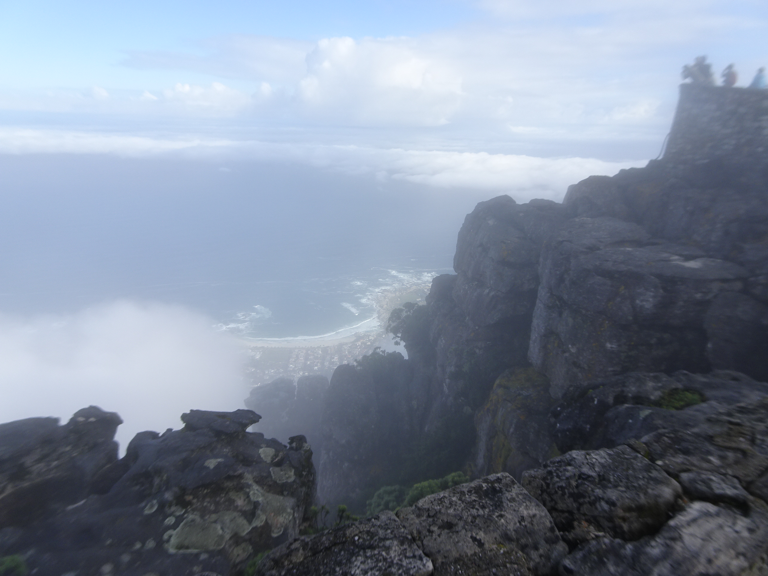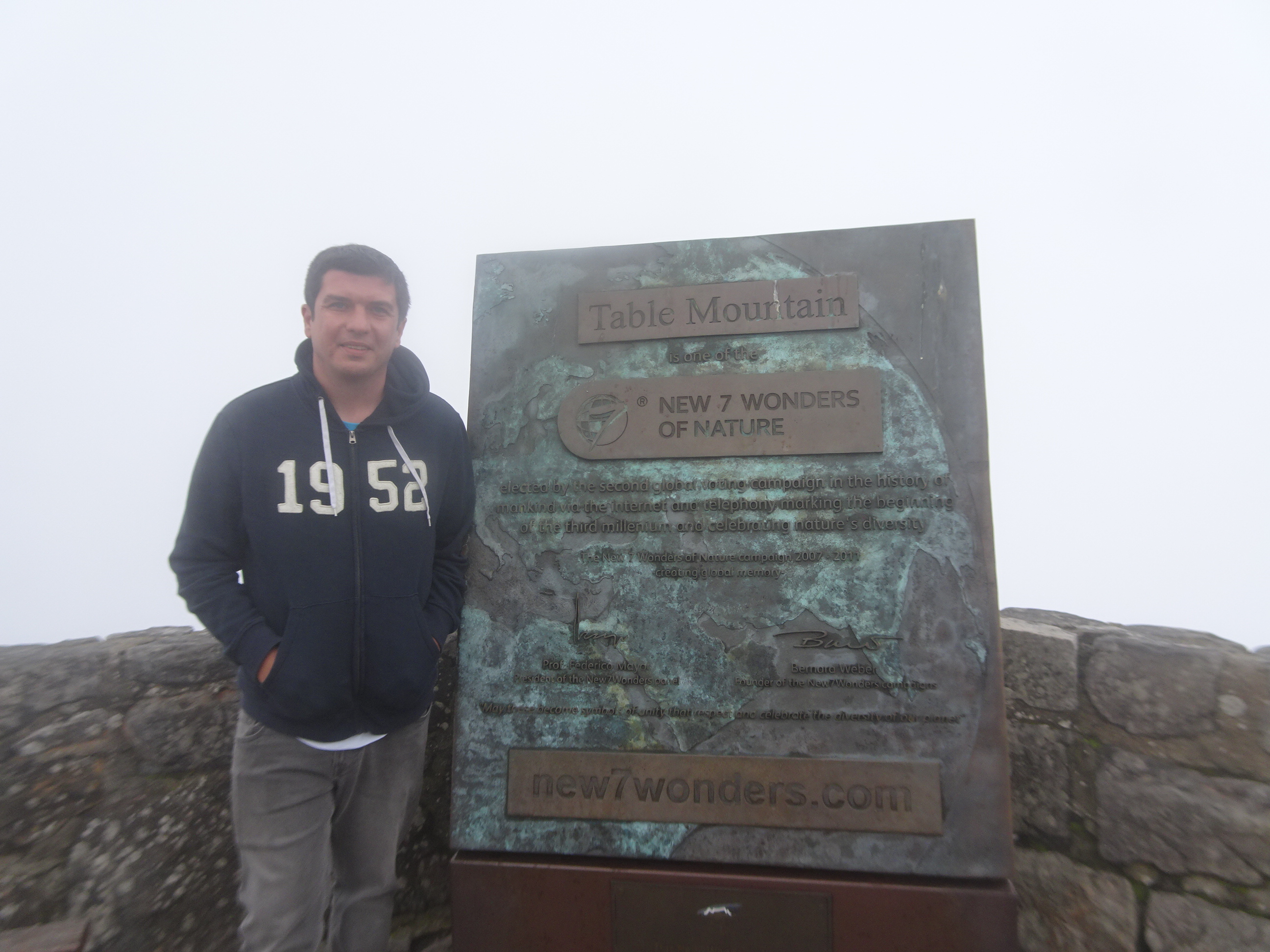 Ne-am dorit mult să urcăm pe Table Mountain, dar vremea înnorată nu prea ne-a ajutat. Într-o dimineață mai senină ne-am decis totuși să urcăm pe munte. Am luat mașina până la baza muntelui (la scurtă distanță de Camps Bay) iar de acolo am urcat cu telecabina spre vârf. Din păcate în vârf am găsit un frig pătrunzător și o ceață densă. Am petrecut mai mult timp pe la cafenea și pe la magazinul cu suveniruri unde era cald. Înainte de a reveni la telecabină am avut norocul ca pentru câteva secunde ceața să dispară și să putem vedea priveliștea minunată peste Cape Town, Camps Bay și vârful Lion’s Head din apropiere. Table Mountain este una din cele 7 minuni naturale ale lumii, iar vederea de sus este absolut fantastică, atât timp cât muntele nu este acoperit de nori.