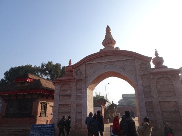 Primul loc unde am mers a fost Bhaktapur aflat la 20 de kilometri est de capitală. Drumul cu mașina a durat aproape o oră prin traficul haotic din zonă, dar din fericire am avut un șofer bun vorbitor de engleză cu care am putut avea o conversație plăcută. Am parcat mașina aproape de centrul vechi din Bhaktapur de unde am luat-o la pas. Pentru a intra în zona turistică ca străin a trebuit să plătesc o taxă de 15 dolari. Era ianuarie (adică cea mai rece lună a anului în Nepal) dar temperaturile erau ideale pentru plimbare cu maxime în jur de 20-24 de grade și mult soare.