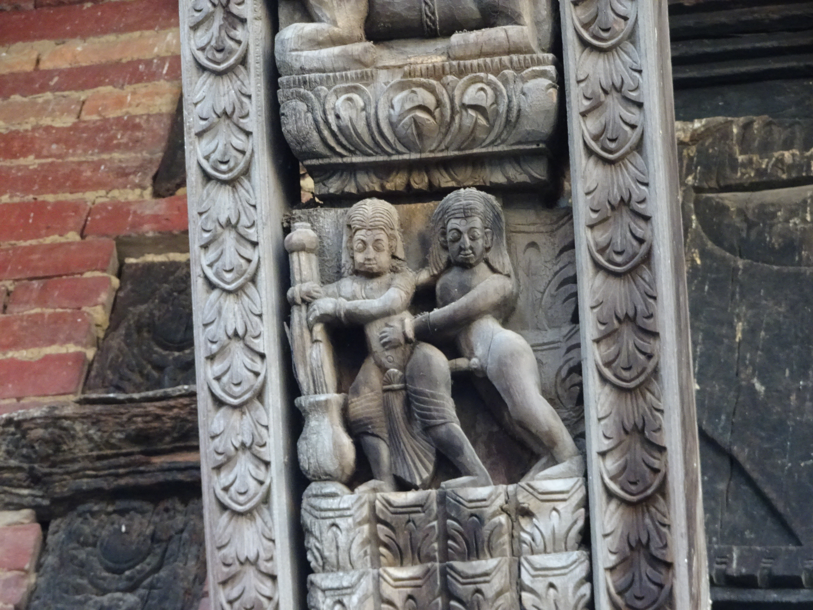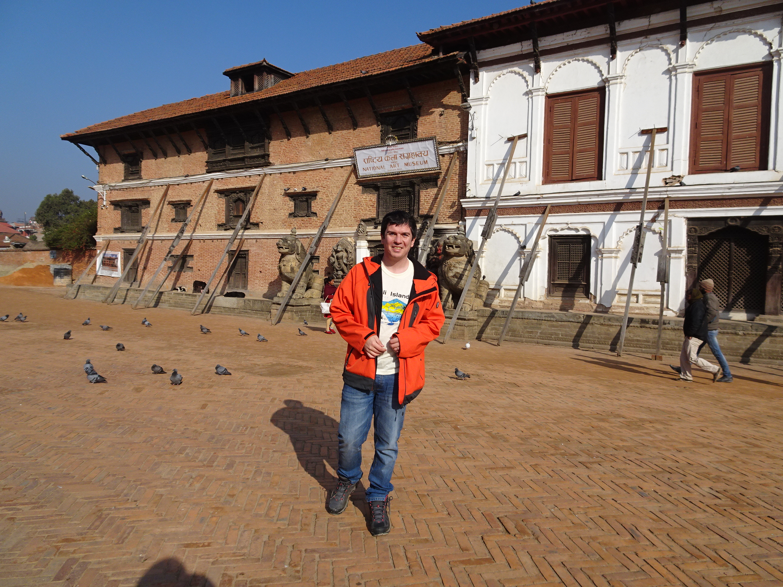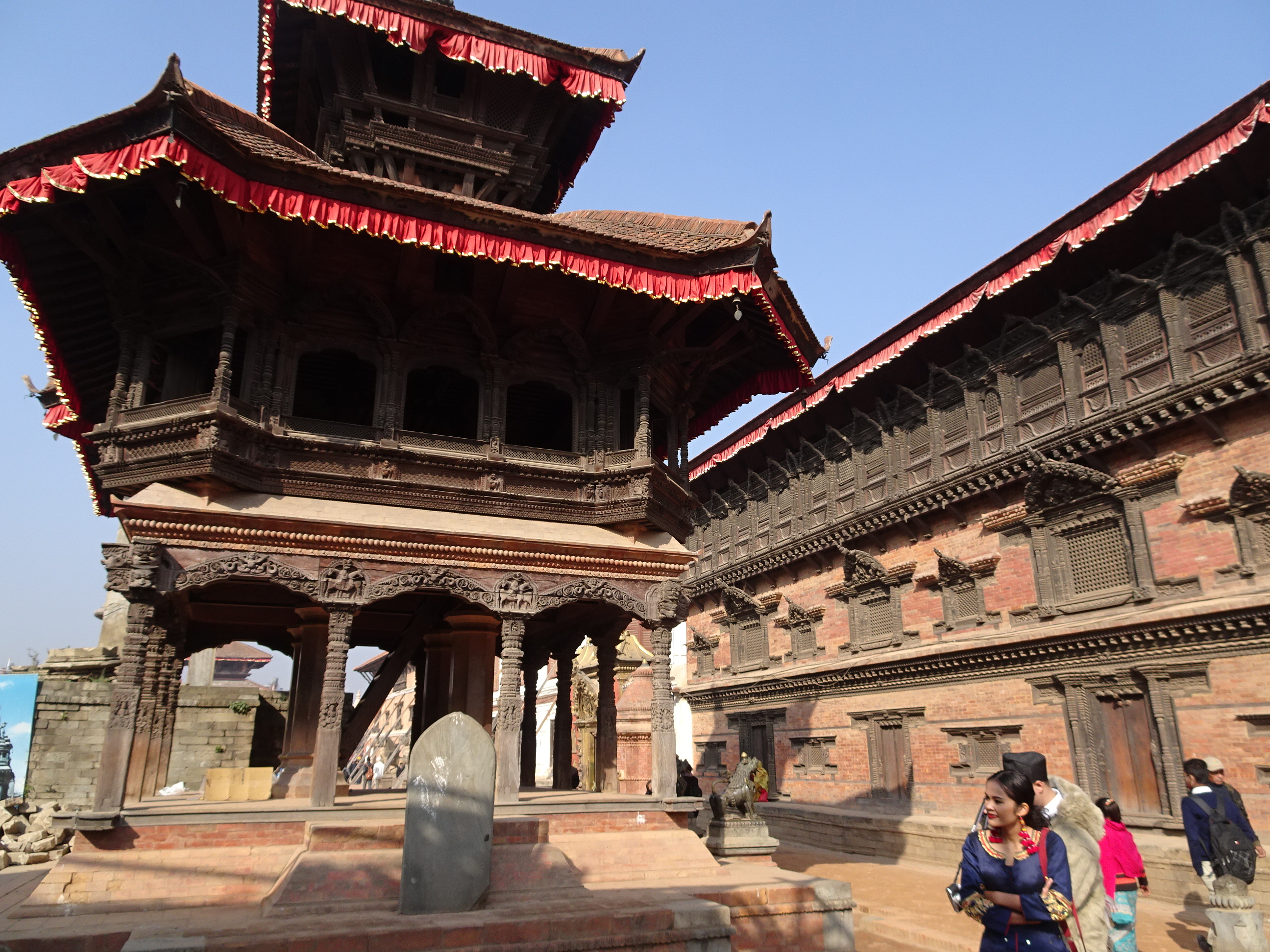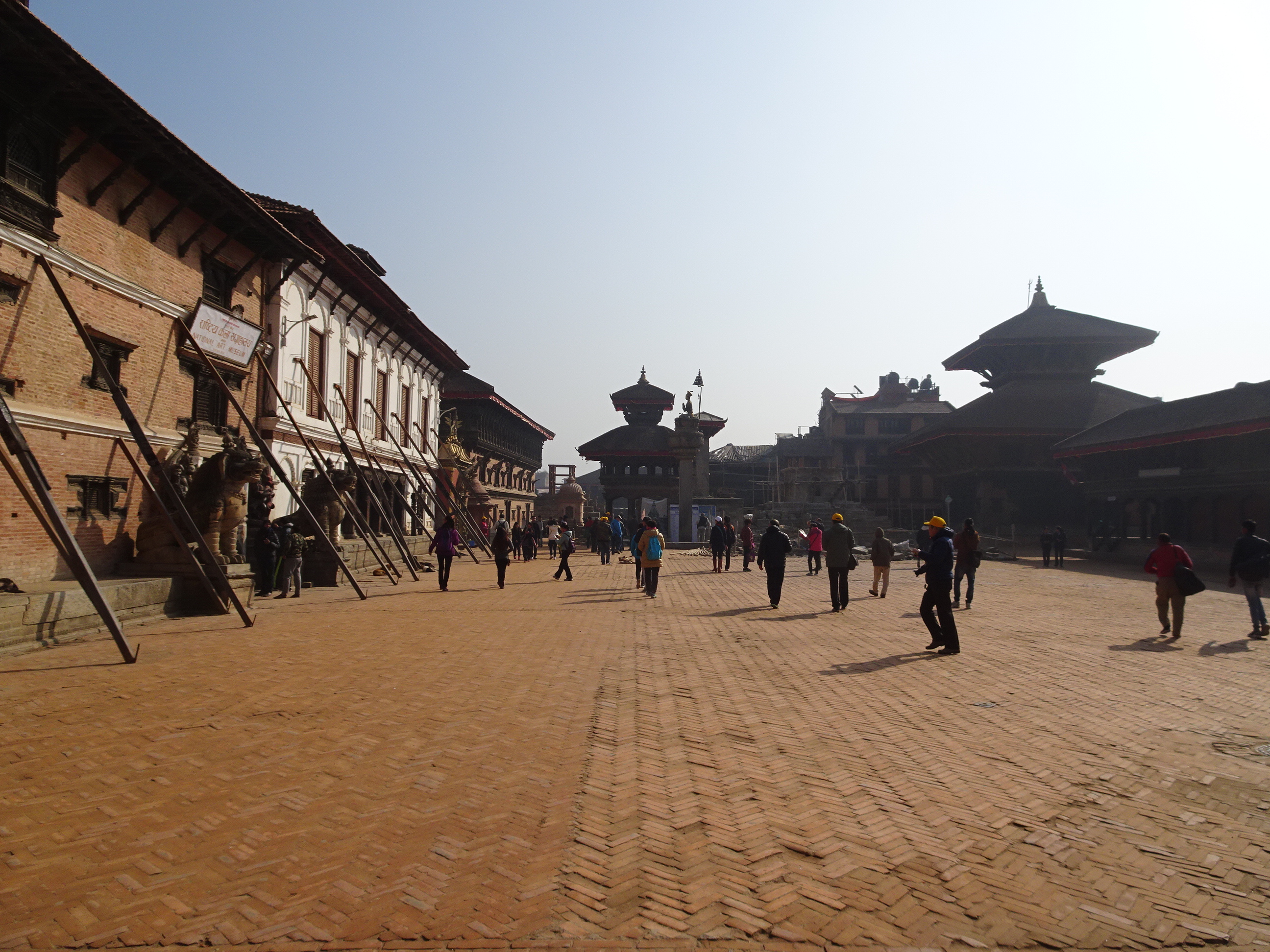 Am mers mai întâi în marea Durbar Square unde se află palatul regal, muzeul de istorie și mai multe temple. Multe dintre construcțiile vechi din cărămidă sunt încă în reconstrucție iar altele se sprijină în piloni de lemn ca să nu cadă. Se păstrează totuși bine frumusețea fațadelor și sculpturilor în lemn. Cele mai frumoase clădiri sunt templul Taleju cu a sa poartă aurită, templul Dattatreya ornat cu sculpturi cu teme sexuale din Kamasutra și palatul cu 55 de ferestre unde cândva locuiau regii nepalezi.