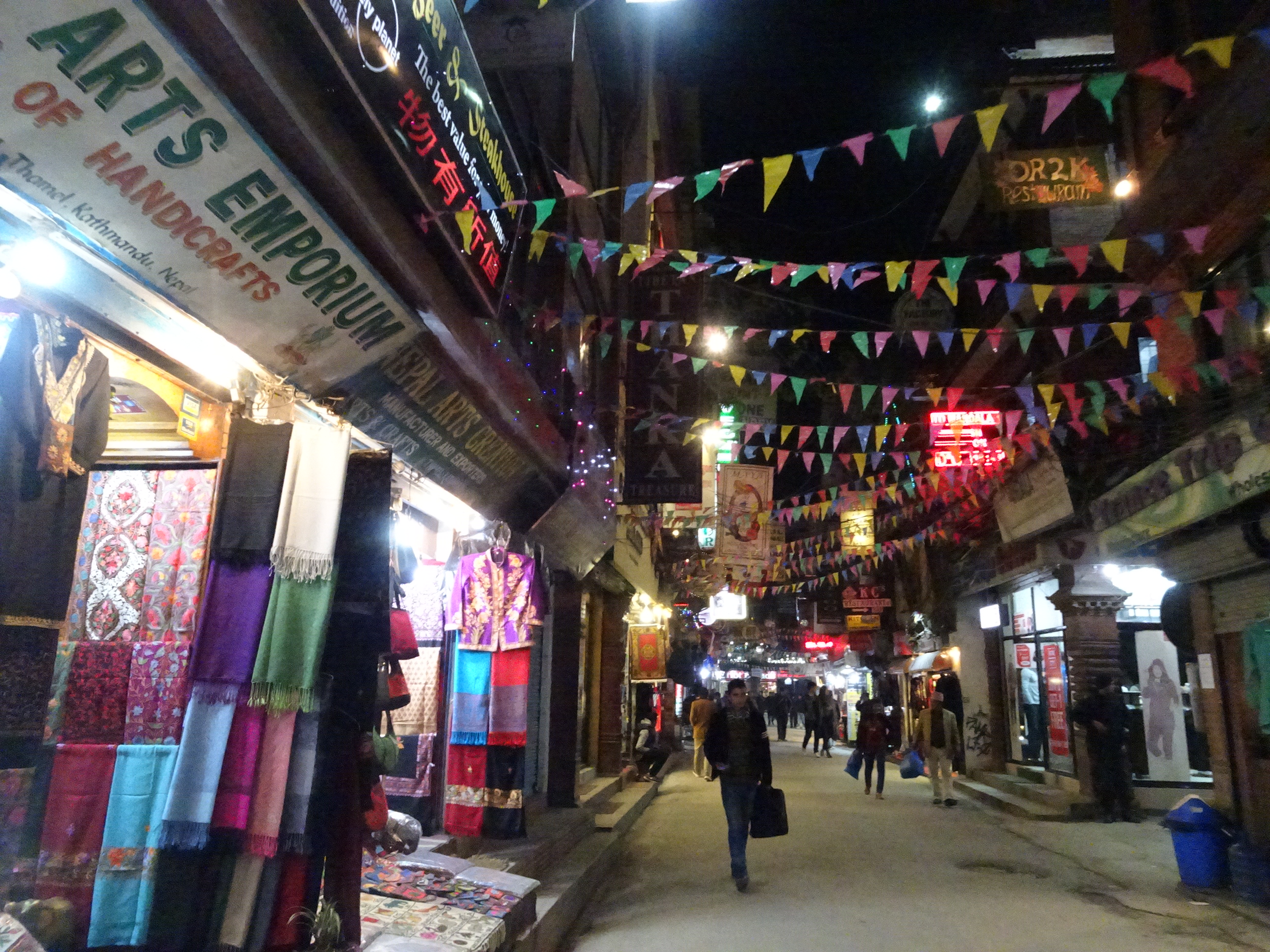 Seara am dat o tură prin Thamel. Zona este plină de magazine de suveniruri și restaurante destinate turiștilor. Sunt cel mult 4-5 restaurante „de lux” unde se poate mânca sigur (adică curat și bun). Acestea sunt și cele mai scumpe din oraș, iar preturile sunt egale cu un restaurant mediu din București. În general prețurile sunt foarte foarte mici, m-am convins de asta și prin magazinele de suveniruri. Totul se negociază și se pot găsi pe lângă multe chinezării lucruri de calitate (mătăsuri, lână, sculpturi din lemn etc) mai ieftin decât am văzut oriunde prin lume. Seara după o masă bună (evident cu curry) am revenit la hotel pregătit de turul ce urma dimineața.