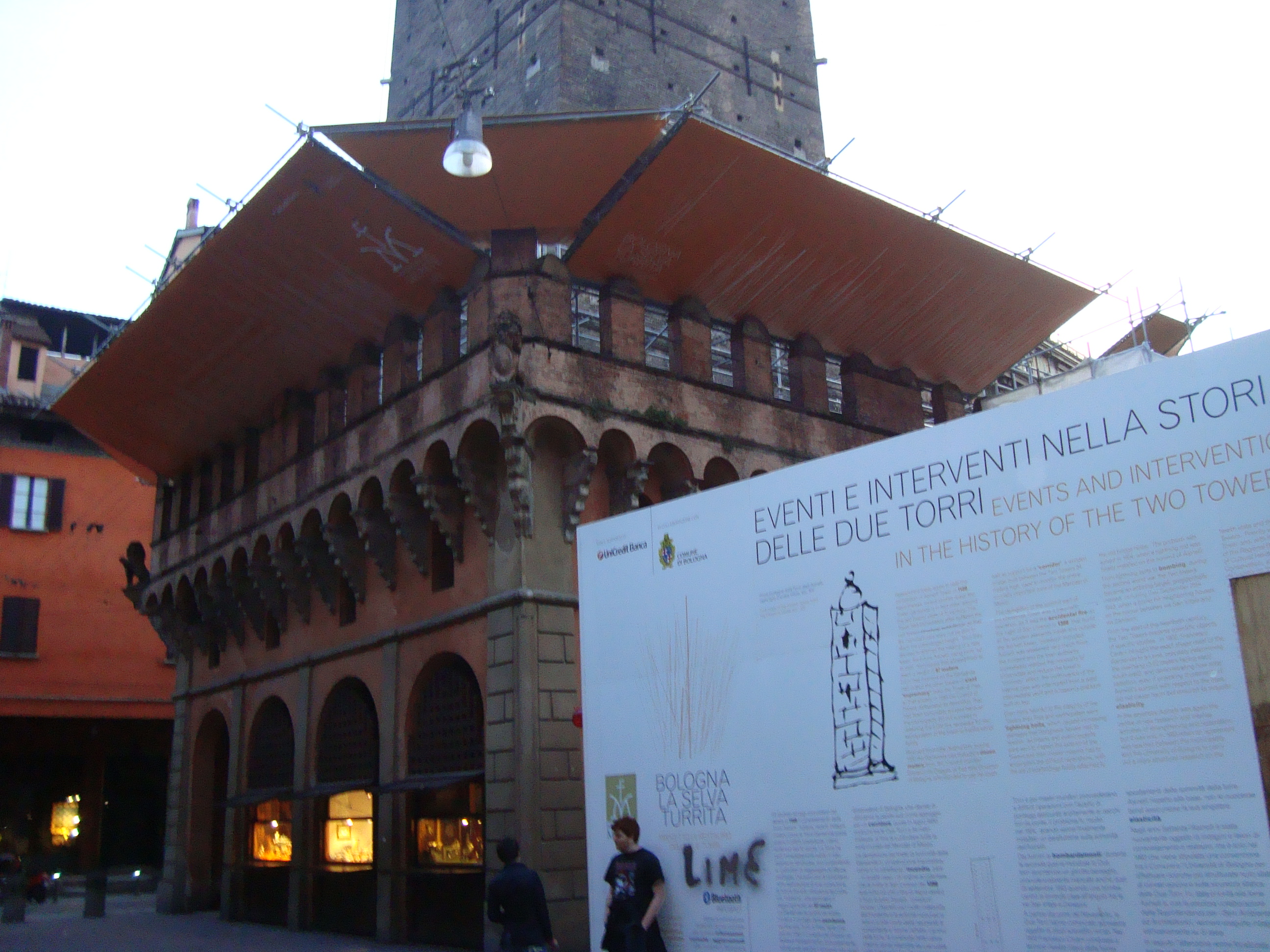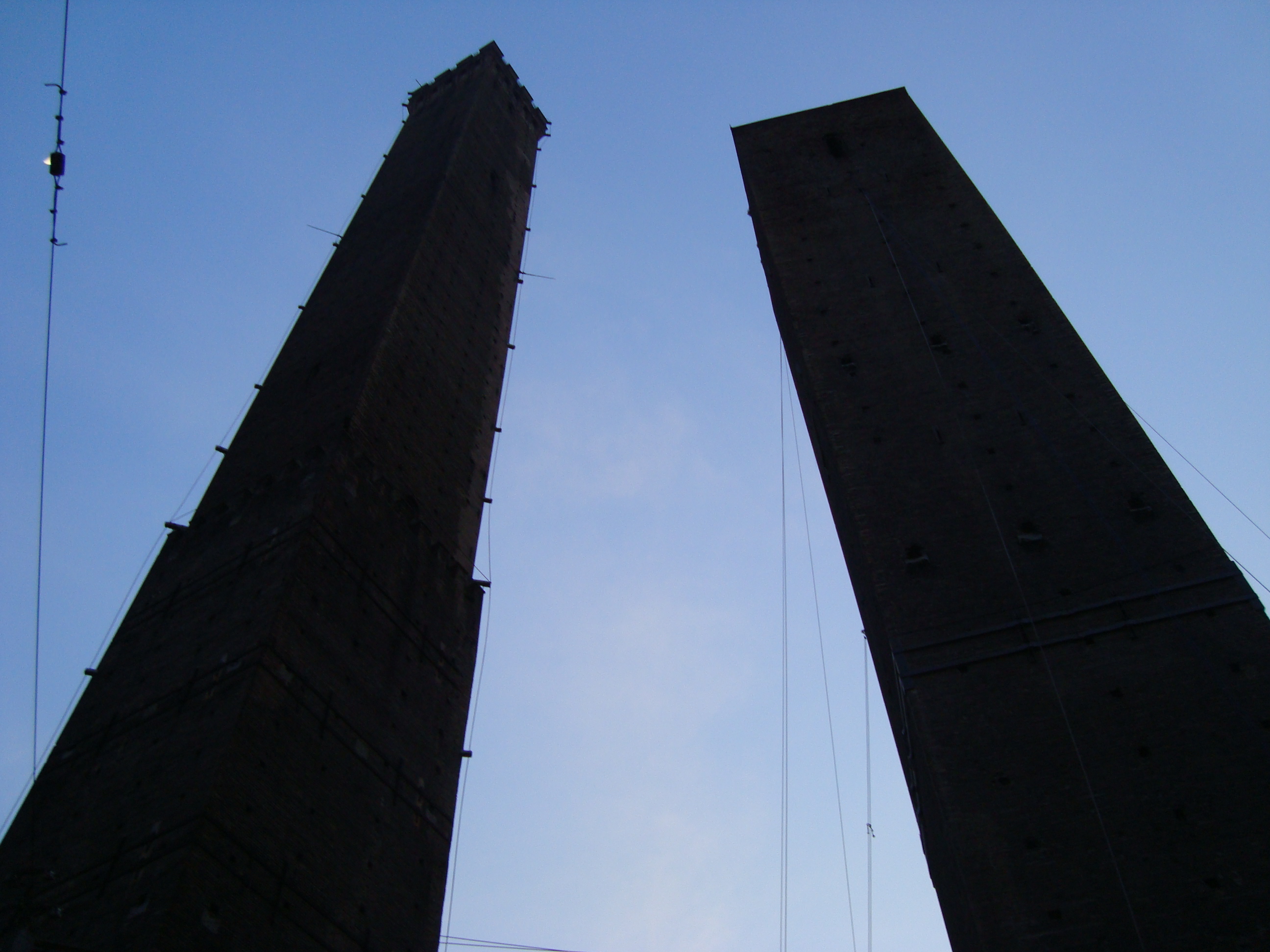 Un alt loc interesant aflat puțin mai departe de piață este la Due Torri. Este vorba de două turnuri înalte din cărămidă unul lângă altul care ajung la 50 de metri înălțime. Sunt peste 20 de astfel de turnuri prin Bologna și se spune că în evul mediu erau peste 180 – un fel de New York al zilelor noastre. Motivul construcției lor era de apărare dar era și un semn de bogăție al familiilor care dețineau un turn cât mai înalt. Due Torri sunt cele mai înalte și datează încă de la finalul secolului 11. Când am vizitat noi erau degradate și începuse renovarea lor, accesul nefiind permis dar astăzi se pot vizita din nou.